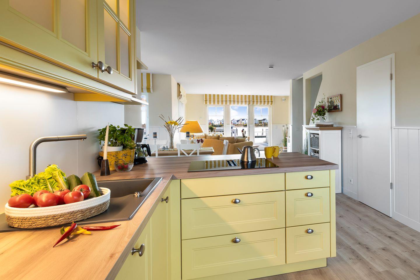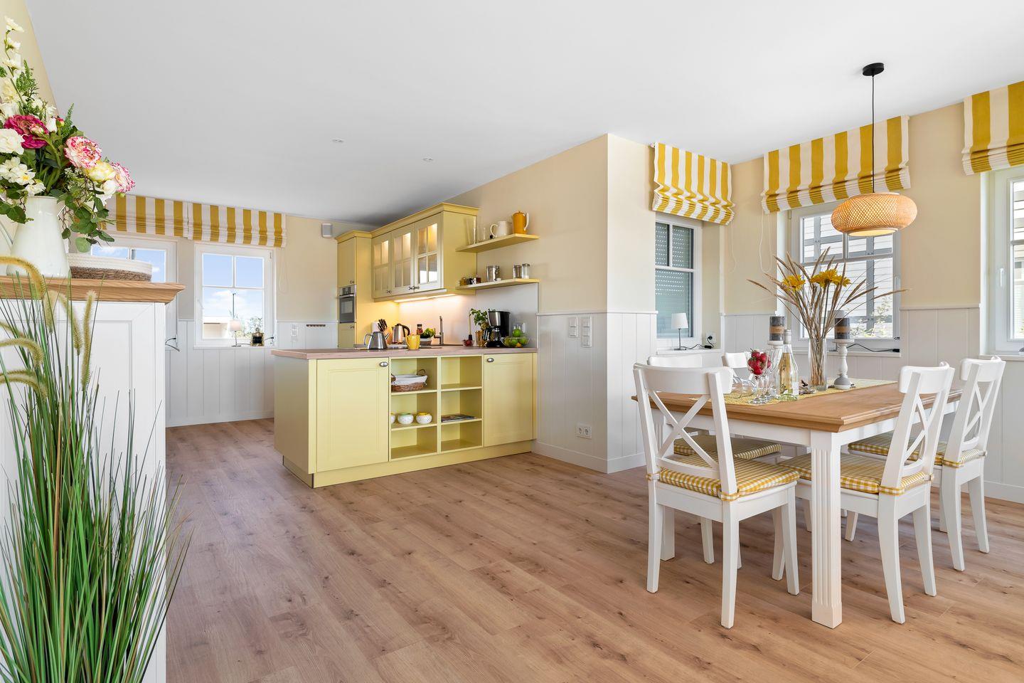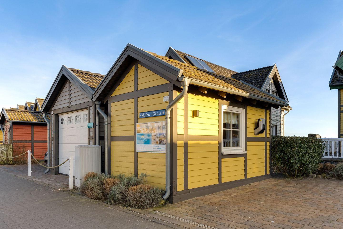 Das Ferienhaus „Hafenglück" im Ostseeresort Olpenitz bietet mit seiner sonnigen, gelben Fassade einen einladenden Anblick. Die Wohnfläche beträgt circa 130 Quadratmeter. Das Interieur ist in warmen Gelbtönen gehalten und bietet Platz für bis zu vier Personen.