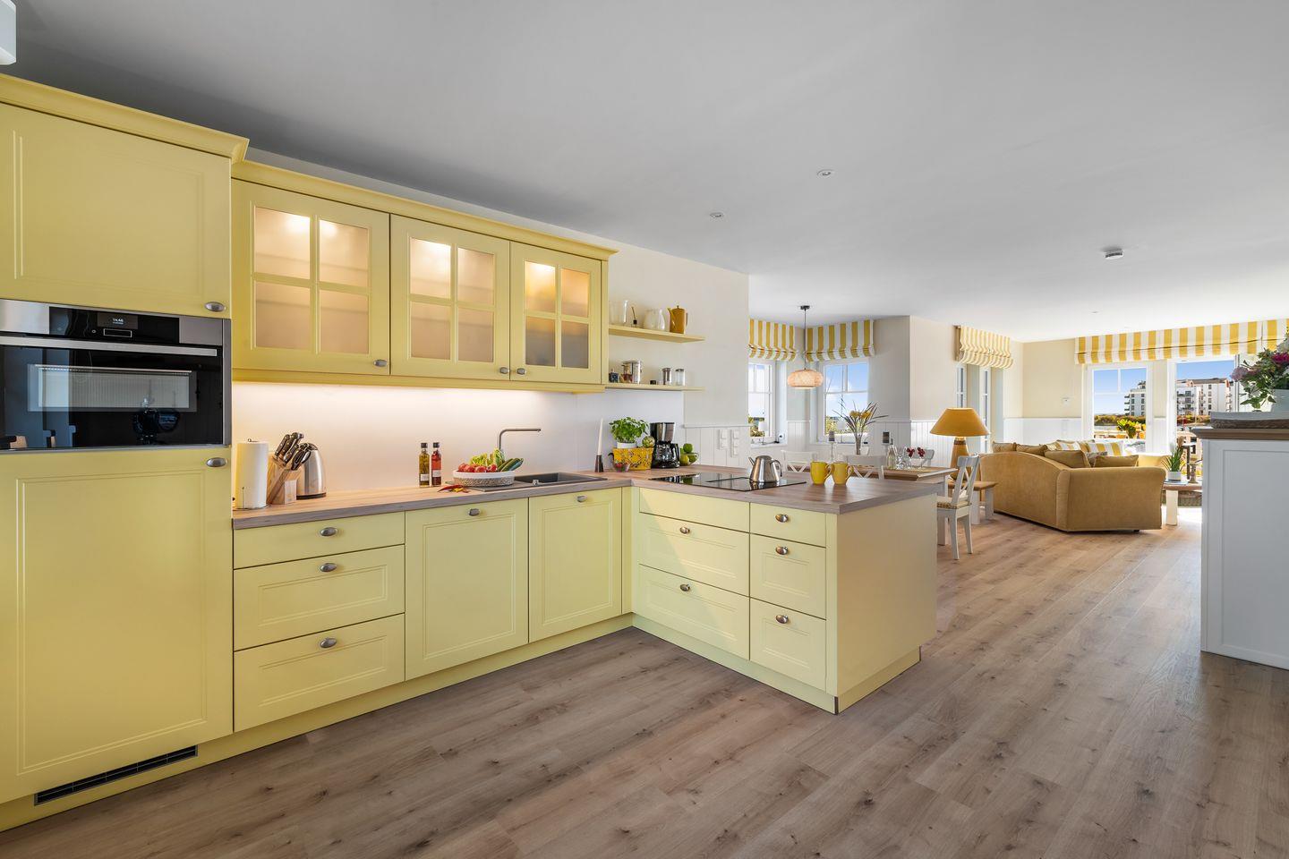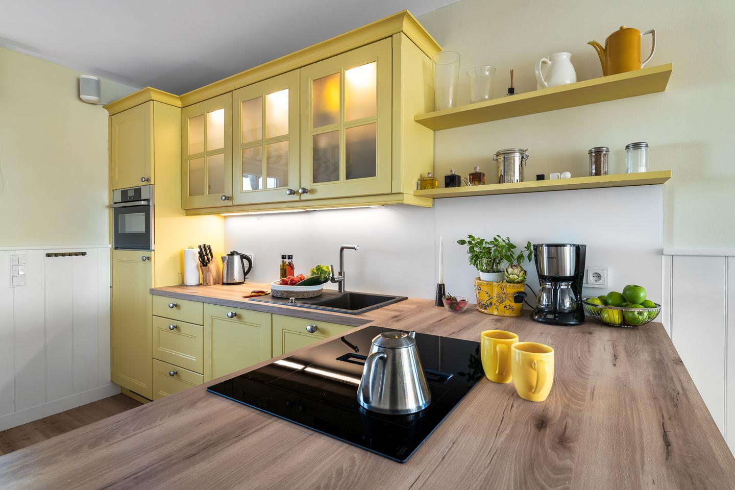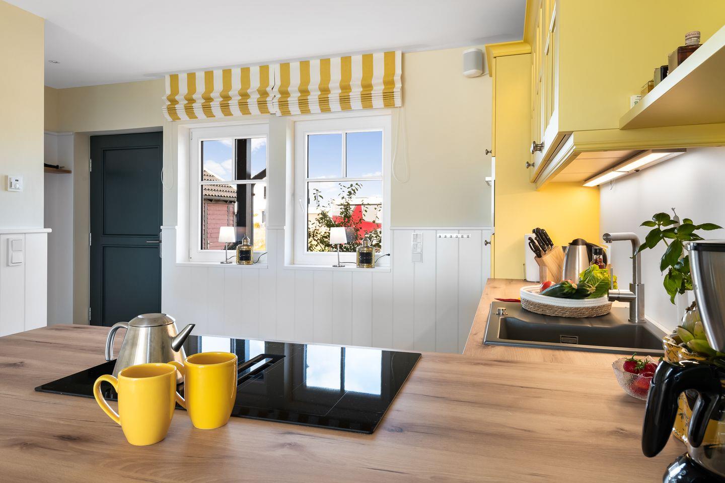 Das Ferienhaus „Hafenglück" im Ostseeresort Olpenitz bietet mit seiner sonnigen, gelben Fassade einen einladenden Anblick. Die Wohnfläche beträgt circa 130 Quadratmeter. Das Interieur ist in warmen Gelbtönen gehalten und bietet Platz für bis zu vier Personen.