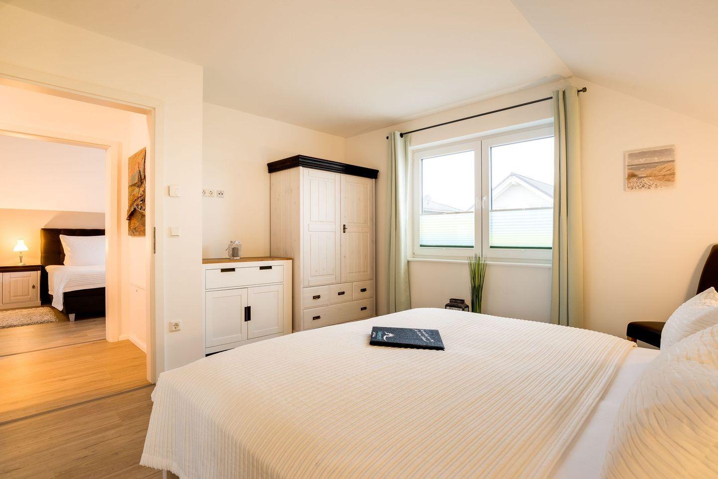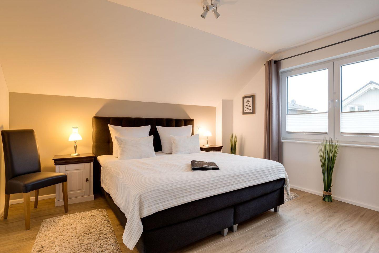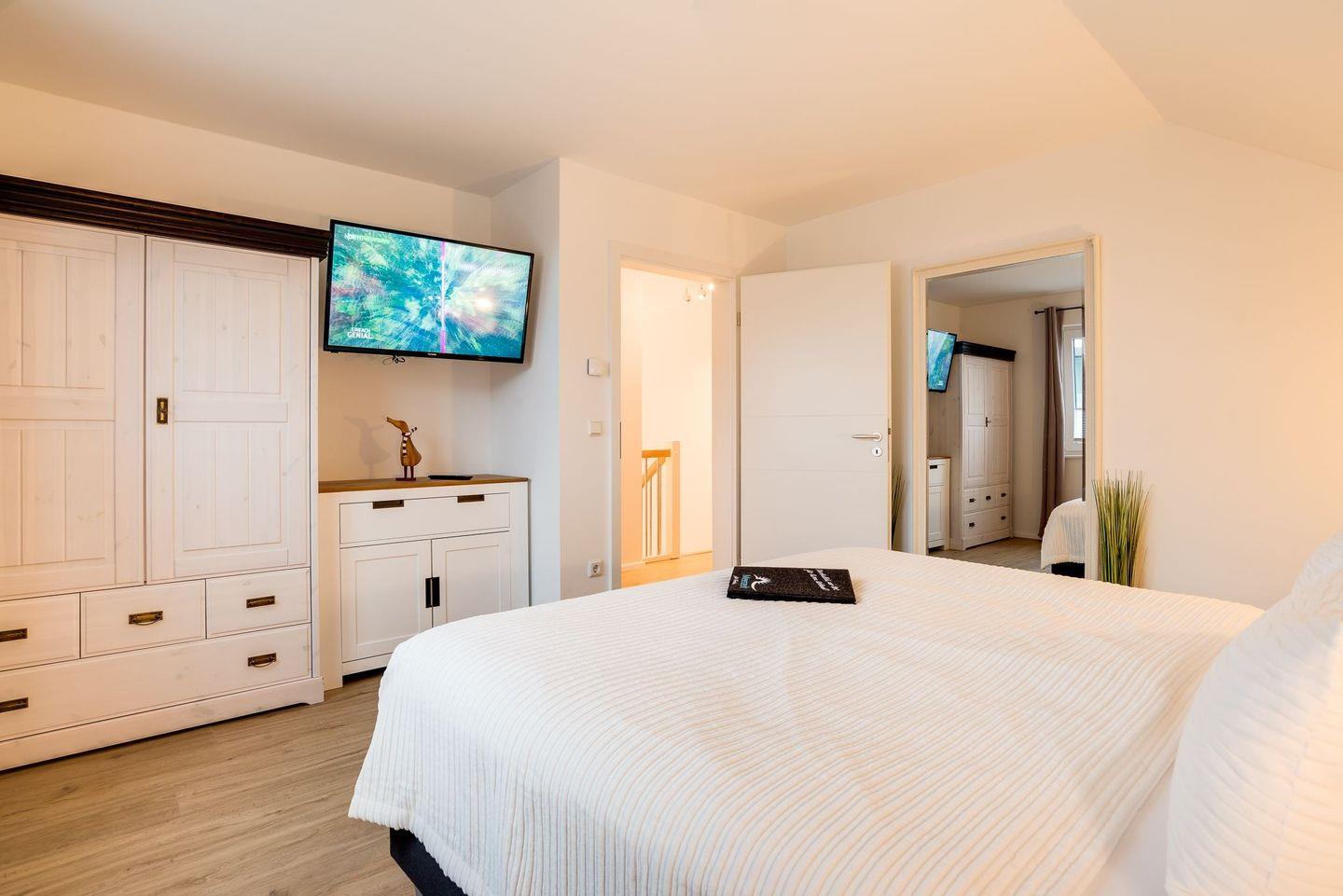 Das Ferienhaus "StrandLiebe" verfügt über drei gemütliche Schlafzimmer im Obergeschoss, alle ausgestattet mit großen Doppelbetten, Kleiderschränken und Smart-TVs. Das geräumige Badezimmer bietet Ihnen eine große Badewanne mit Meerblick, eine Regendusche und eine große finnische Sauna (ebenfalls mit Blick auf die Ostsee) – perfekt für einen erholsamen Urlaub zu jeder Jahreszeit.