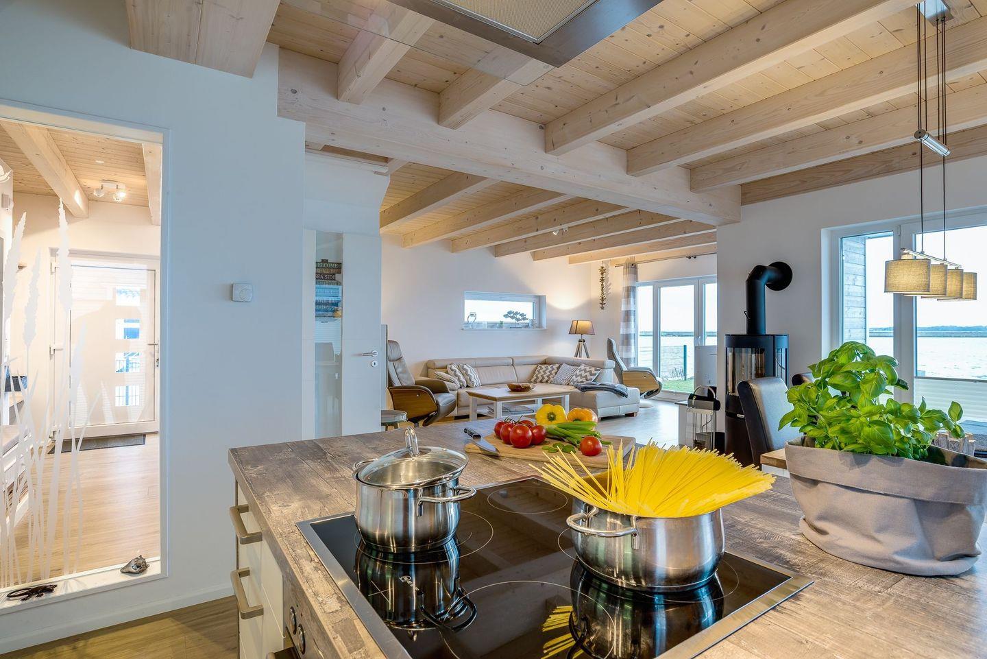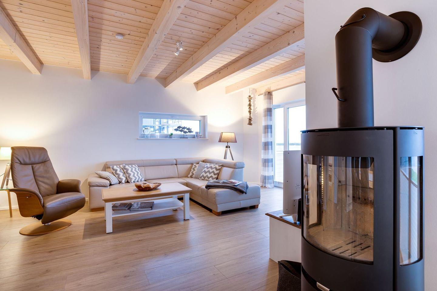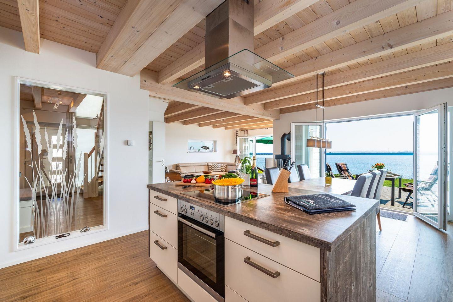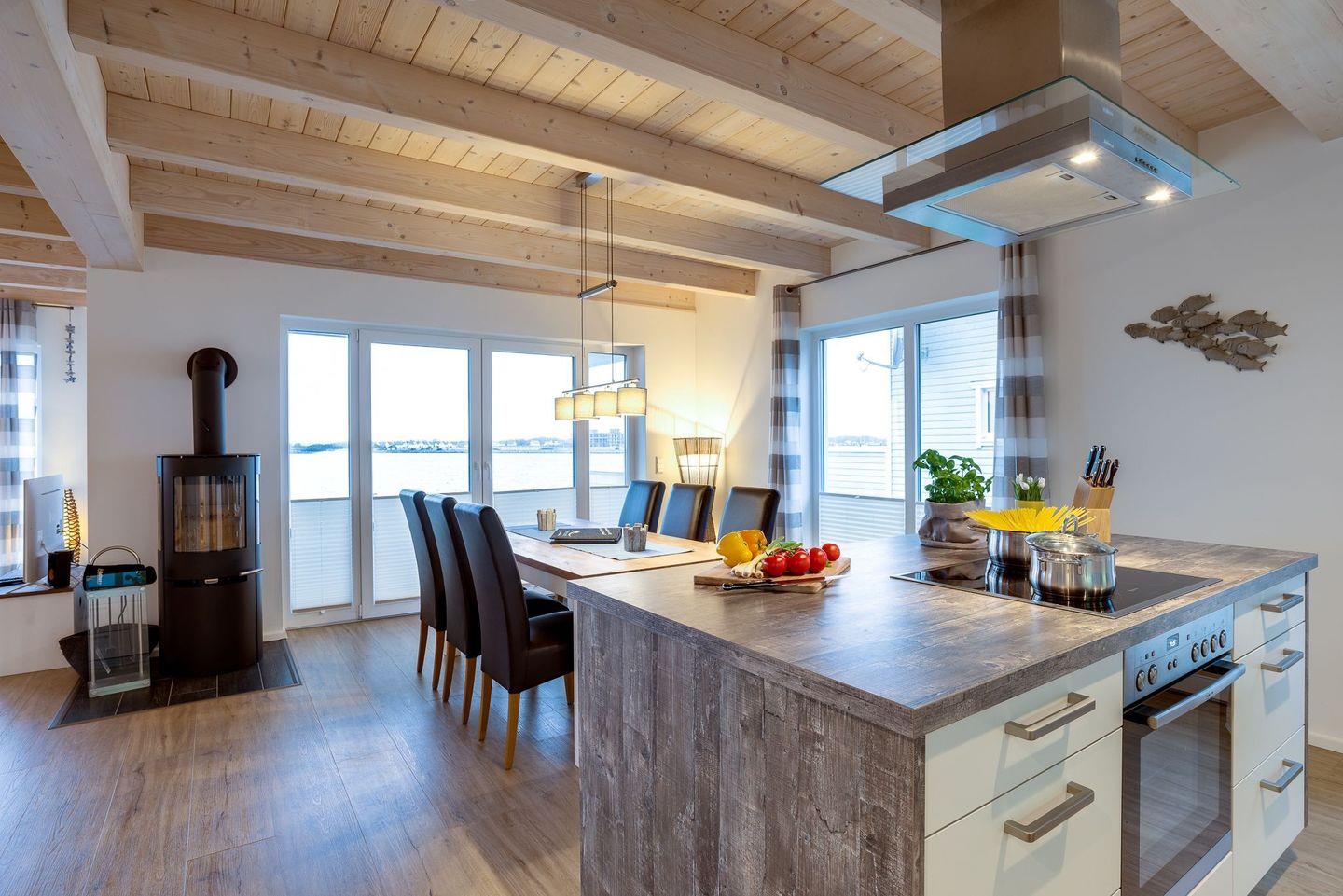Im Erdgeschoss finden Sie den großen Wohn- und Essbereich mit voll ausgestatteter Küche und einer großen Kochinsel. Der runde Kaminofen verleiht dem Raum eine gemütliche Atmosphäre und bietet an kälteren Tagen eine angenehme Wärme. Draußen erweitert eine direkt am Wasser gelegene Terrasse mit komfortablen Gartenmöbeln und Grill die Wohnfläche ins Freie.