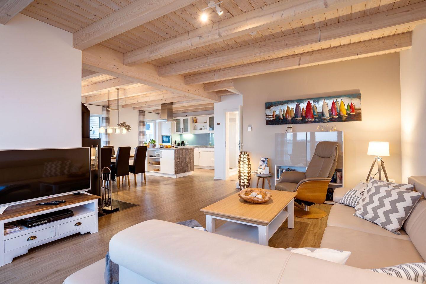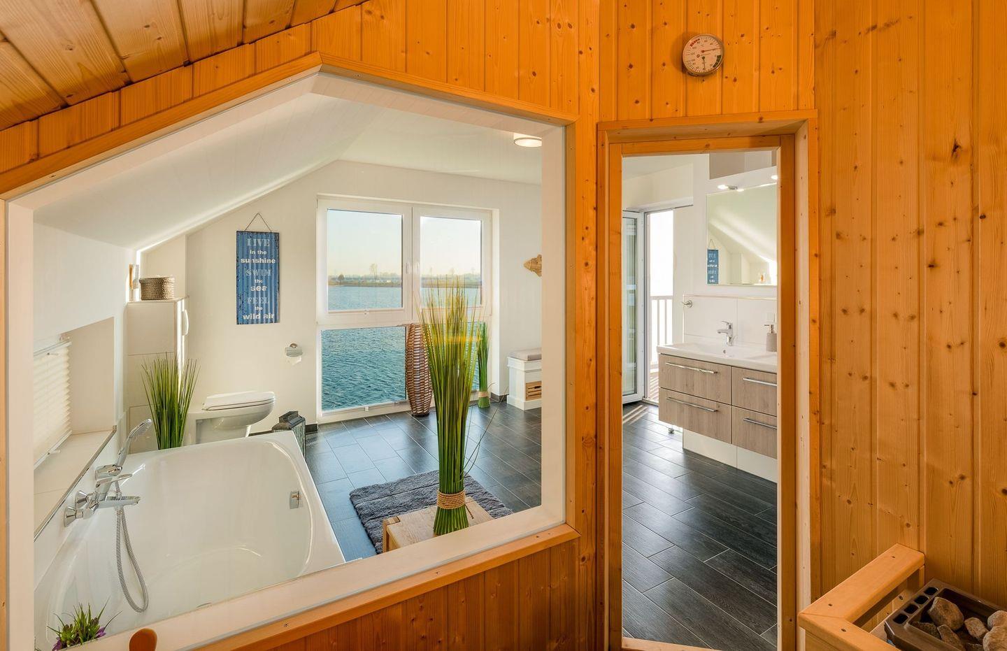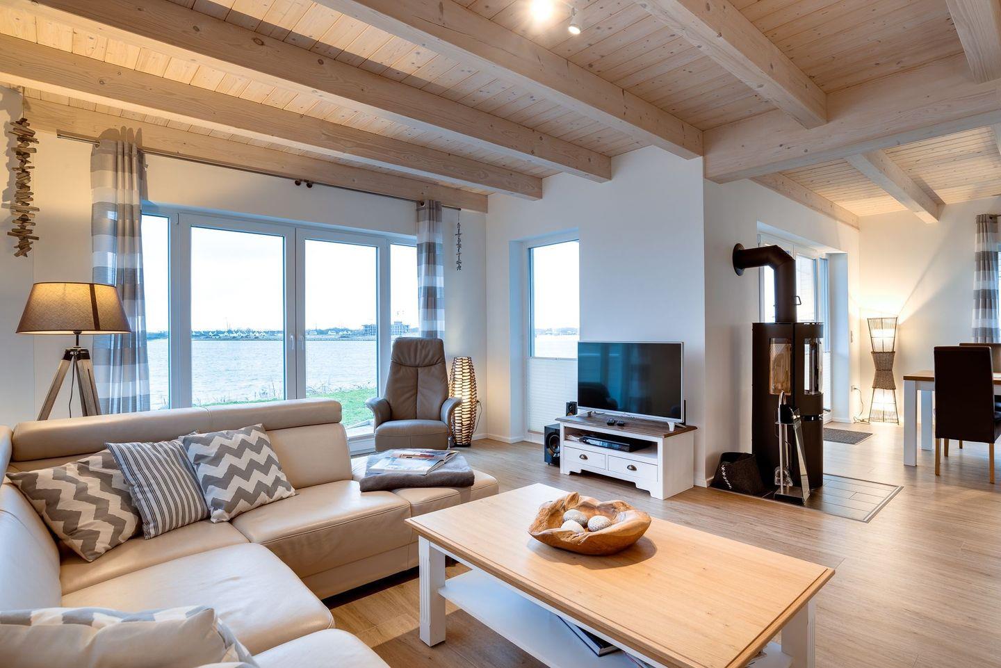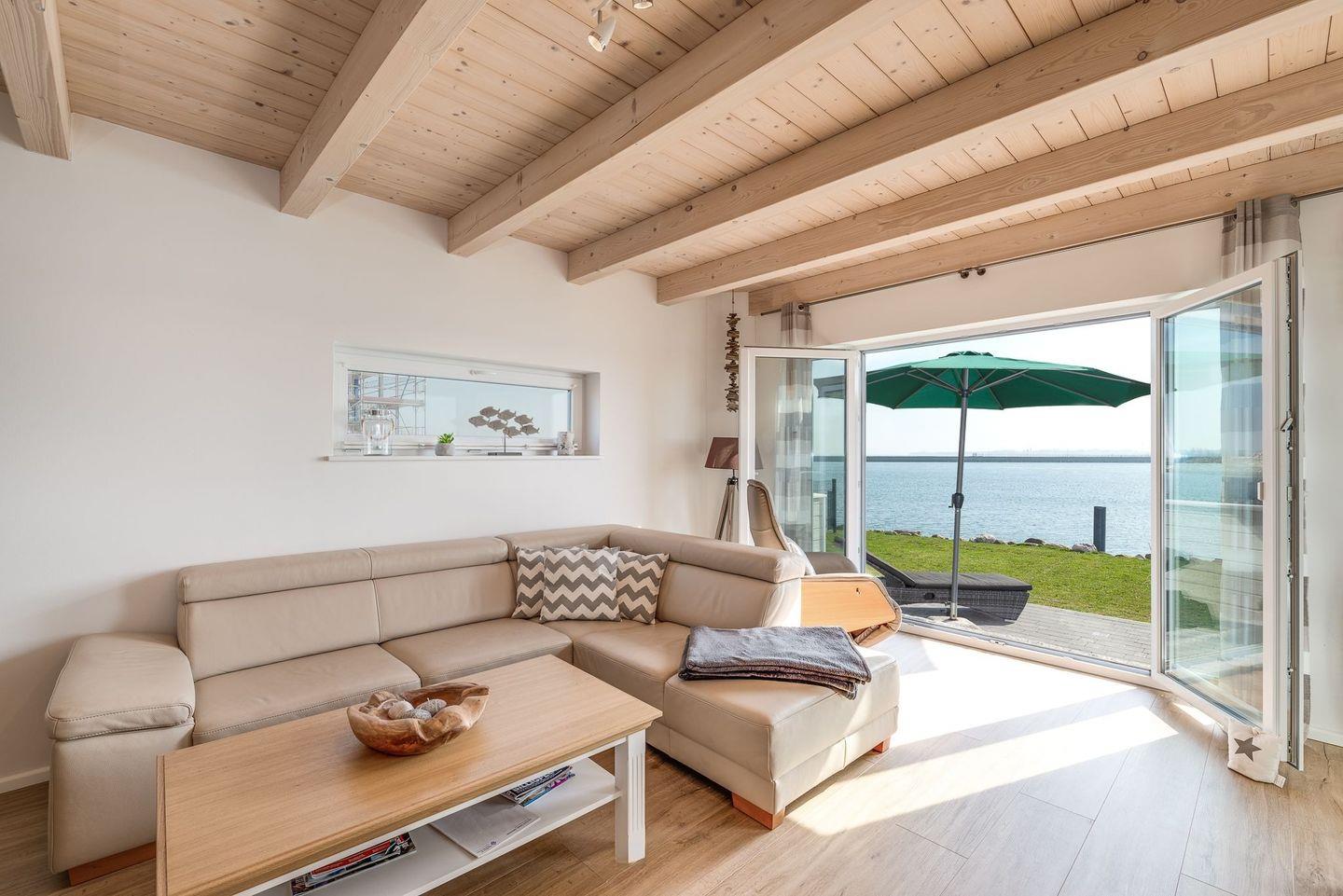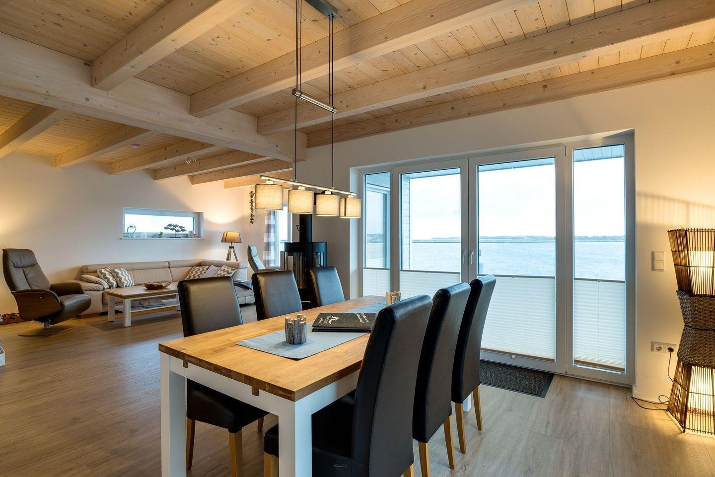 Im Erdgeschoss finden Sie den großen Wohn- und Essbereich mit voll ausgestatteter Küche und einer großen Kochinsel. Der runde Kaminofen verleiht dem Raum eine gemütliche Atmosphäre und bietet an kälteren Tagen eine angenehme Wärme. Draußen erweitert eine direkt am Wasser gelegene Terrasse mit komfortablen Gartenmöbeln und Grill die Wohnfläche ins Freie.