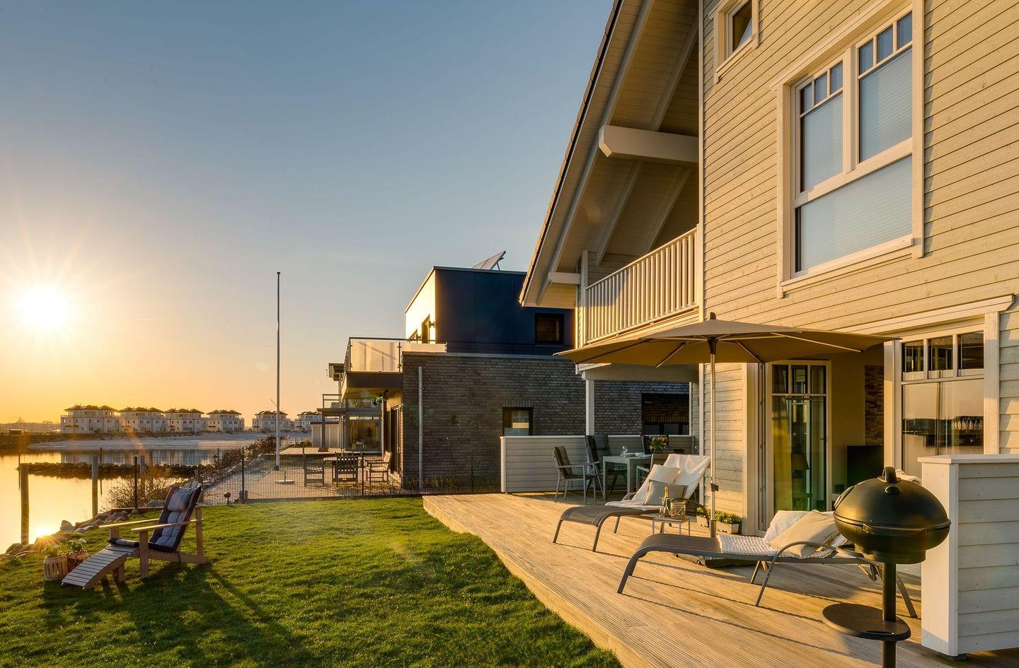 Bodentiefe Terrassenfenster auf der gesamten Südseite des Hauses ermöglichen einen wunderbaren Blick auf Hafen und Ostsee sowie den direkten Zugang zur großen Sonnenterrasse, die Dank der beiden Windschutzwände ganzjährig genutzt werden kann.