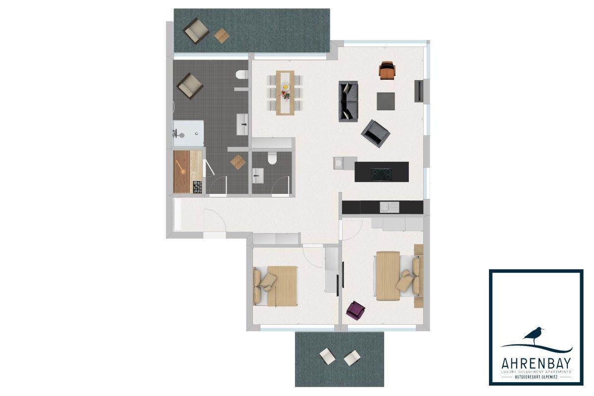 Ein weiteres Highlight ist der große Balkon, der direkt an die Uferböschung der Ostsee grenzt und mit Lounge-Möbeln zum Entspannen ausgestattet ist.
