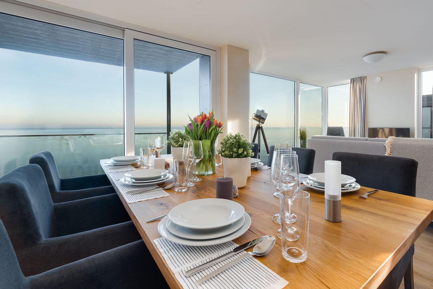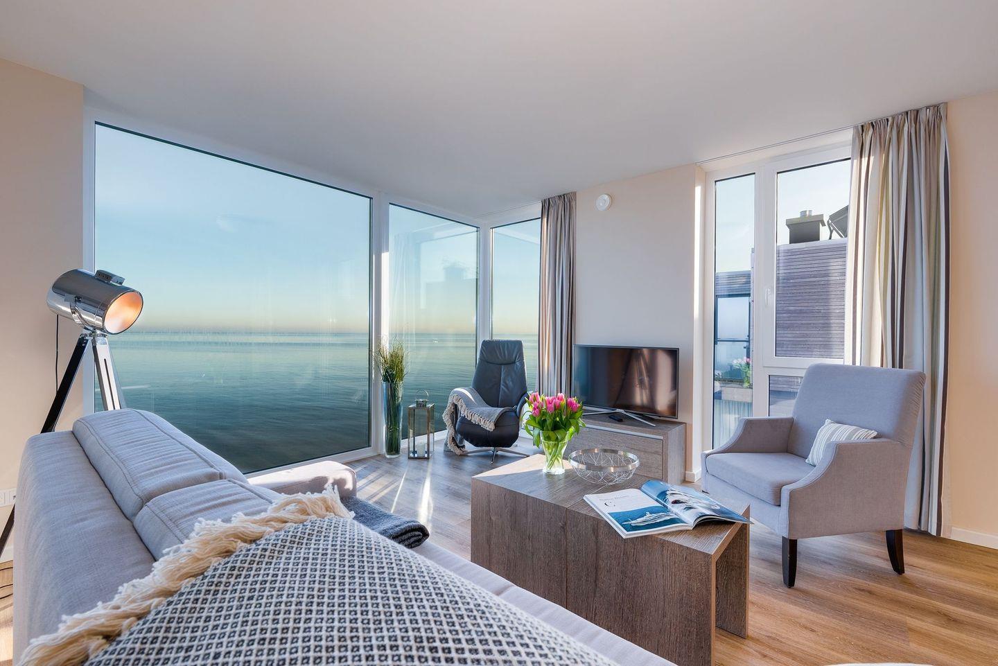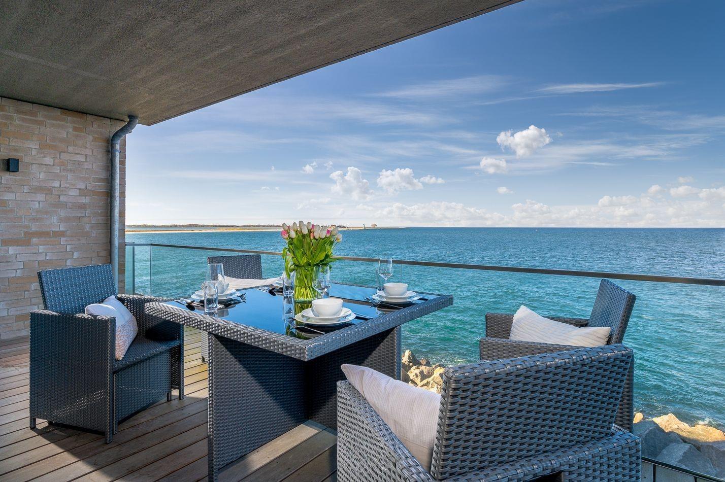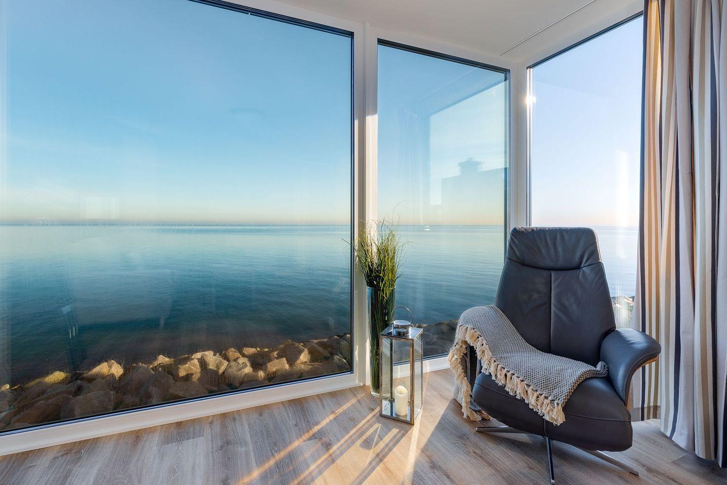 Das luxuriöse Apartment "Upper Deck" bietet einen erholsamen Aufenthalt mit freiem Blick auf das Meer. Es befindet sich im ersten Stock eines Apartmenthauses, direkt an der Ostseeküste.