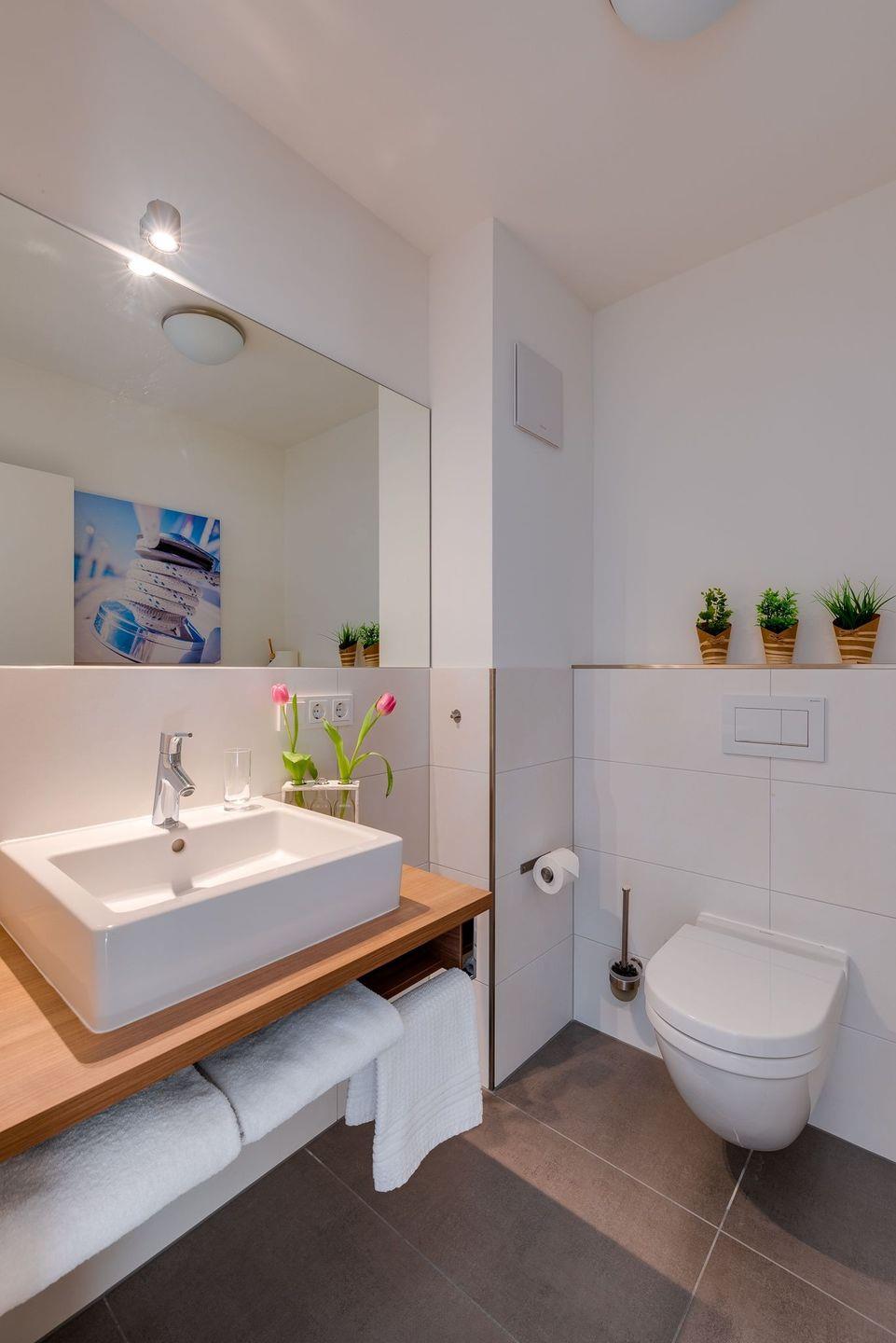 Die finnische Sauna im voll ausgestatteten Badezimmer ermöglicht entspannende Stunden. Ein zweites kleines Bad mit Toilette ergänzt die sanitären Einrichtungen.