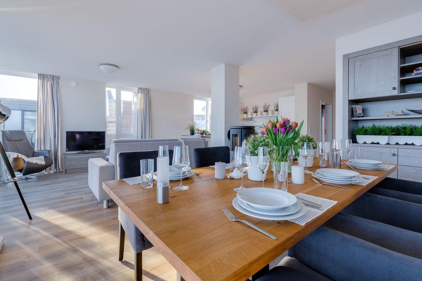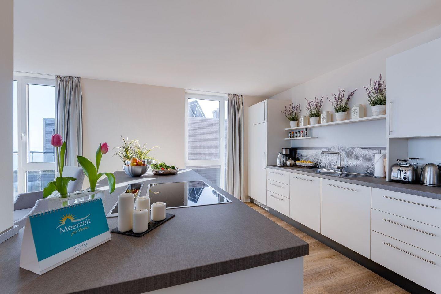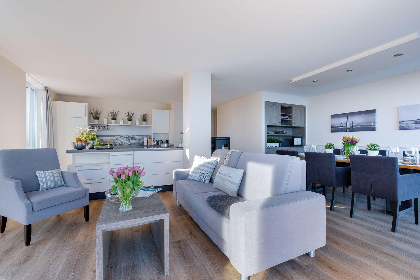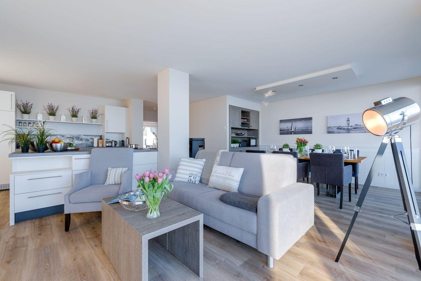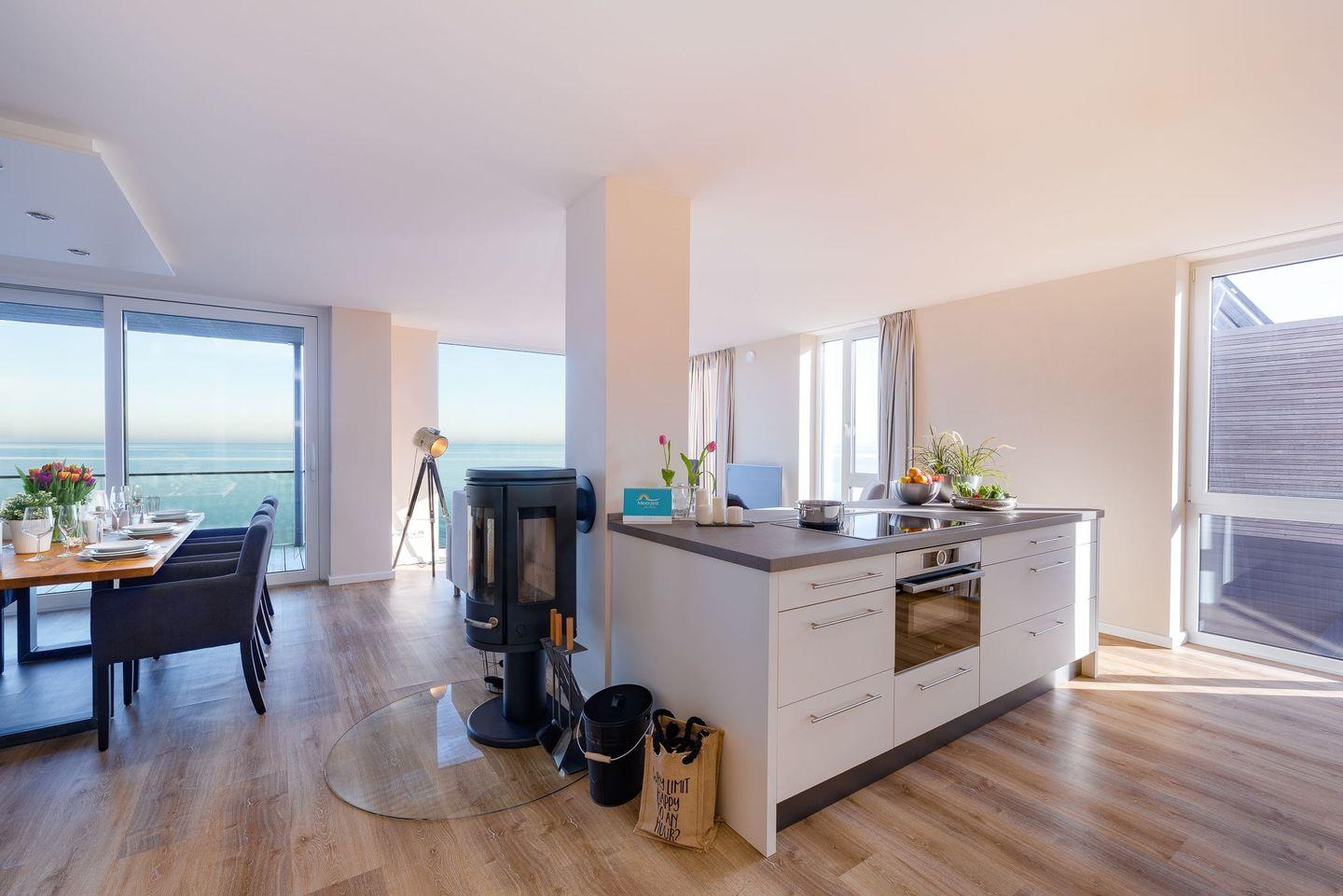 Die offene Wohnküche mit Kochinsel ist zum Meer ausgerichtet, sodass auch beim Kochen der Blick auf die Ostsee möglich ist. Die Küche ist hochwertig ausgestattet und bietet alle Annehmlichkeiten einer modernen Küche, einschließlich Geräten namhafter Hersteller sowie einer vollständigen Ausstattung mit Geschirr und Küchenutensilien. Im offenen Wohn- und Esszimmer liegt der Fokus stets auf der Ostsee. Vorbeifahrende Segelboote, Möwen, Blässhühner und die im Wind wehenden Schilfgräser, die das Naturschutzgebiet umgeben, bieten einen reizvollen Anblick. Das Wohnzimmer ist mit einem 32-Zoll-Fernseher mit Satellitenempfang ausgestattet.