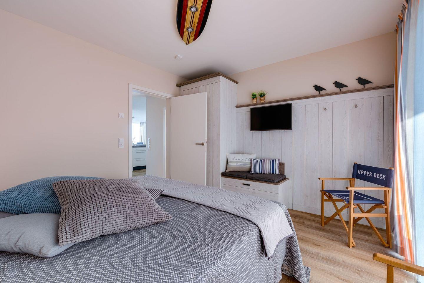 Das zweite Schlafzimmer ist speziell auf die Bedürfnisse von Kindern und Jugendlichen zugeschnitten und verfügt über ein ansprechendes Design mit einem Surfbrett unter der Decke sowie viel Platz zum Spielen und Entspannen. Beide Schlafzimmer sind mit einem Fernseher ausgestattet.