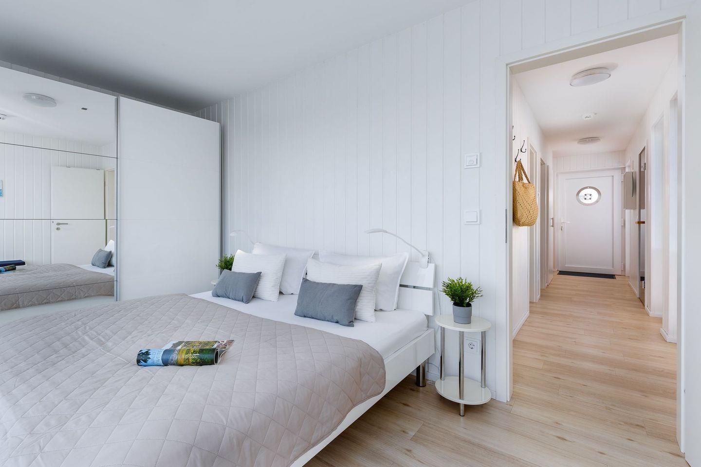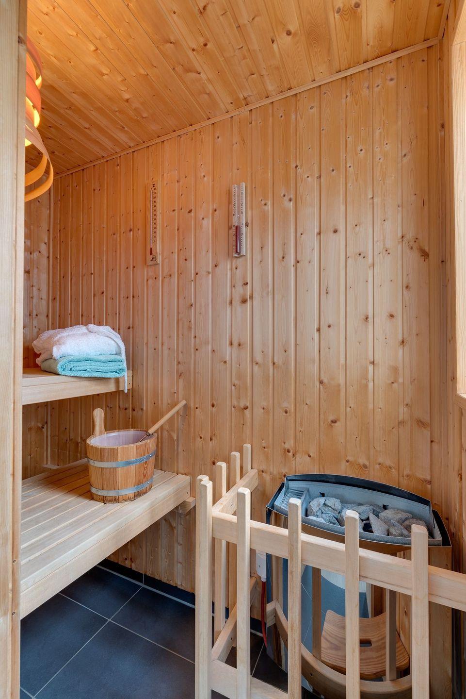 Der großzügige Wohn- und Essbereich im Obergeschoss verfügt über Panoramafenster mit Zugang zur Terrasse und Hafenblick. Im Erdgeschoss befinden sich zwei Schlafzimmer. Das Hauptschlafzimmer bietet bodentiefe Panoramafenster, eine Schiebetür und direkten Zugang zur unteren Terrasse, die das Haus umgibt. Des Weiteren finden Sie im Erdgeschoss das Badezimmer mit Dusche, WC und Waschbecken. Nach einem Tag voller Aktivitäten entspannen Sie in der Sauna mit Meerblick und können sich anschließend in der Ostsee erfrischen.