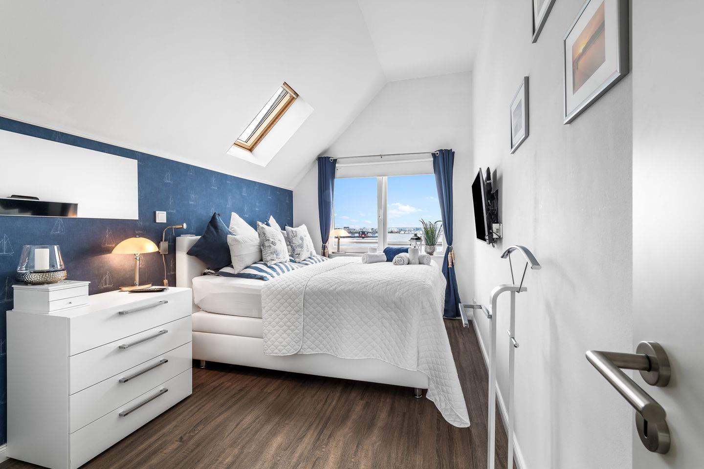 Das erste Schlafzimmer ist mit einem Boxspringbett mit hochwertiger Matratze, einem großen Einbauschrank, einer Kommode, einem UHD-LED-Fernseher und einem Ausblick auf das Hafenbecken ausgestattet. Ein Kinderreisebett für Babys und Kinder ist ebenfalls vorhanden.