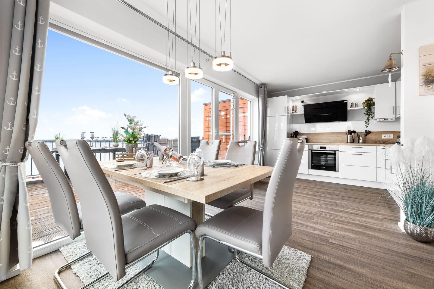 Die Maisonette-Wohnung "Hafenlounge" bietet eine hochwertige Ausstattung und befindet sich in direkter Wasserlage. Der großzügige Wohn- und Essbereich profitiert von reichlich Tageslicht durch großen Panoramafenster, wodurch eine helle und einladende Atmosphäre entsteht. Dank der Ausrichtung zur Südseite des Gebäudes können die Gäste den ganzen Tag über Sonnenschein genießen.
