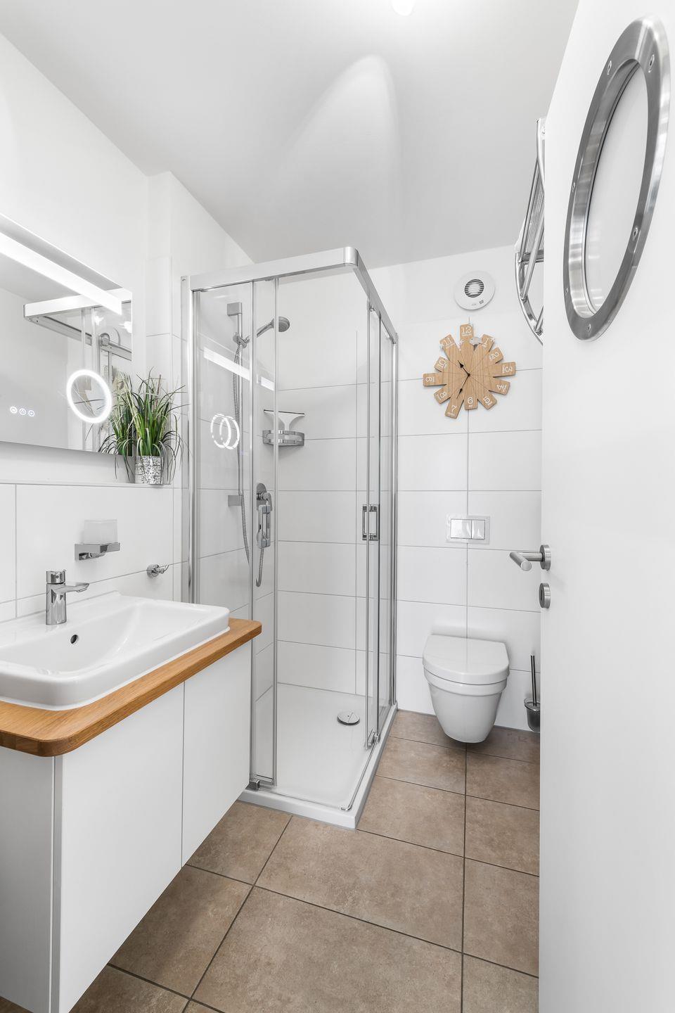 Vom offenen Essbereich, der an die Küche angrenzt, ist die Terrasse zugänglich. Diese ist großzügig ausgestattet mit einem Strandkorb, zwei Relaxliegen, einem Ampelschirm, einem Rattan-Esstisch mit Stühlen, Terrassenmöbeln und einem Weber-Grill. Für den Fall, dass ein Strandbesuch gewünscht wird, stehen ein Bollerwagen, eine Strandmuschel, ein Volleyball und Strandunterlagen zur Verfügung. Ergänzt wird diese Etage durch ein geräumiges Gäste-Duschbad.