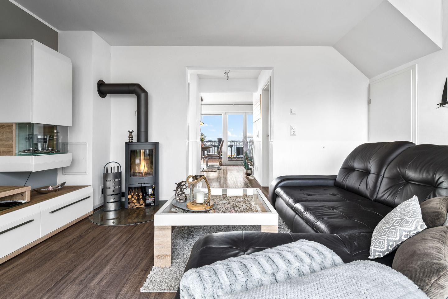 Das Obergeschoss bildet den zentralen Bereich der Wohnung und präsentiert sich mit einem offenen Loft-Design, das einen fließenden Übergang zwischen den Räumen ermöglicht. Das geräumige Wohnzimmer ist mit einem Designersofa (mit elektrisch verstellbarer Ottomane), einem Kaminofen und einem 55-Zoll-4K-UHD-Fernseher mit Blu-Ray-Player und Bluetooth-Soundbar ausgestattet. DVDs für Kinder, Jugendliche und Erwachsene sowie Spiele für verschiedene Altersgruppen sind ebenfalls vorhanden.