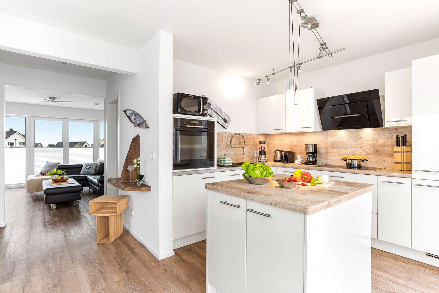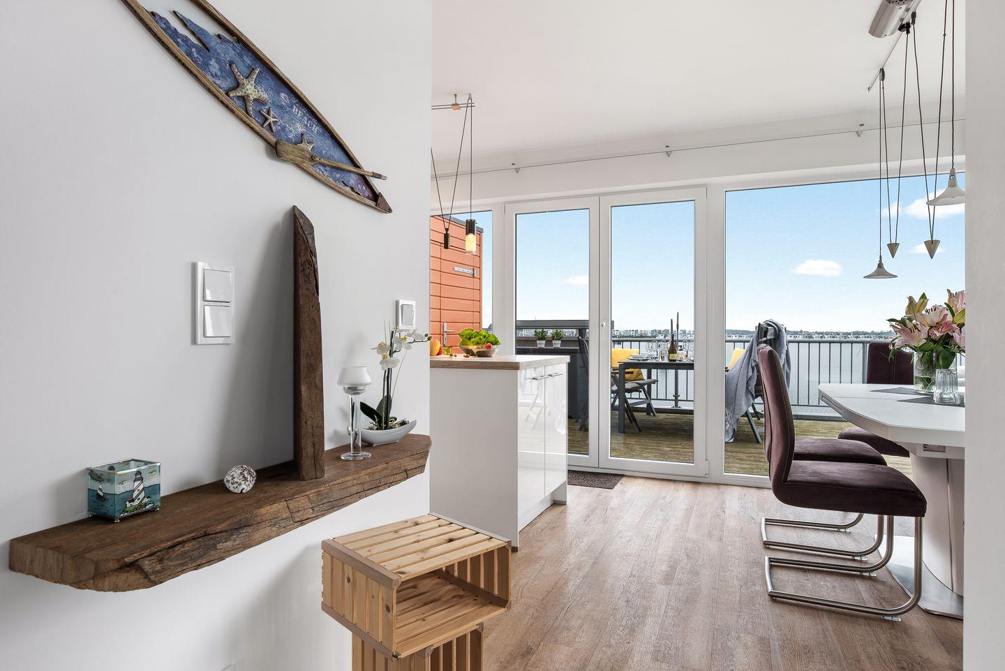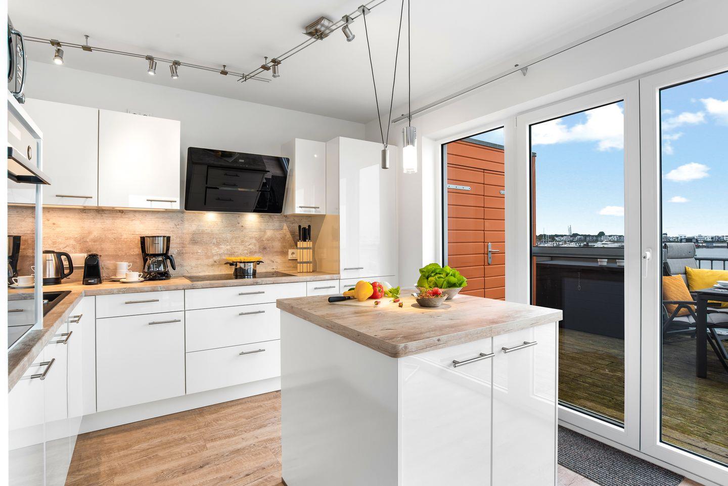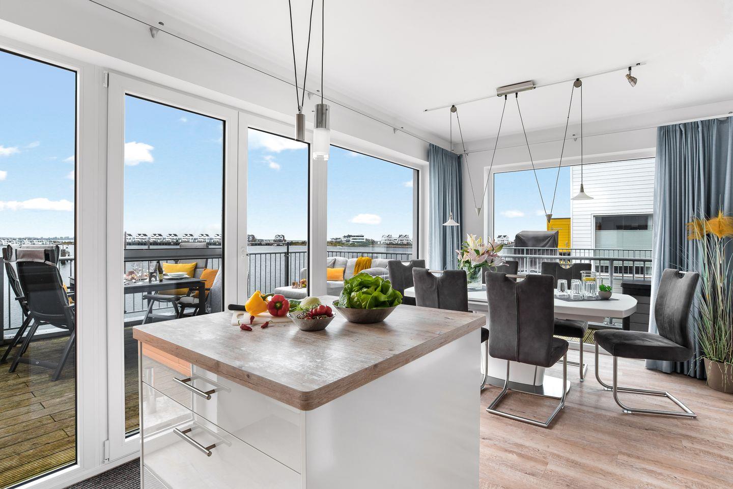 Offen gestaltet ist auch die Küche, welche sich direkt an den Wohnbereich anschließt. Hier erwartet unsere Gäste ein Esstisch mit gemütlicher Bestuhlung sowie eine voll ausgestattete Küche mit Küchenblock in der Raummitte. Die großen Panoramafenster bieten einen großartigen Blick auf den Ostseehafen - den Blick über das Wasser schweifen lassen und die Seele baumeln lassen. Von der Küche betritt man die große Dachterrasse, die mit einem gemütlichen Loungesofa ausgestattet ist. Von hier kann man beim Sundowner dem Ein- und Auslaufen der Schiffe zusehen oder einen schönen Grillabend mit Familie oder Freunden verbringen - hier lässt sich das Ostseeflair in vollen Zügen genießen. Ein Gäste-Duschbad ist auf dieser Wohnebene ebenfalls vorhanden.