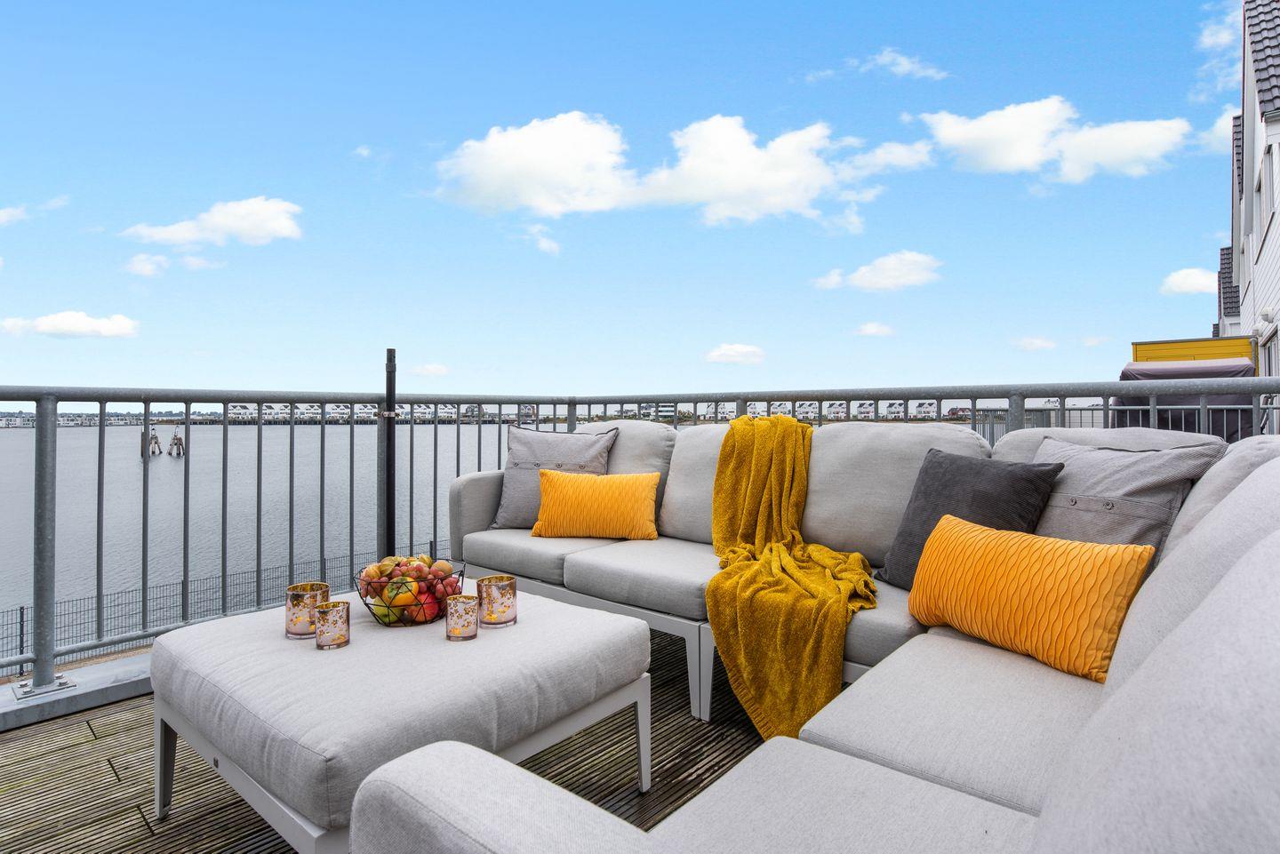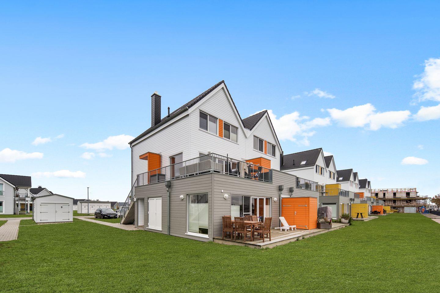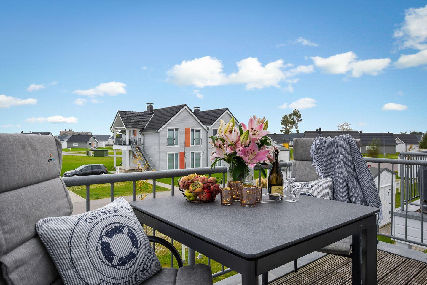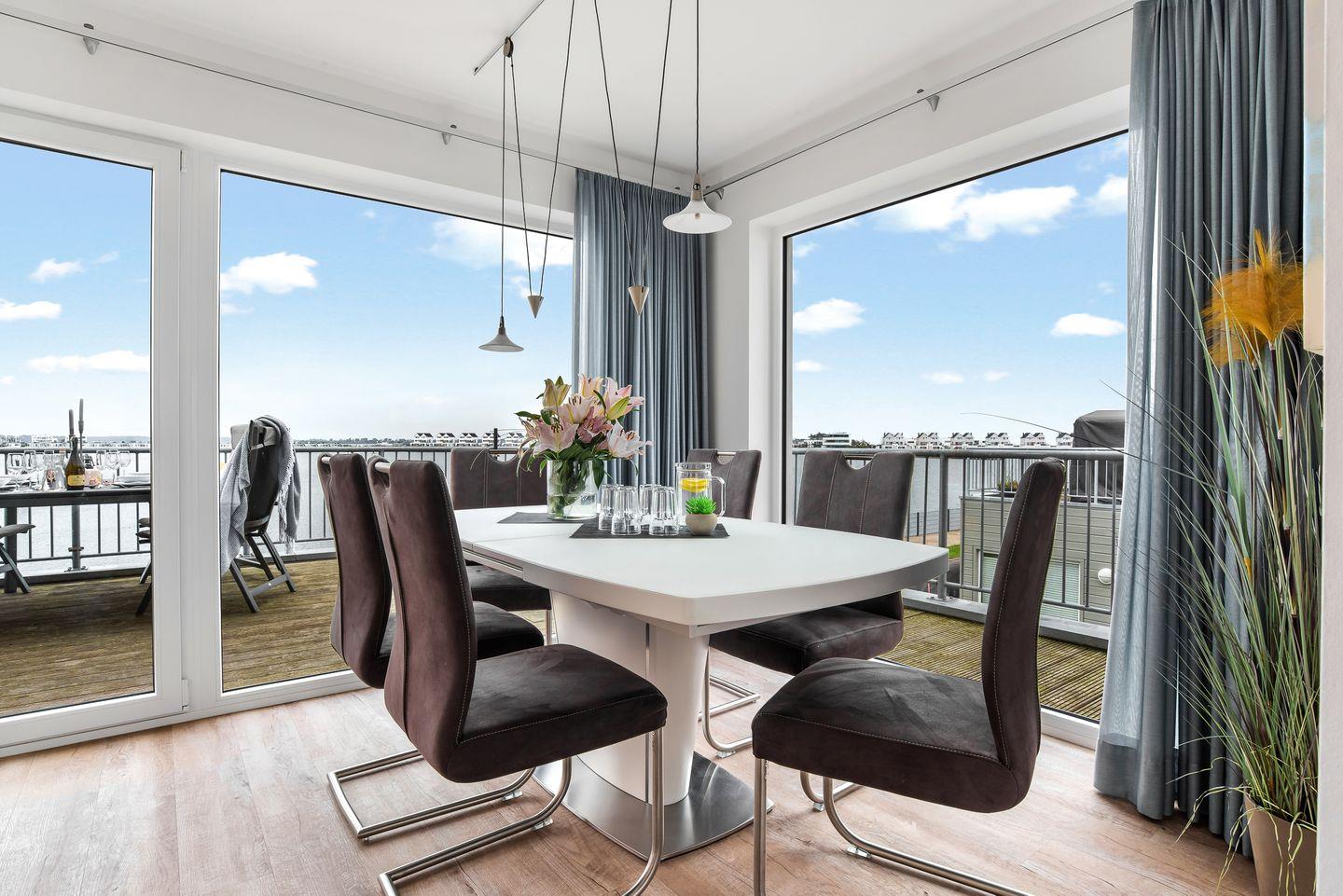 Offen gestaltet ist auch die Küche, welche sich direkt an den Wohnbereich anschließt. Hier erwartet unsere Gäste ein Esstisch mit gemütlicher Bestuhlung sowie eine voll ausgestattete Küche mit Küchenblock in der Raummitte. Die großen Panoramafenster bieten einen großartigen Blick auf den Ostseehafen - den Blick über das Wasser schweifen lassen und die Seele baumeln lassen. Von der Küche betritt man die große Dachterrasse, die mit einem gemütlichen Loungesofa ausgestattet ist. Von hier kann man beim Sundowner dem Ein- und Auslaufen der Schiffe zusehen oder einen schönen Grillabend mit Familie oder Freunden verbringen - hier lässt sich das Ostseeflair in vollen Zügen genießen. Ein Gäste-Duschbad ist auf dieser Wohnebene ebenfalls vorhanden.