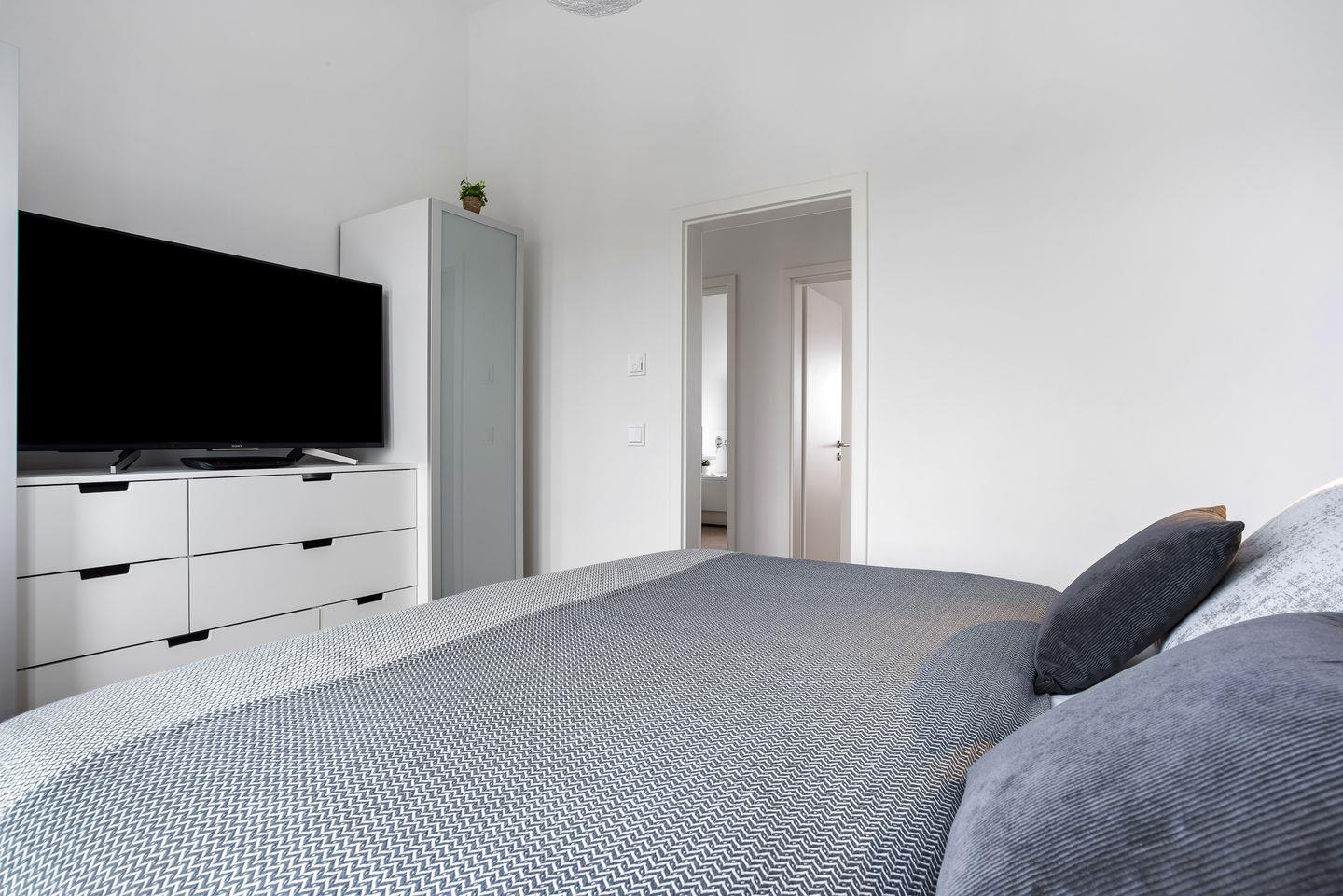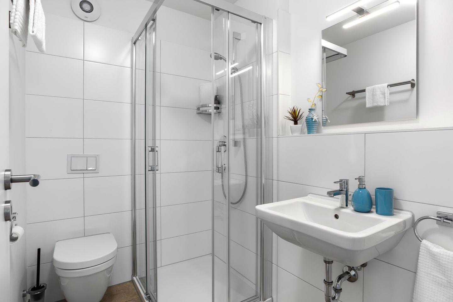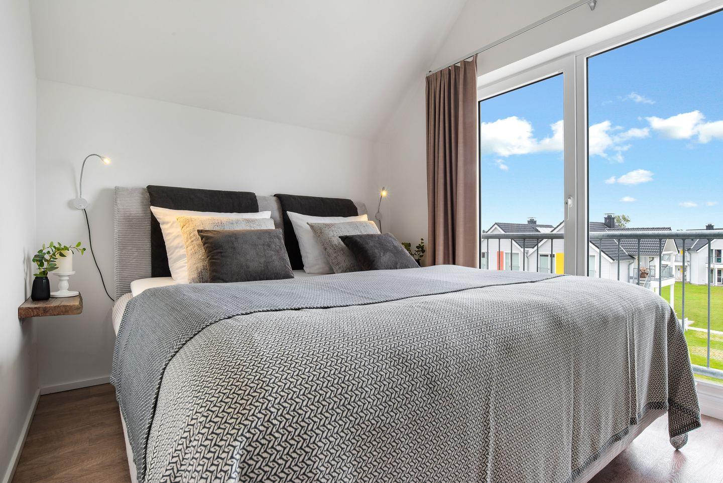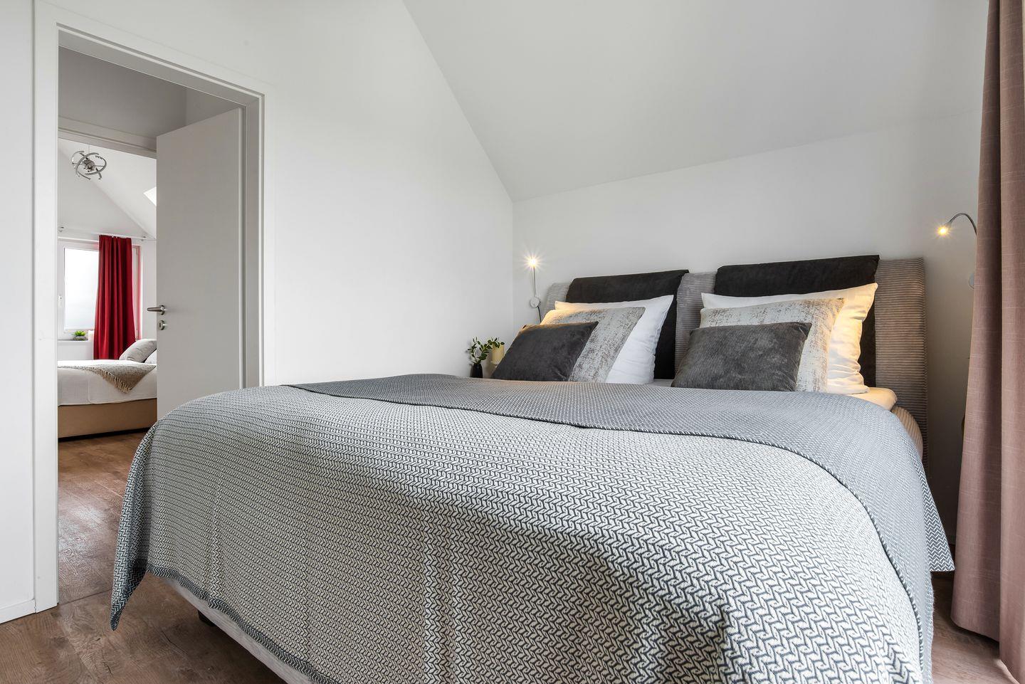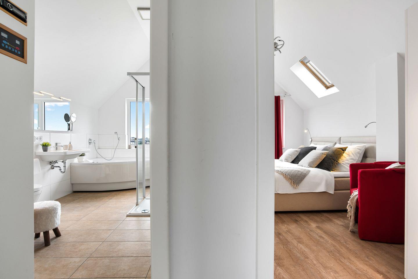 Vom Wohnbereich führt eine Treppe in das Dachgeschoss, welches mit zwei Schlafzimmern und einem großen Wellnessbad auf unsere Gäste wartet. Der Masterbedroom, mit hochwertigem Boxspringbett, (1,80 x 2,00 m), welches sich bei Bedarf in zwei Einzelbetten verwandeln lässt, bietet schon beim Aufwachen Meerblick. Den Tag bei einer Tasse Kaffee im Bett beginnen und sich vom Hafenkino verzaubern lassen. Abends in den Himmel schauen und Sterne zählen, denn durch das Dachfenster über dem Bett ist auch dies möglich. Das zweite Schlafzimmer verfügt ebenfalls über ein schönes großes Boxspringbett (1,80 x 2,00) mit einem Smart-TV (50 Zoll) mit Home Entertainment MagentaTV. Das große