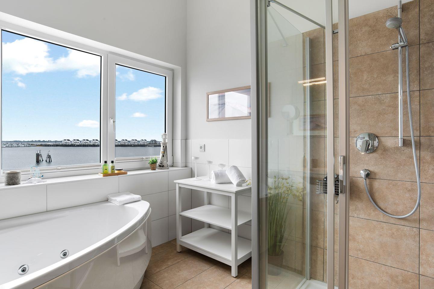 Wellnessbadezimmer mit Infrarotsauna mit LED-Lichttherapie, Eckwhirlwanne und Dusche bietet Entspannung pur, denn auch von hier ist der Blick auf das Wasser garantiert.