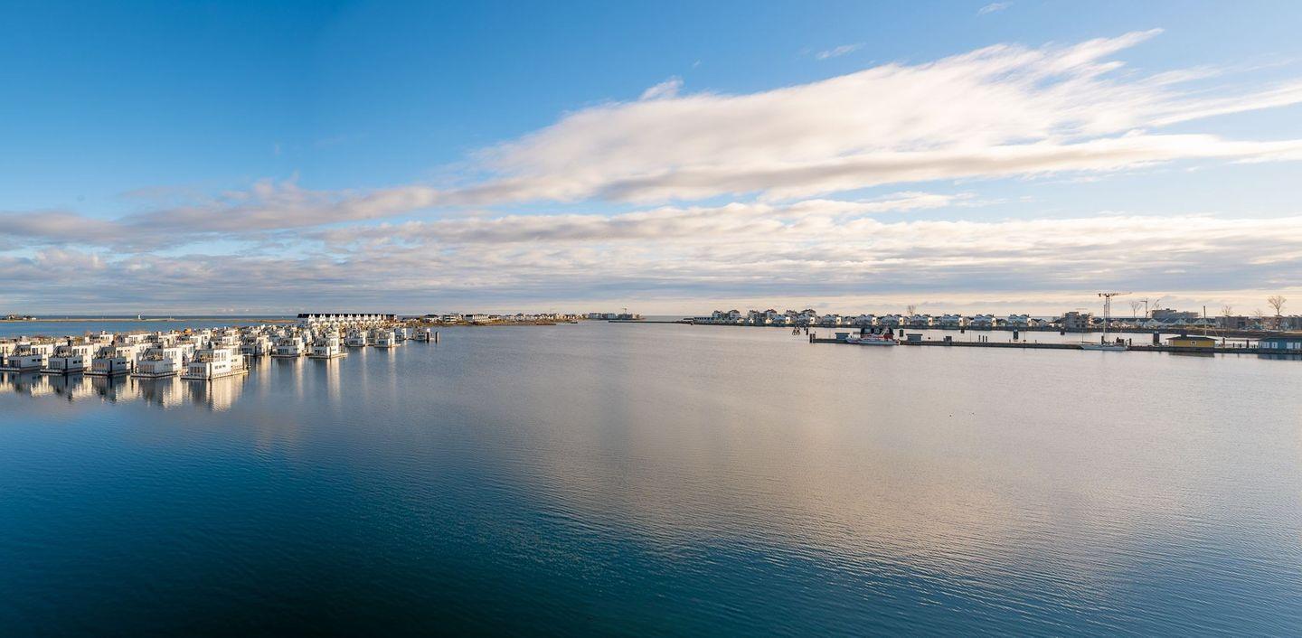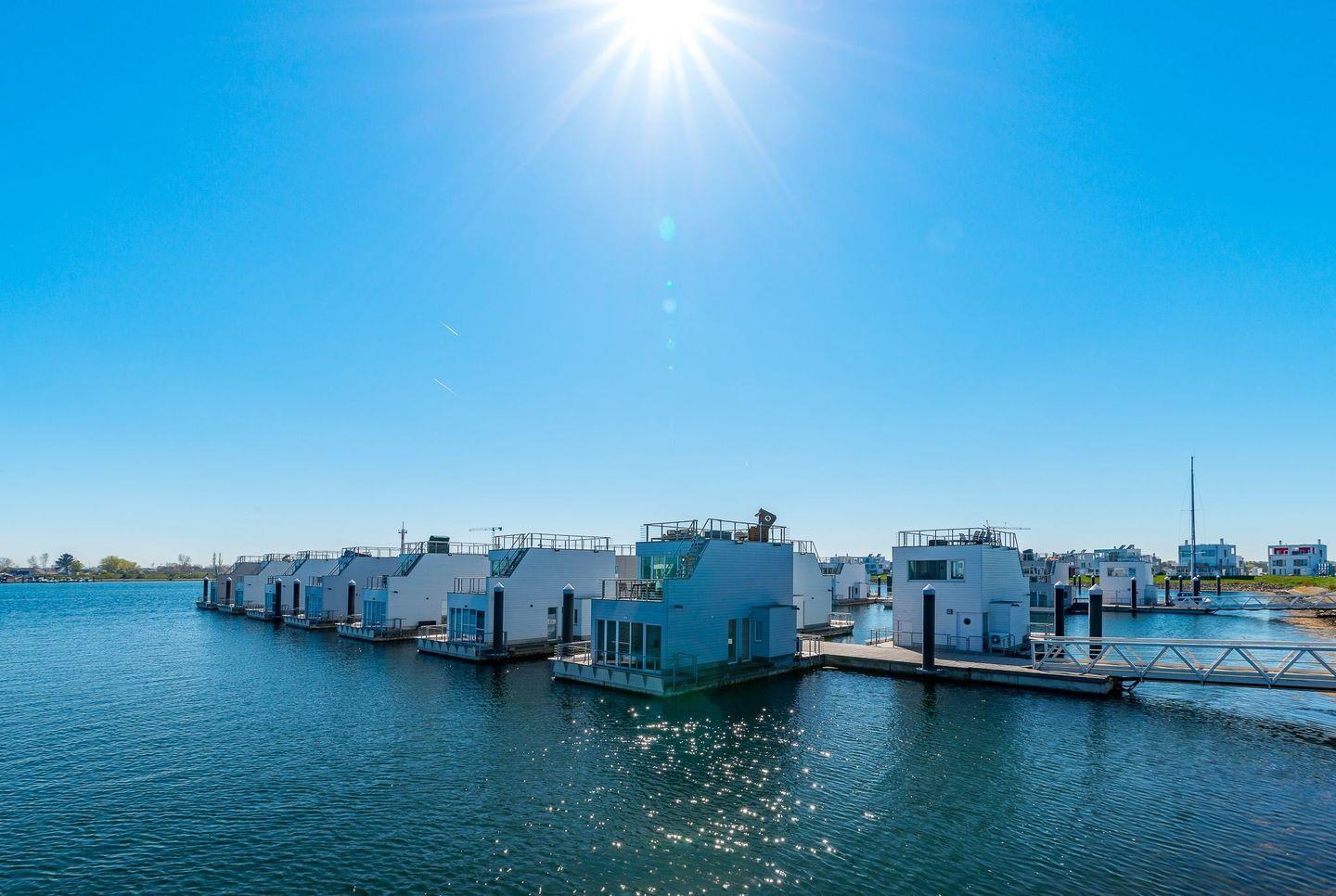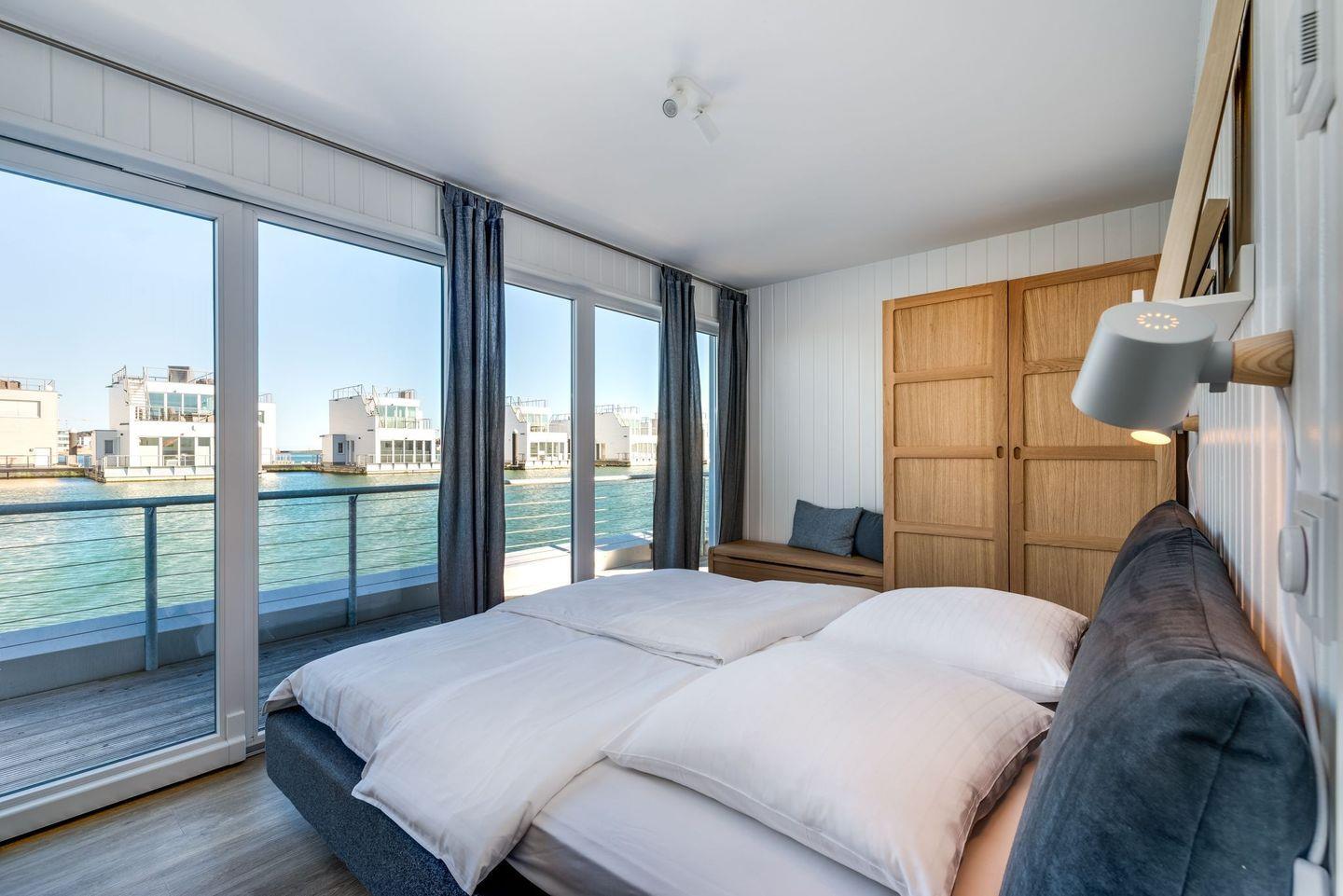 Luxuriöses, schwimmendes Wasserhaus mit Sauna, Dachterrasse und Meerblick im Ostseeresort Olpenitz.