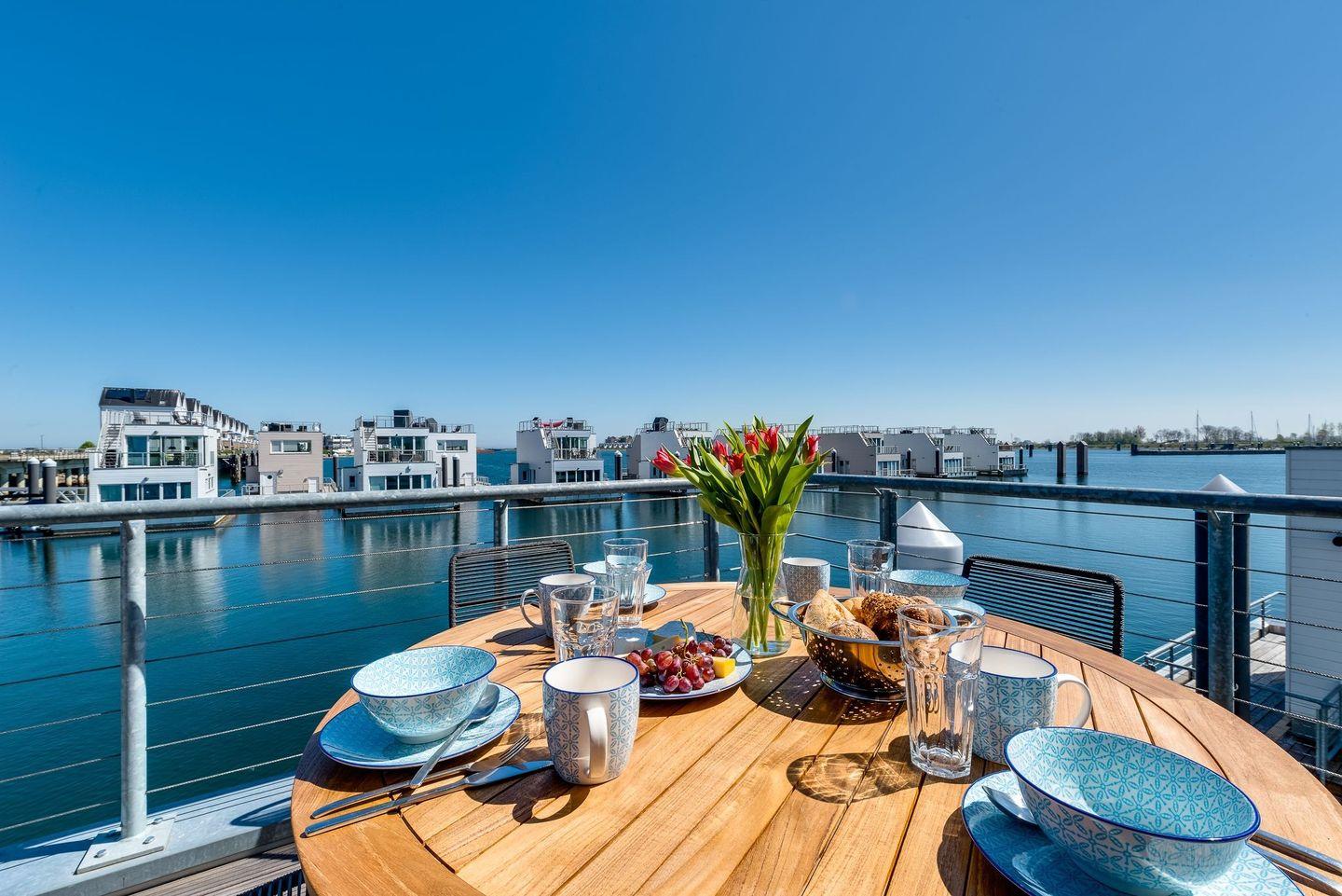Schwimmendes Luxusferienhaus mit freiem Ostseeblick, gehobener Ausstattung, großer Dachterrasse, eigenem Bootsanleger und finnischer Sauna.