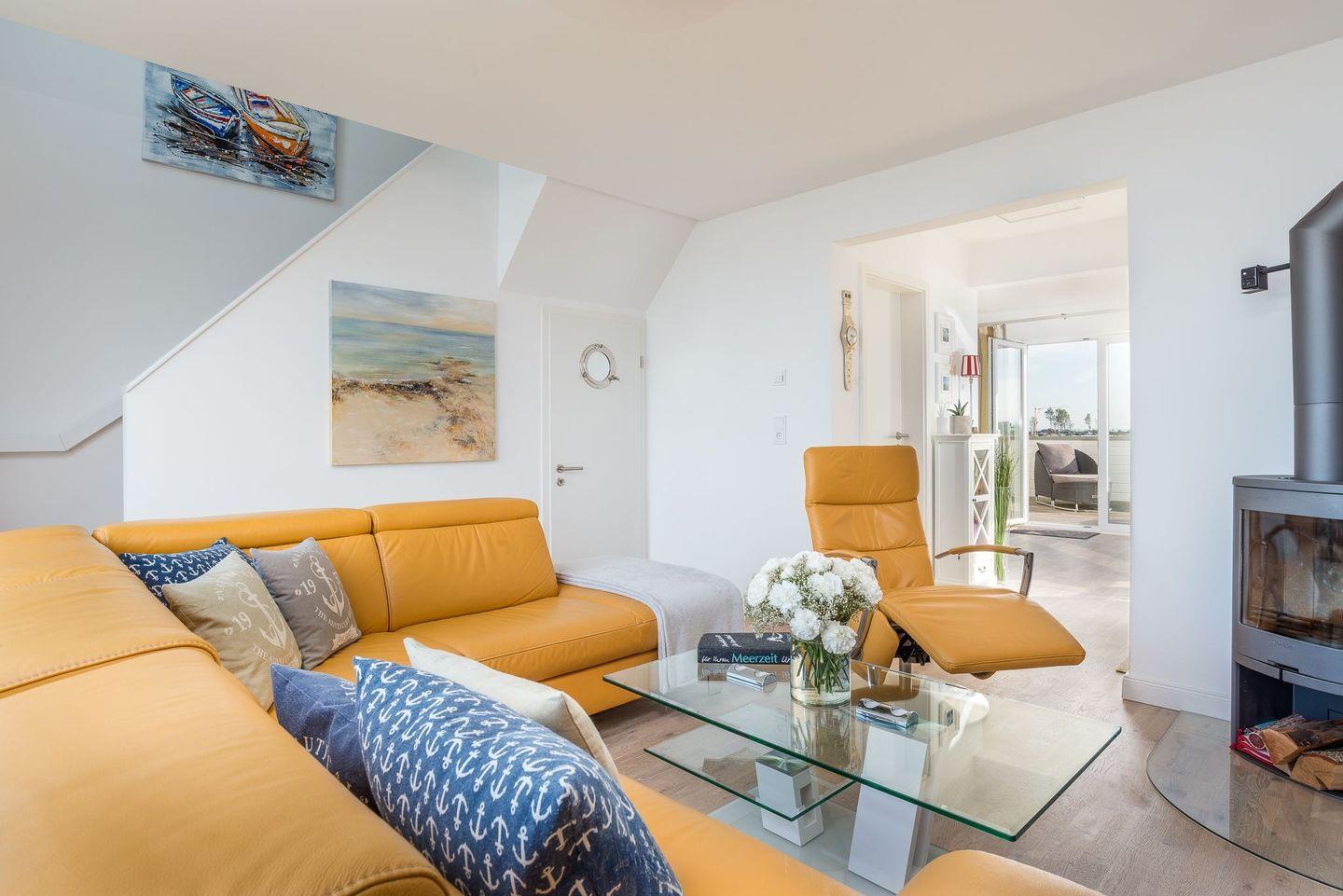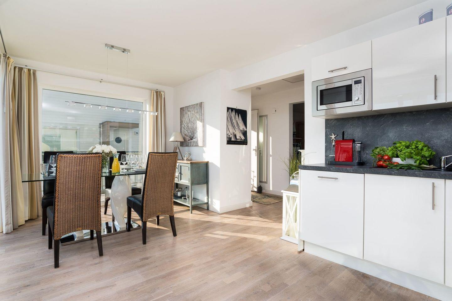 Der Küchen- und Essbereich im Obergeschoss öffnet sich zu einer ca. 25 m² großen Terrasse. Hier erwartet Sie ein 180-Grad-Panoramablick auf den gesamten Hafen und die glitzernde Ostsee. Ein Strandkorb lädt zum Verweilen ein. Die Sonne scheint, eine leichte Brise weht – hier atmen Sie Ostseeflair.