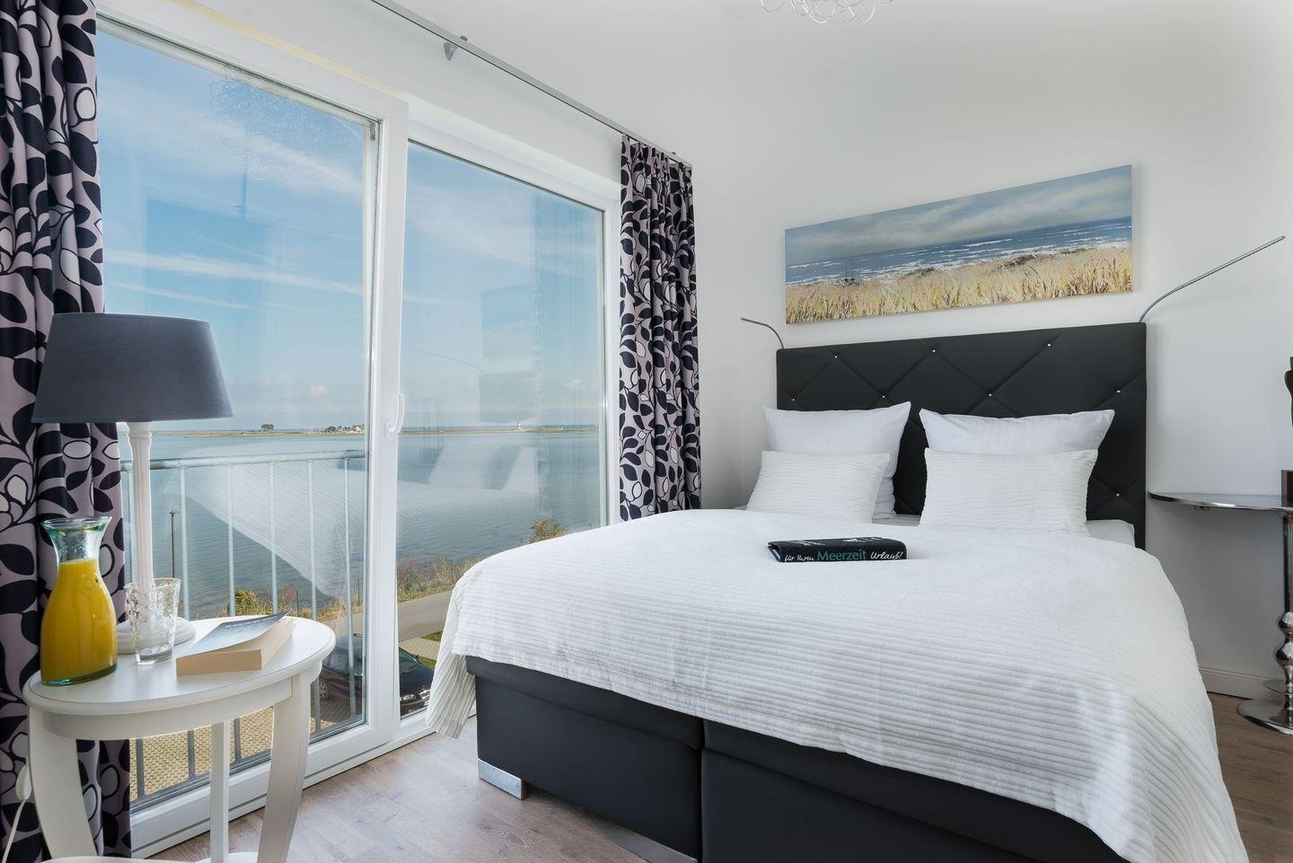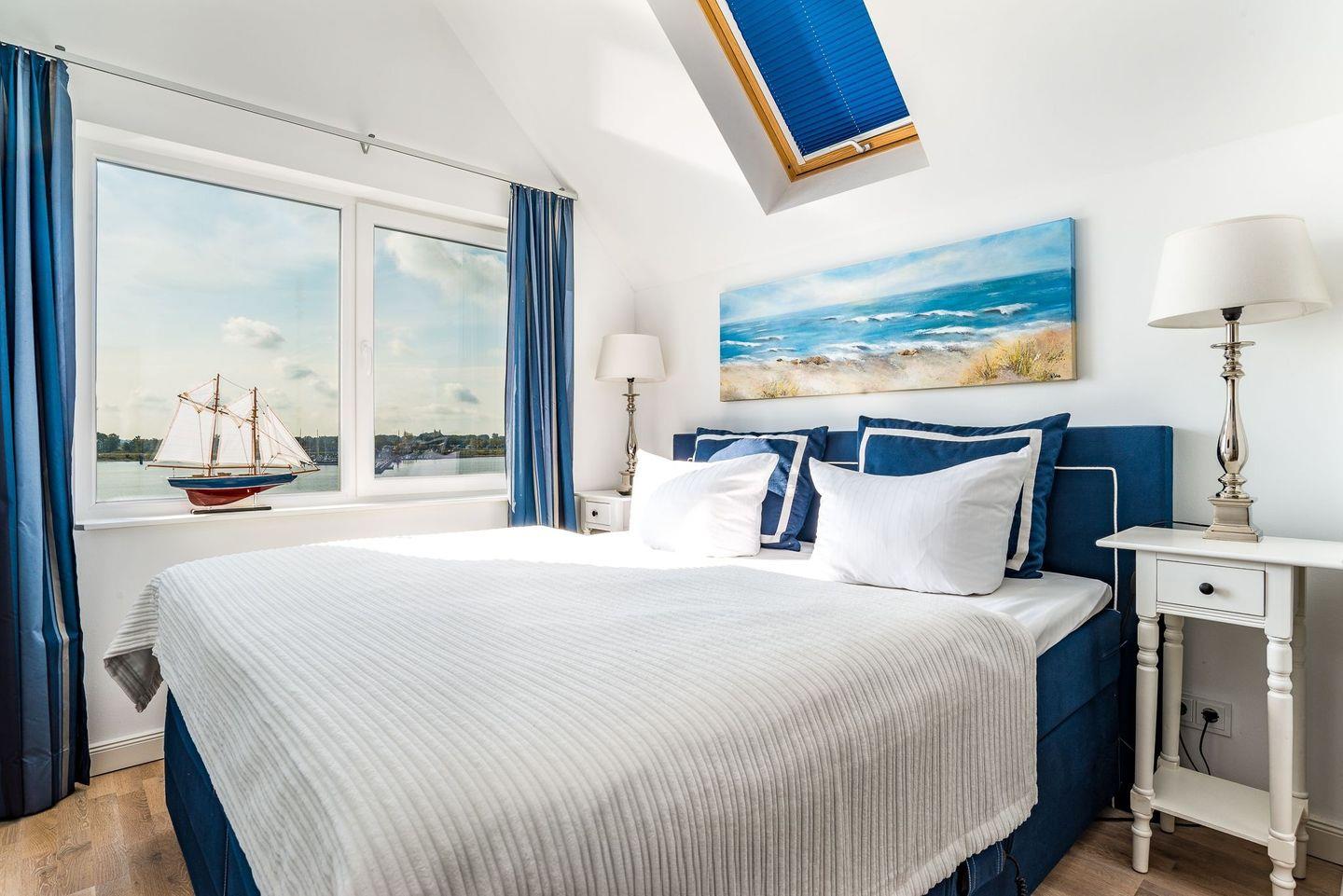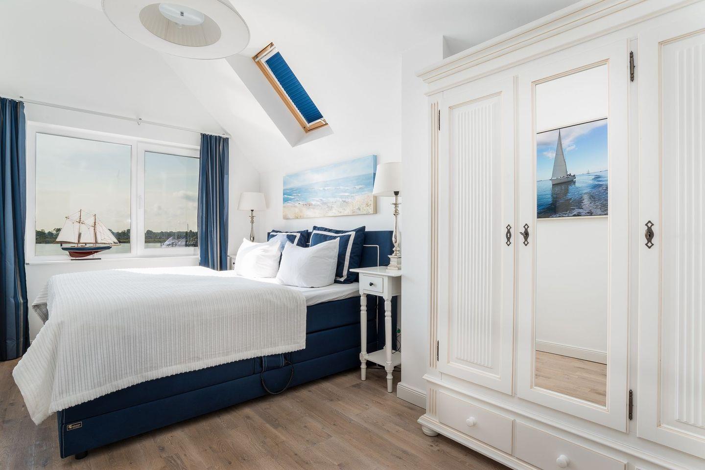 Die beiden Schlafzimmer verfügen über große Boxspringbetten. Sie wachen auf und blicken direkt auf das Wasser.