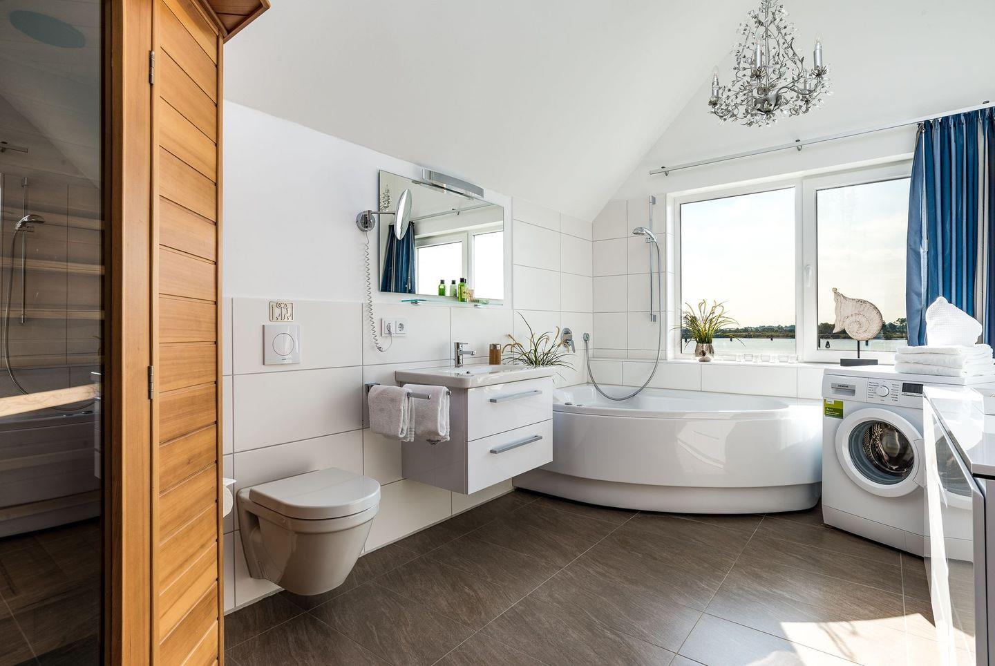 Im Dachgeschoss erwartet Sie außerdem eine Wellnessoase: Ein Bad mit Whirlpool und eine Infrarotsauna laden zur Entspannung ein. Genießen Sie den Blick auf den Hafen. Hier vergessen Sie den Alltag.