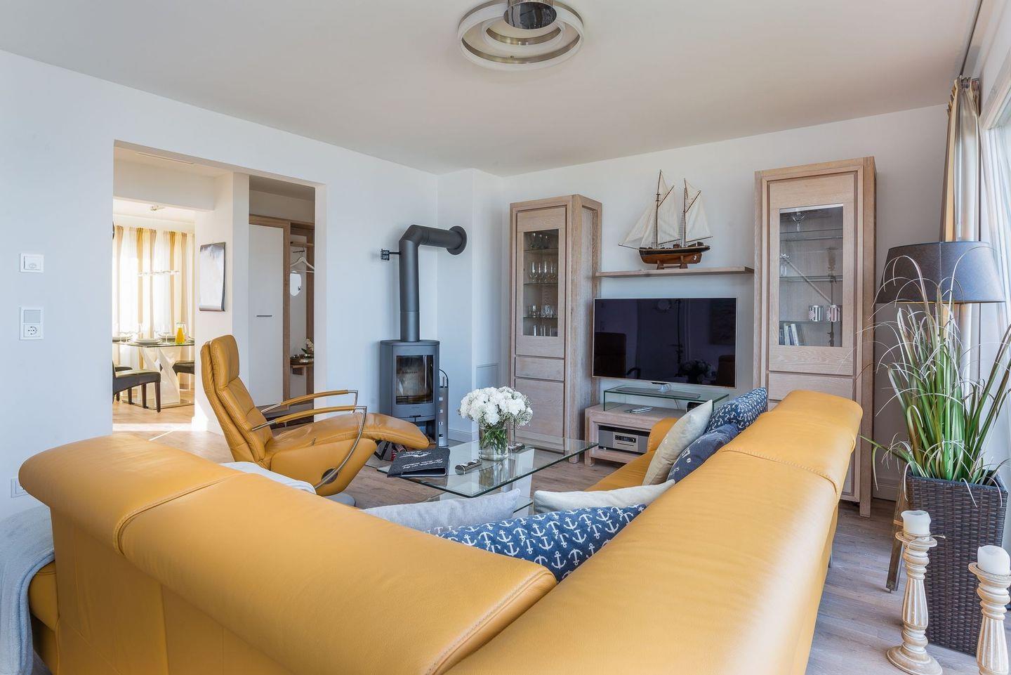 Angrenzend an den Küchenbereich finden Sie ein Gäste-WC mit Dusche. Das großzügige Wohnzimmer mit Kamin verspricht Behaglichkeit. Der Kamin knistert an kühlen Tagen und sorgt für eine wohlige Atmosphäre. Der Blick schweift über die Schlei, Sie beobachten Schiffe.