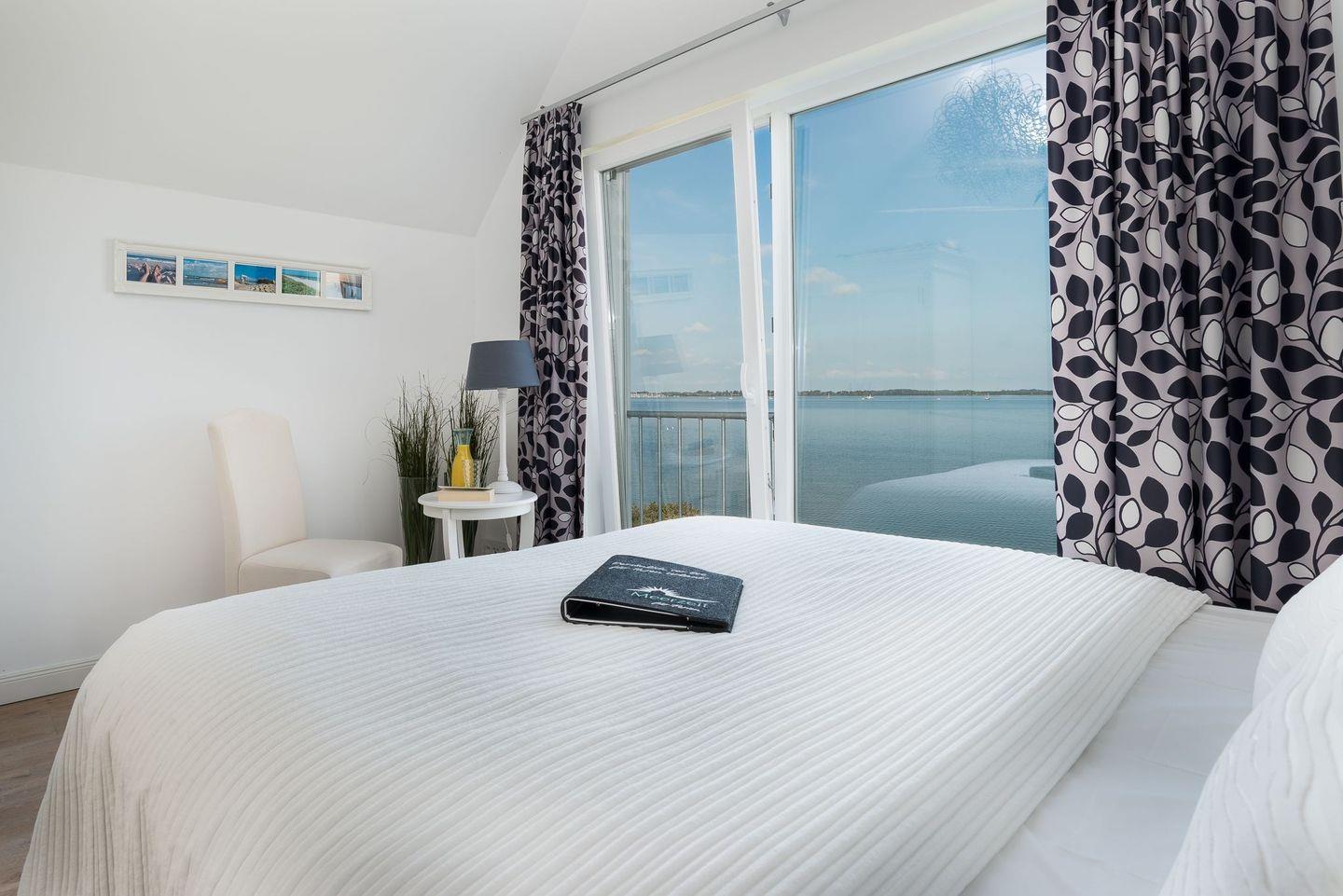 Exklusive Ferienwohnung Quarterdeck im Ostseeresort Olpenitz mit Terrasse und Panoramablick auf Hafen und Ostsee.