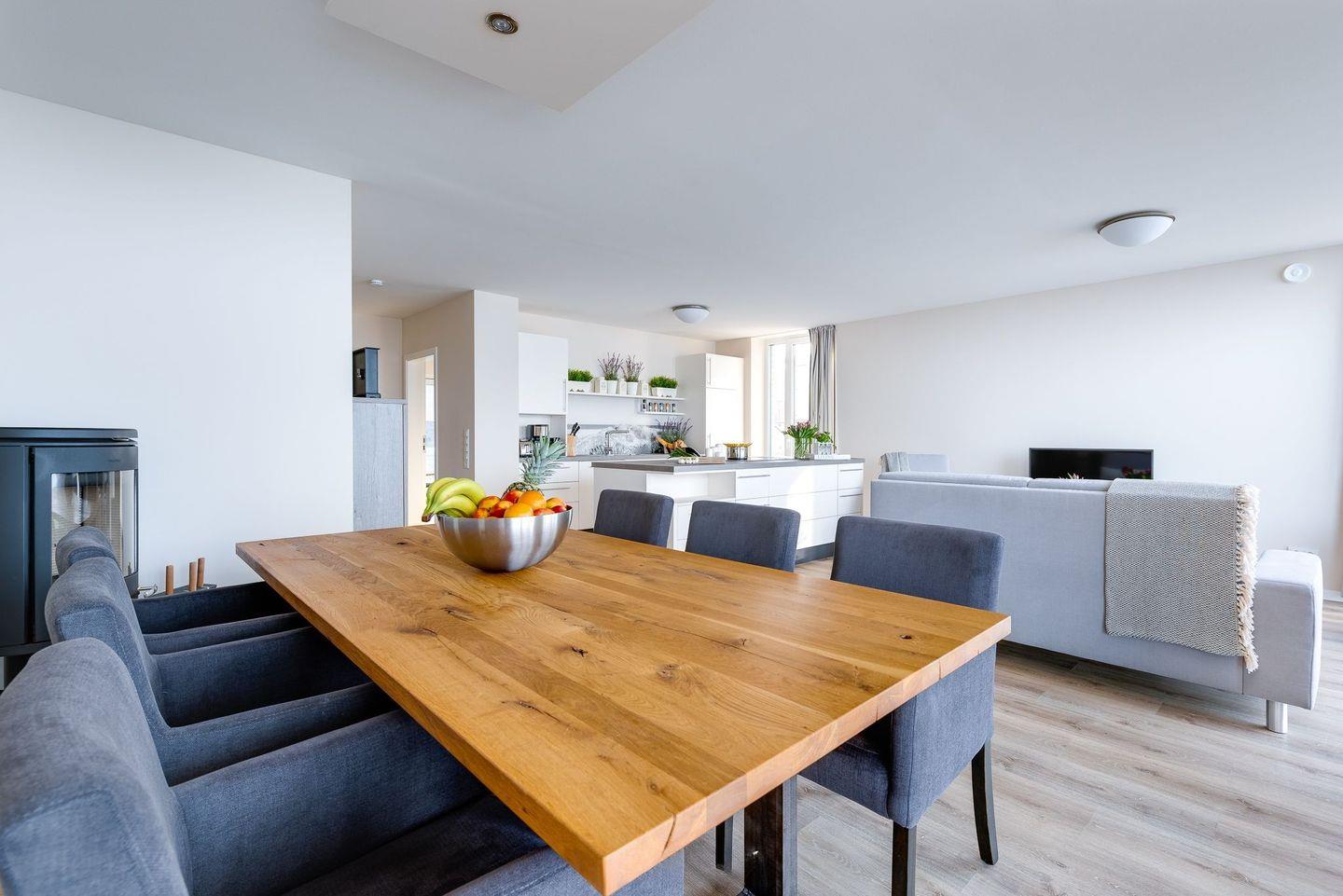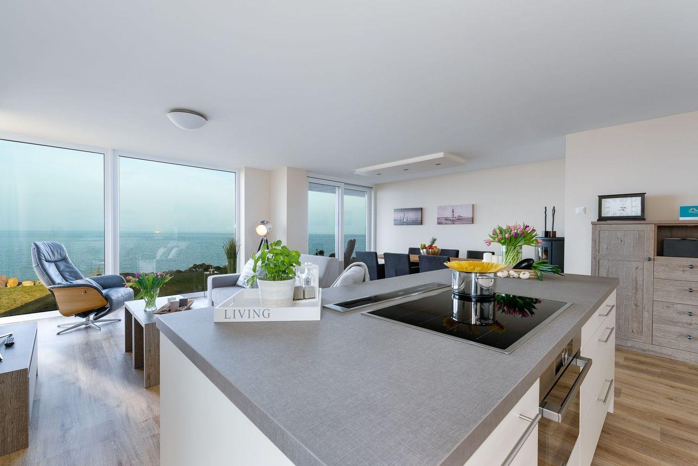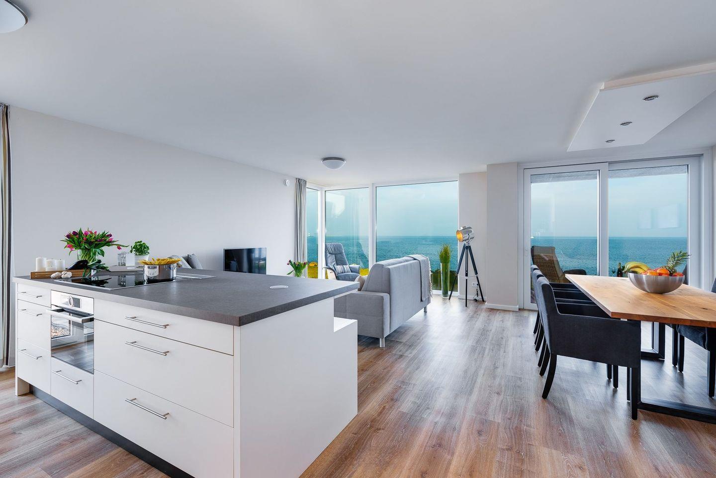 Das Bad mit finnischer Sauna lädt ein, den Blick auf die Ostsee zu genießen. Ein separates Gäste-WC sorgt für Komfort und Privatsphäre. Die moderne offene Küche mit Kochinsel hat alles, um leckere Gerichte zuzubereiten. Das Wohn-Esszimmer bietet immer einen Blick auf vorbeifahrende Segelboote. Das großzügige, offene Wohnkonzept ermöglicht viele gemeinsame Stunden-ohne Abstriche – die Ostsee natürlich immer im Blick.
