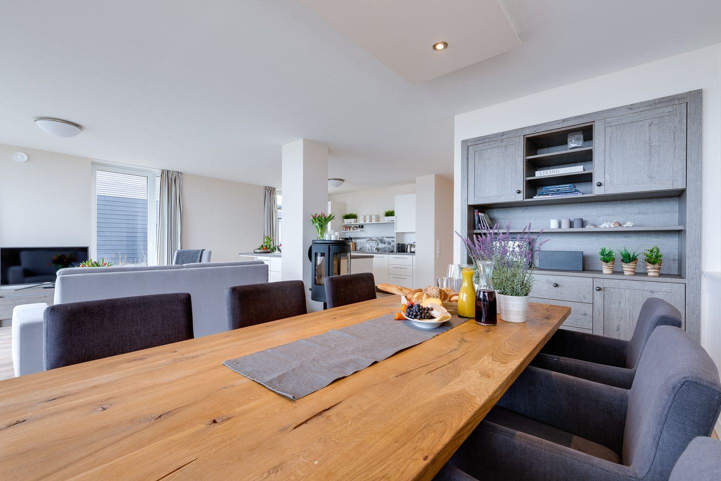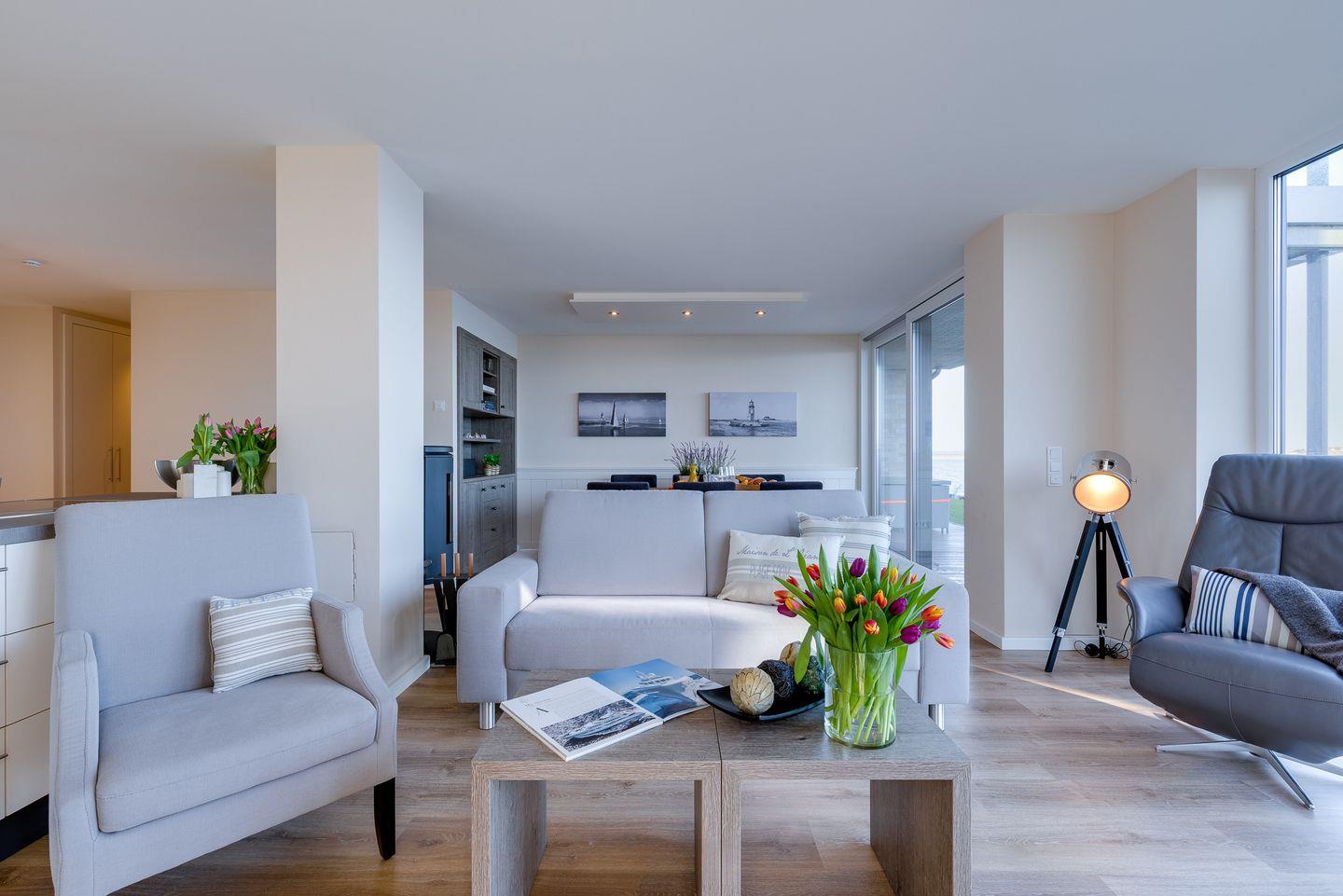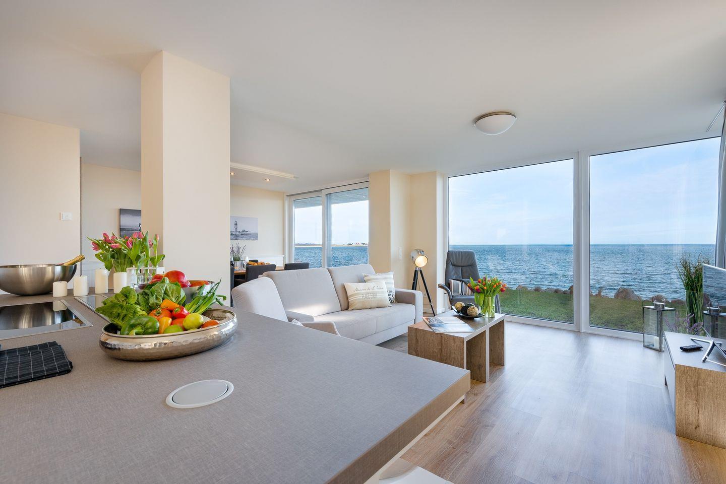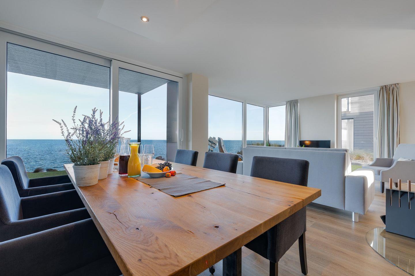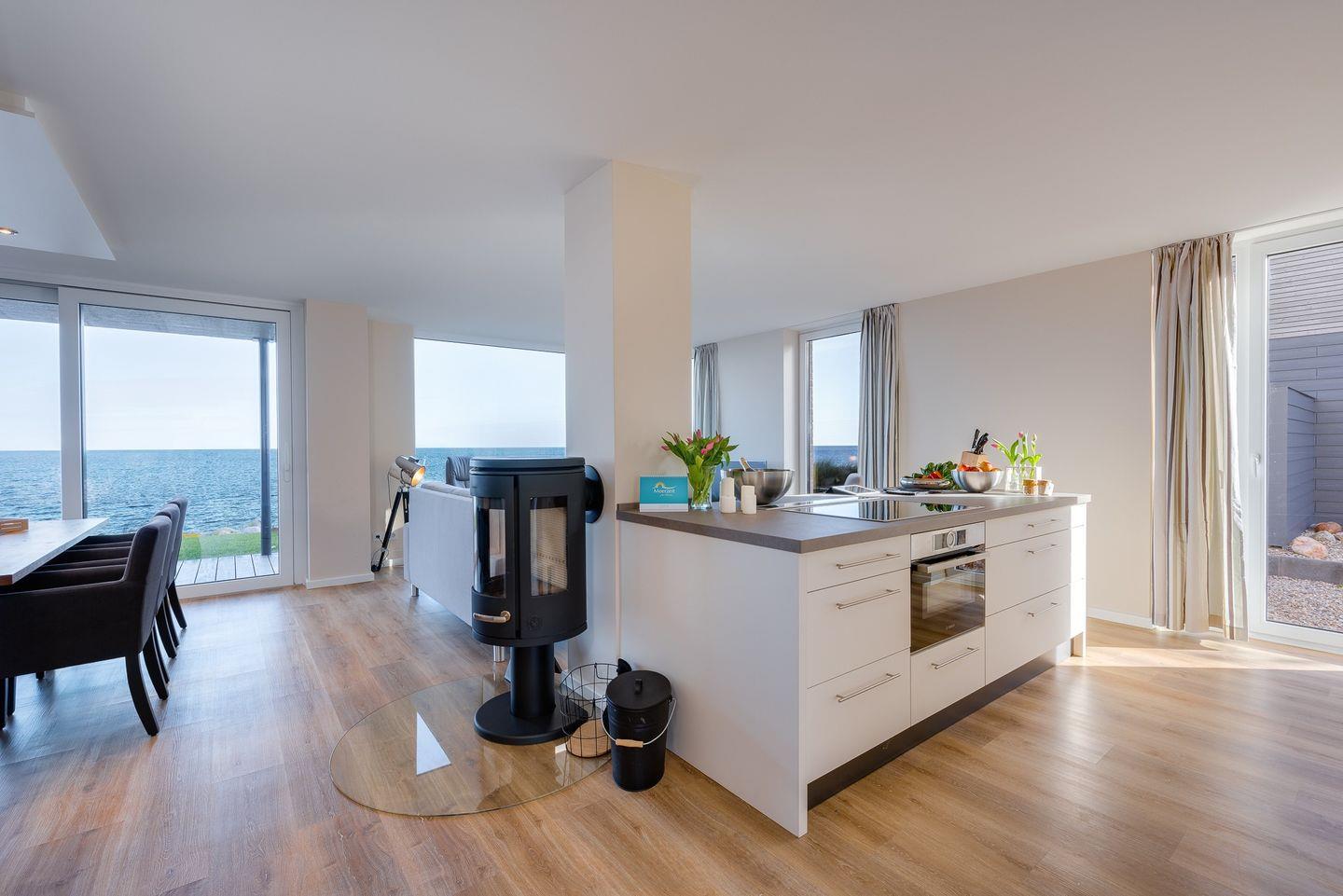 Im offenen Wohn-Esszimmer fällt der Blick auf die Ostsee. Segelboote fahren vorbei, Möwen und Blässhühner sind am Ufer zu sehen. Schilfgräser im Wind umrahmen das Naturschutzgebiet. Die offene Wohnküche mit Kochinsel bietet moderne Ausstattung.