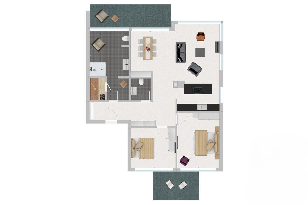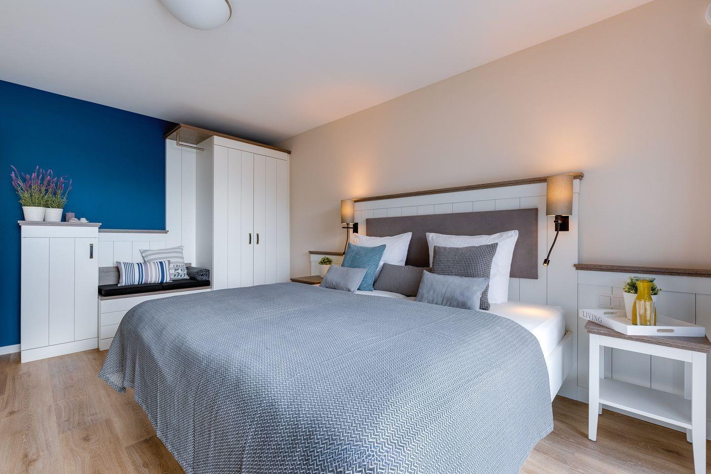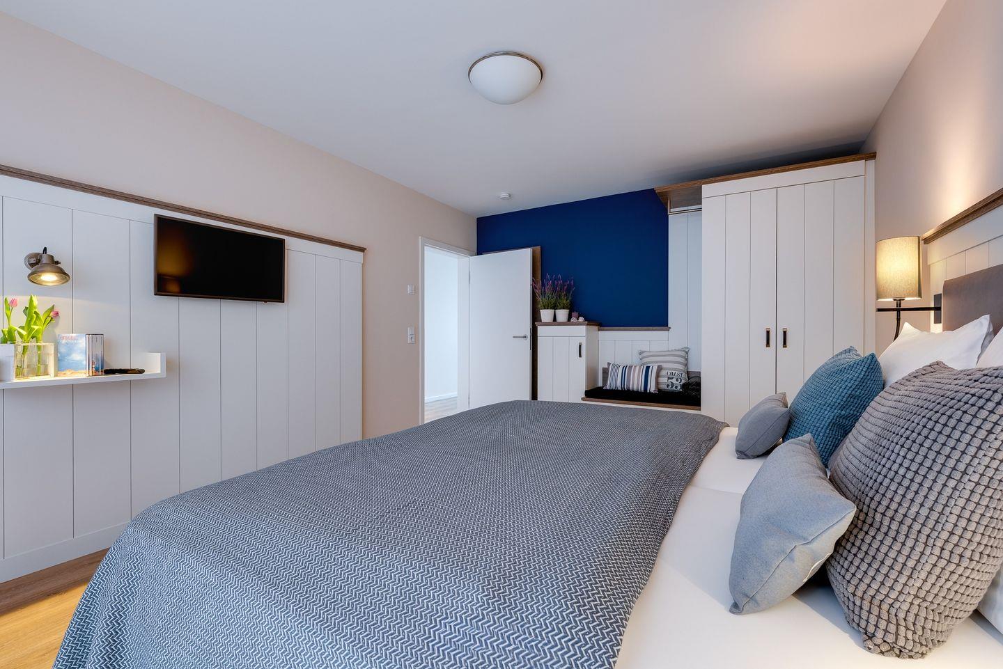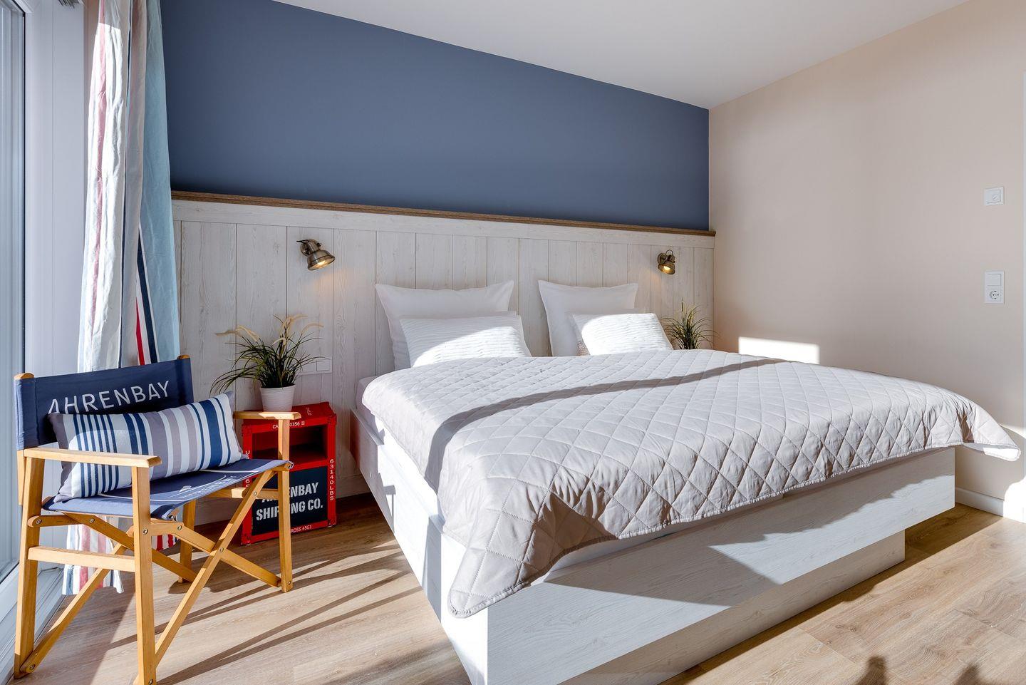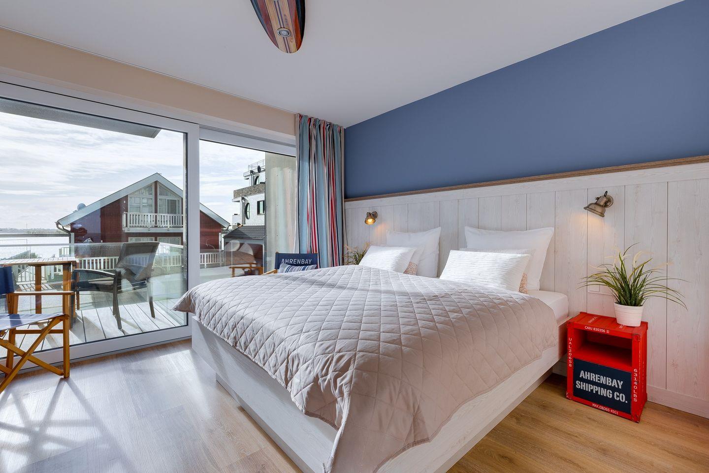 Im Hauptschlafzimmer schauen Sie auf den Hafen. Dort gibt es eine kleine Lese-Ecke mit Bücherregal – ideal, um sich zurückzuziehen und in Ruhe zu lesen. Das zweite Schlafzimmer ist speziell für Kinder gestaltet: Cool, mit Surfbrett an der Decke sowie viel Platz zum Spielen und Entspannen. In beiden Zimmern steht ein Fernseher. Sie finden dort komfortable Betten mit orthopädischen Matratzen für guten Schlaf. Von beiden Zimmern gelangen Sie direkt auf den Südbalkon.
