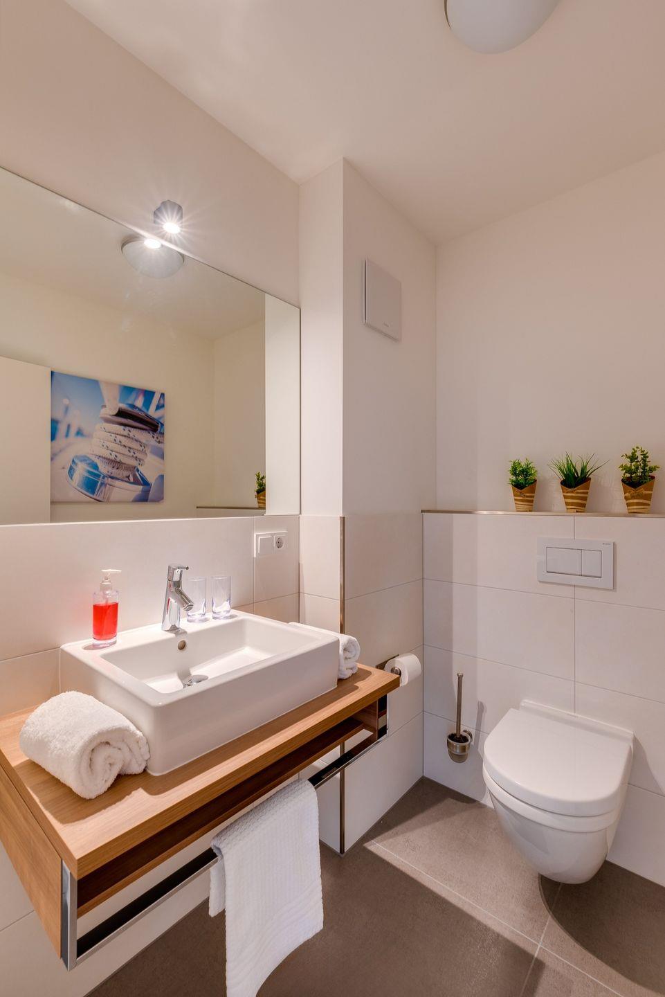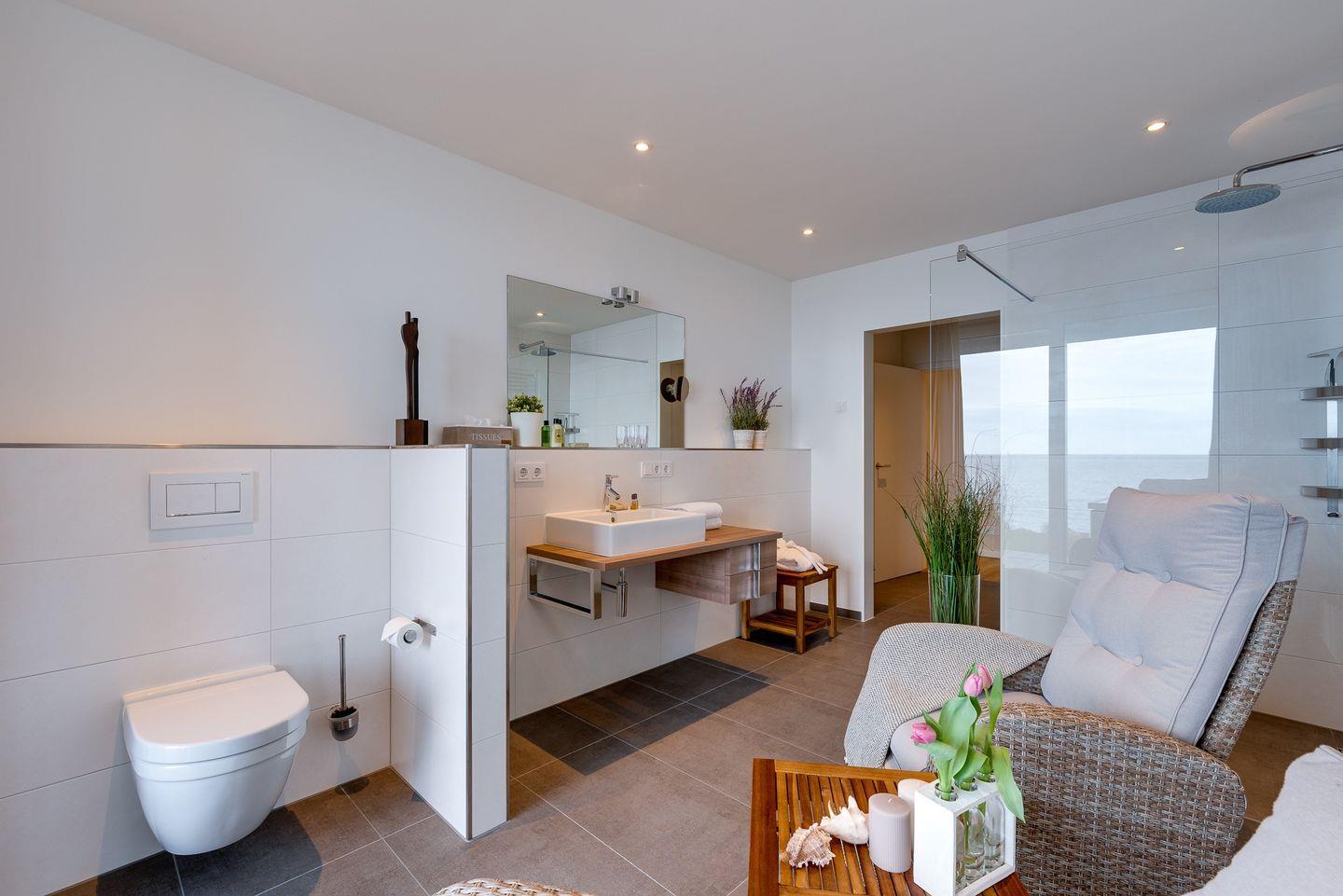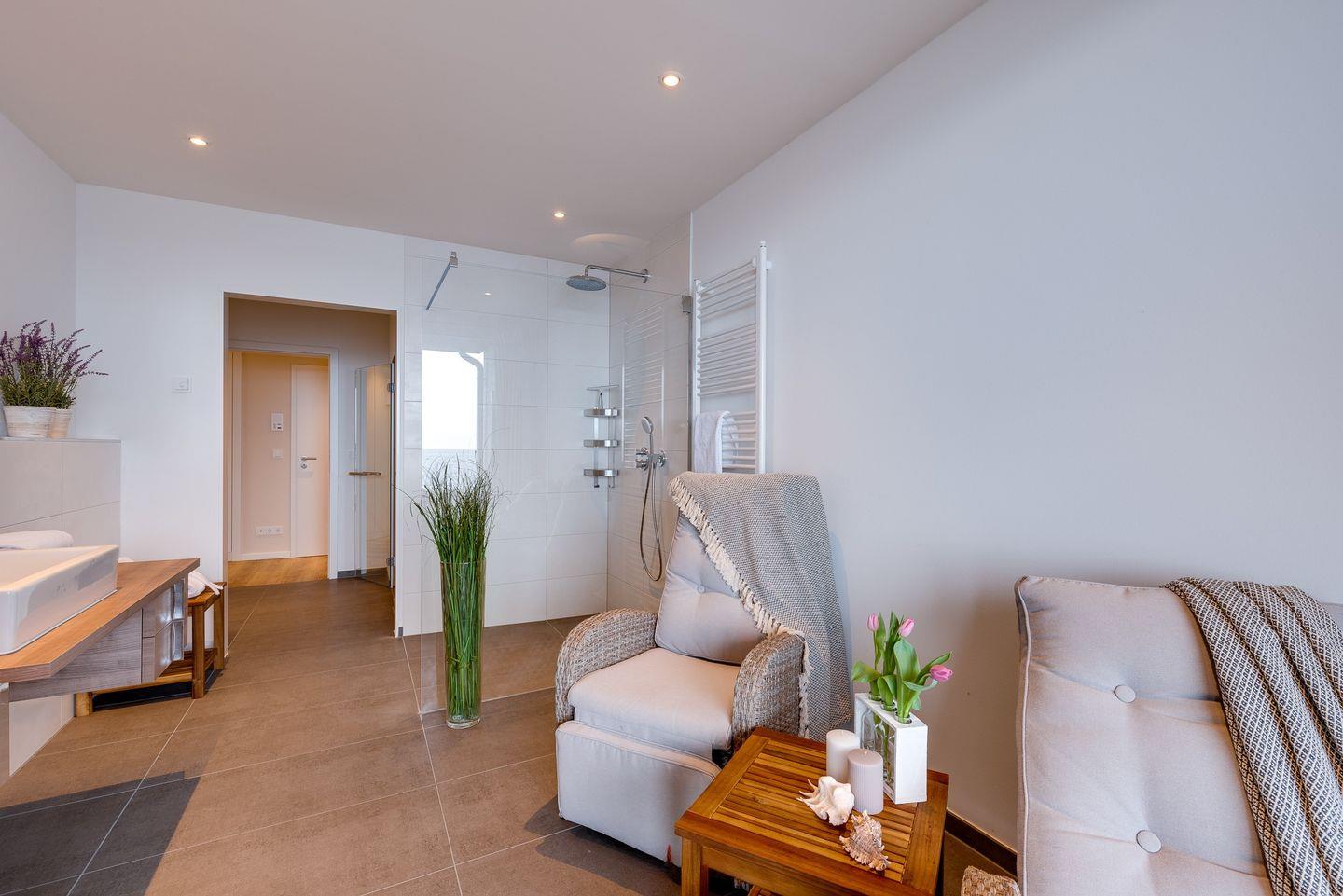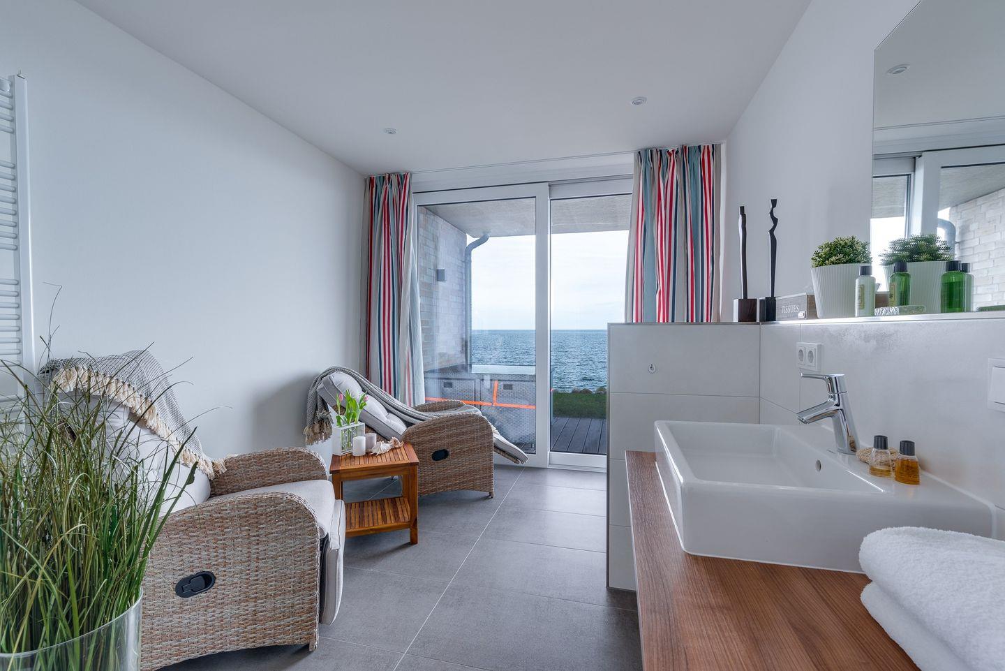 Im Bad erwartet Sie eine finnische Sauna sowie eine Liege, von der Sie die Ostsee sehen. Für Gäste gibt es ein zweites, kleines Bad.