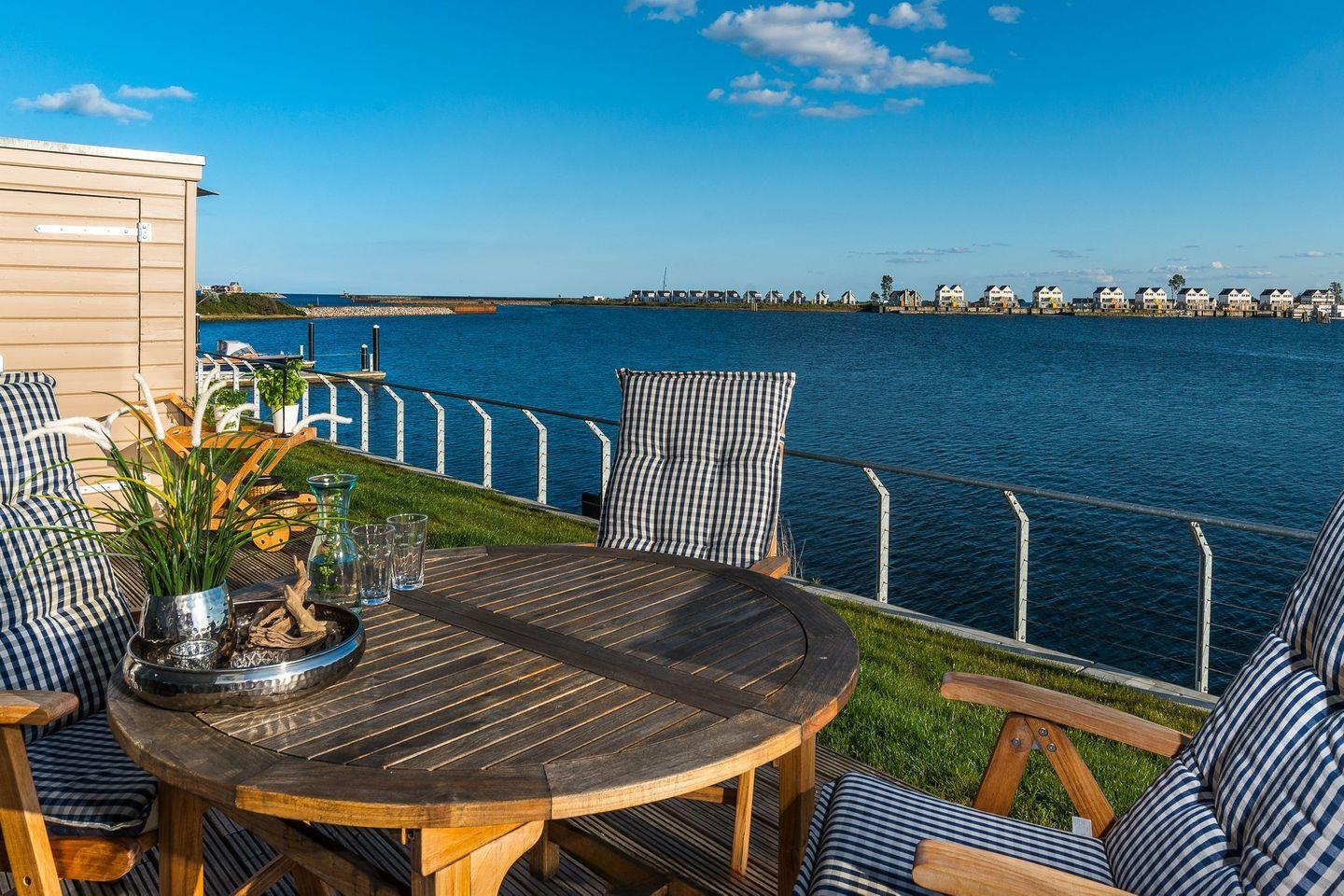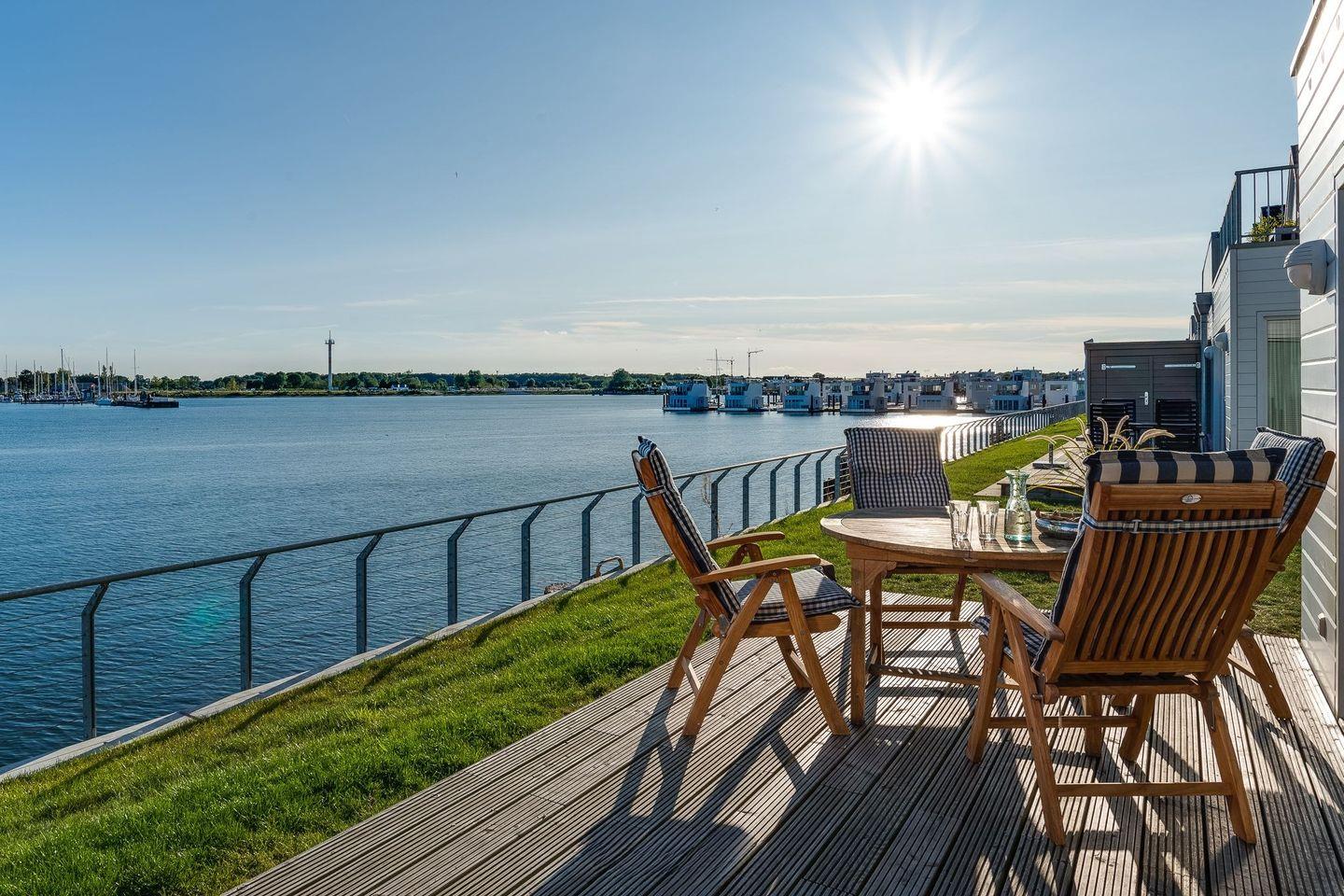 Auf der großen Sonnenterrasse mit Südausrichtung können sie vom Alltag ausspannen und den Segelbooten beim Ein- und Auslaufen zusehen. Die Terrasse verfügt über hochwertige Teakholzmöbel, Sonnenschirm und Grill.