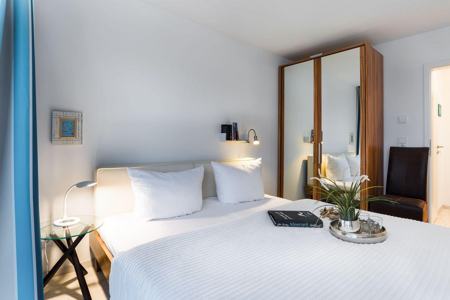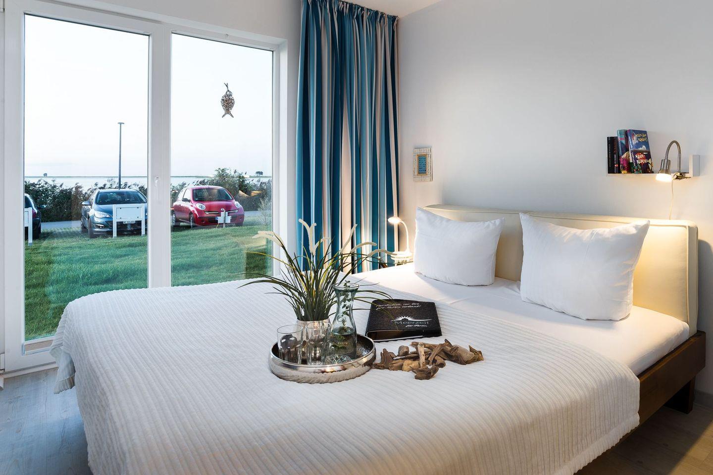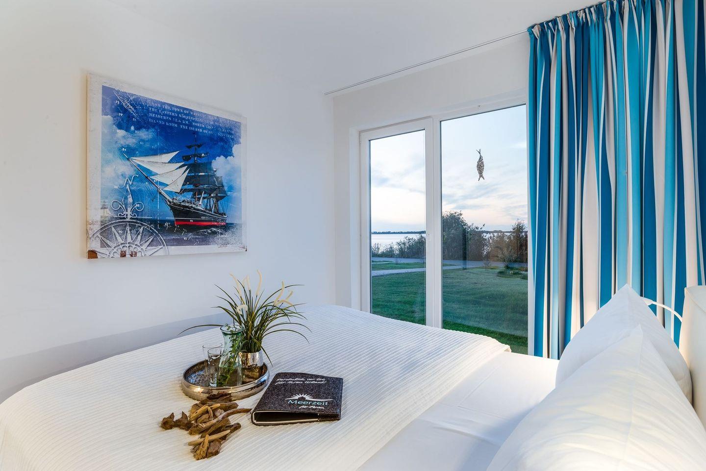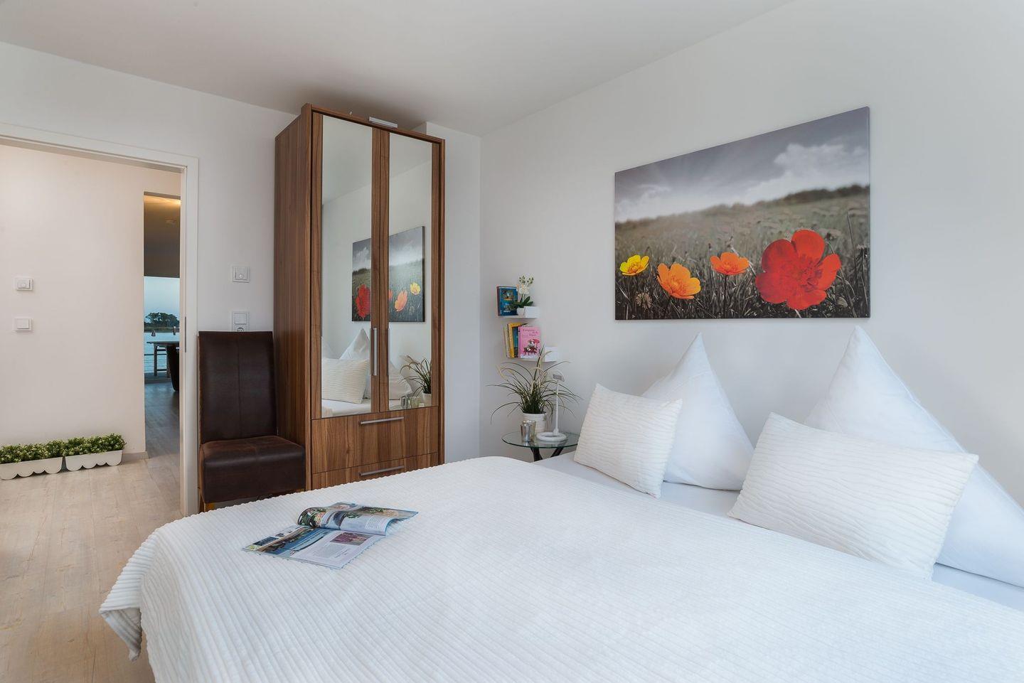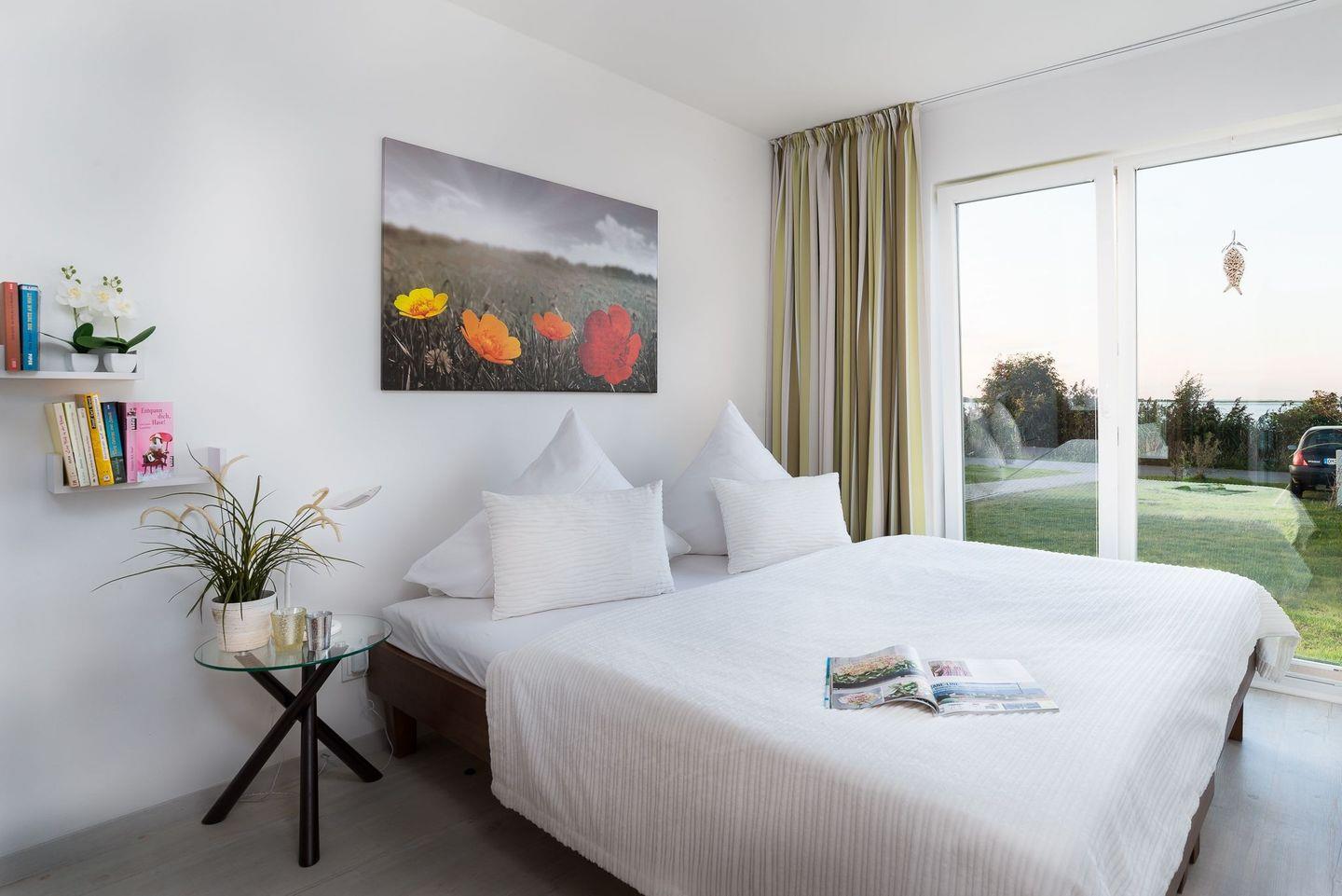 Die Schlafzimmer sind nach Nord/Ost ausgerichtet und garantieren den Blick auf einen wunderbaren Sonnenaufgang über der Schleimündung mit Leuchtturm. Ein Schlafzimmer verfügt über ein gemütliches Doppelbett (1,80 x 2,00), das andere Schlafzimmer über zwei Einzelbetten (0,90 x 2,00). In beiden Schlafzimmer befinden sich hochwertige Matratzen, moderne Kleiderschränke und Nachttische.