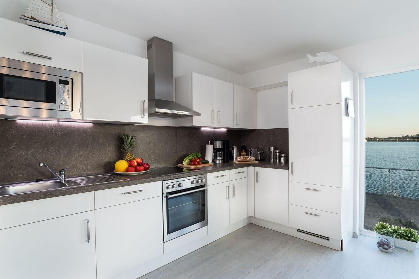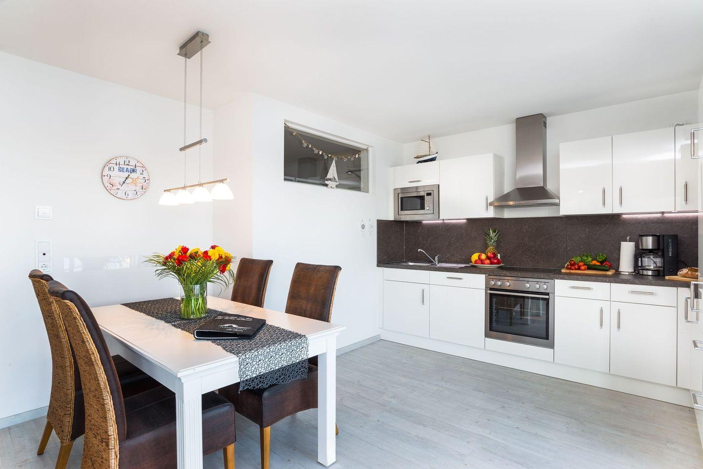 Durch die Integration einer sehr gut ausgestatteten Küchenzeile in den Wohn-Essbereich steht dem gemütlichen Beisammensein und dem Zubereiten von allerlei Köstlichkeiten nichts im Wege.