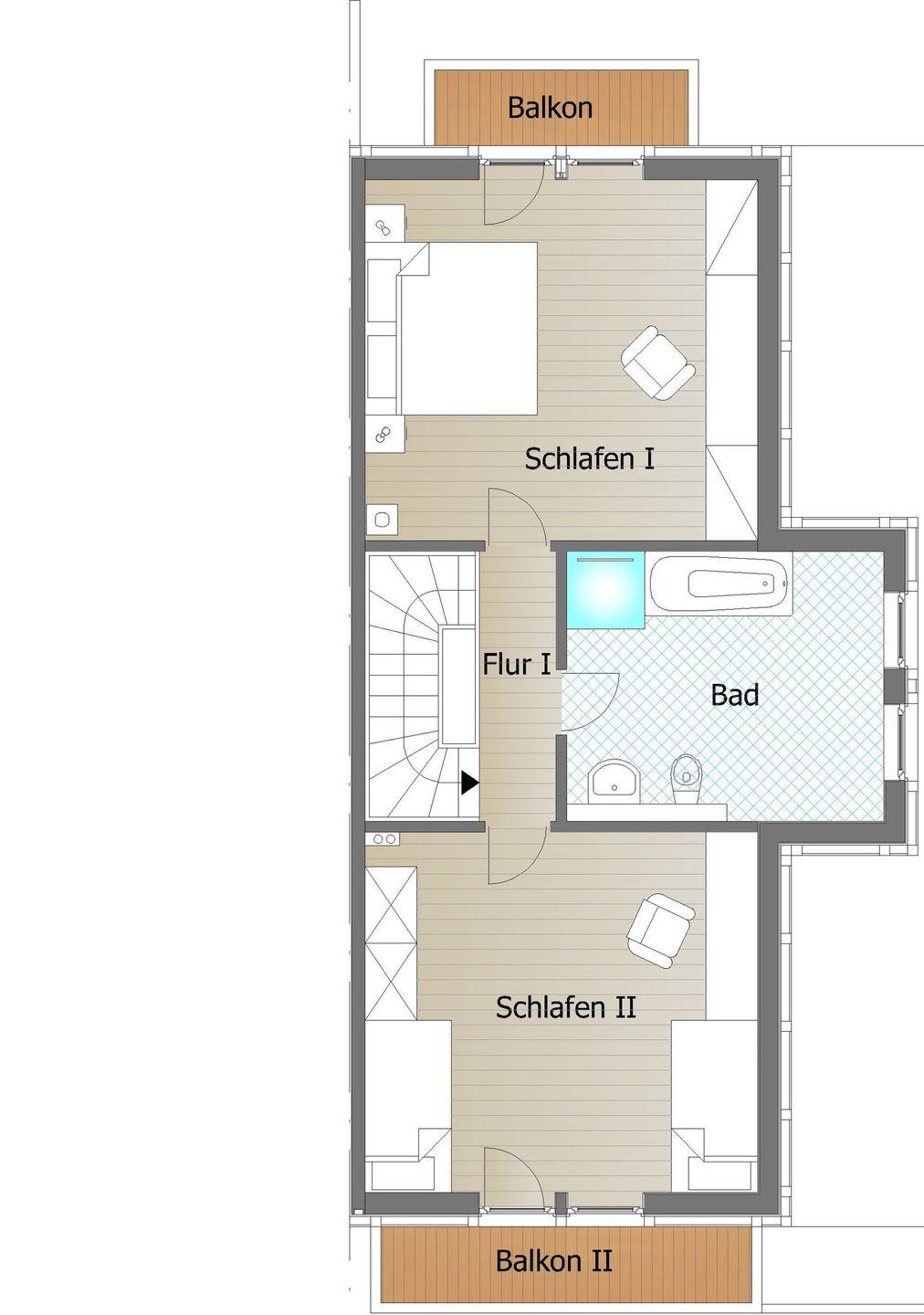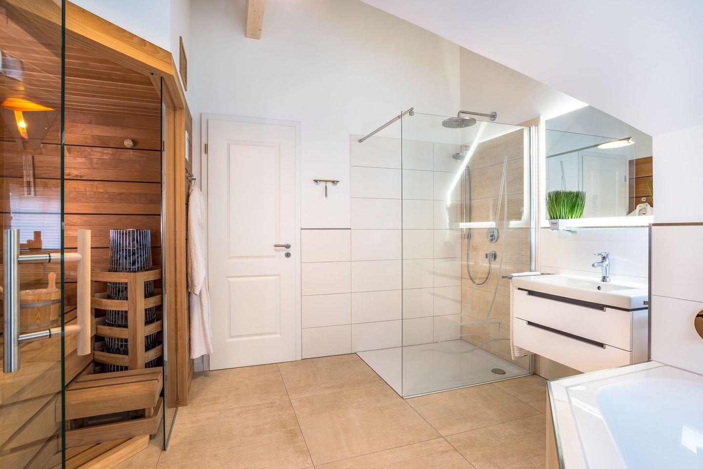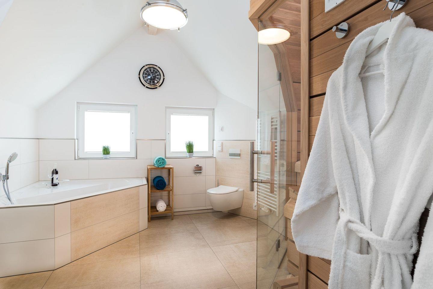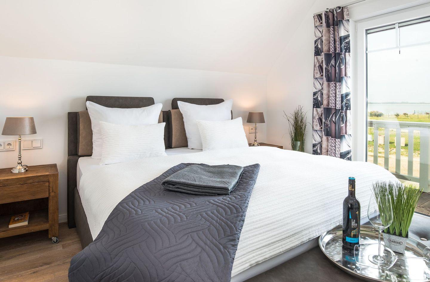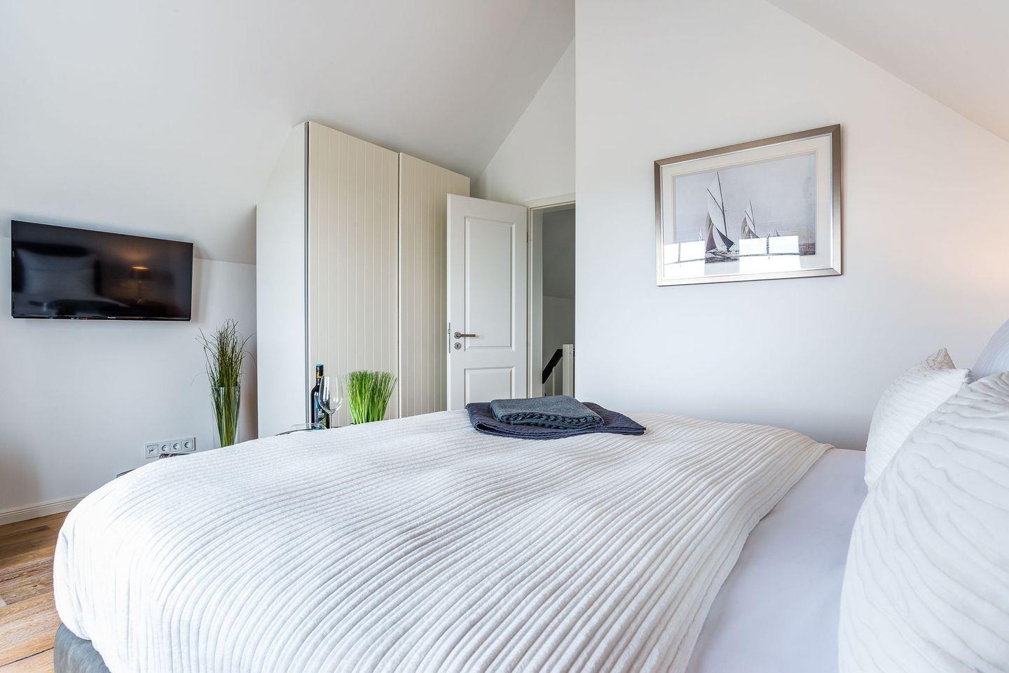Im Obergeschoss befinden sich zwei Schlafzimmer mit hochwertigen Boxspringbetten (1,80 x 2,00 Meter) aus einer Bettenmanufaktur. Beide Schlafzimmer verfügen über einen eigenen TV sowie jeweils einen Balkon mit Blick auf das Wasser. Das Badezimmer bietet eine ebenerdige Dusche, einen Waschtisch, eine Badewanne, ein WC sowie eine finnische Sauna. Ein Bluetooth-Lautsprecher steht für musikalische Unterhaltung bereit. Ein weiteres WC befindet sich im Erdgeschoss.