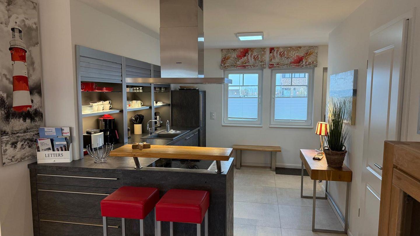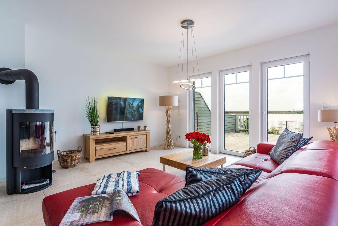 Im Erdgeschoss befindet sich eine moderne Küche, die unseren Gästen die Möglichkeit bietet, Speisen zuzubereiten und dabei den Blick auf vorbeifahrende Segelboote zu genießen. Im angrenzenden, offenen Esszimmer können Sie Ihre Mahlzeiten am Esstisch einnehmen. Anschließend lädt eine Loungeecke vor dem Kamin dazu ein, den Abend bei einem Glas Wein mit Blick auf das Wasser ausklingen zu lassen.