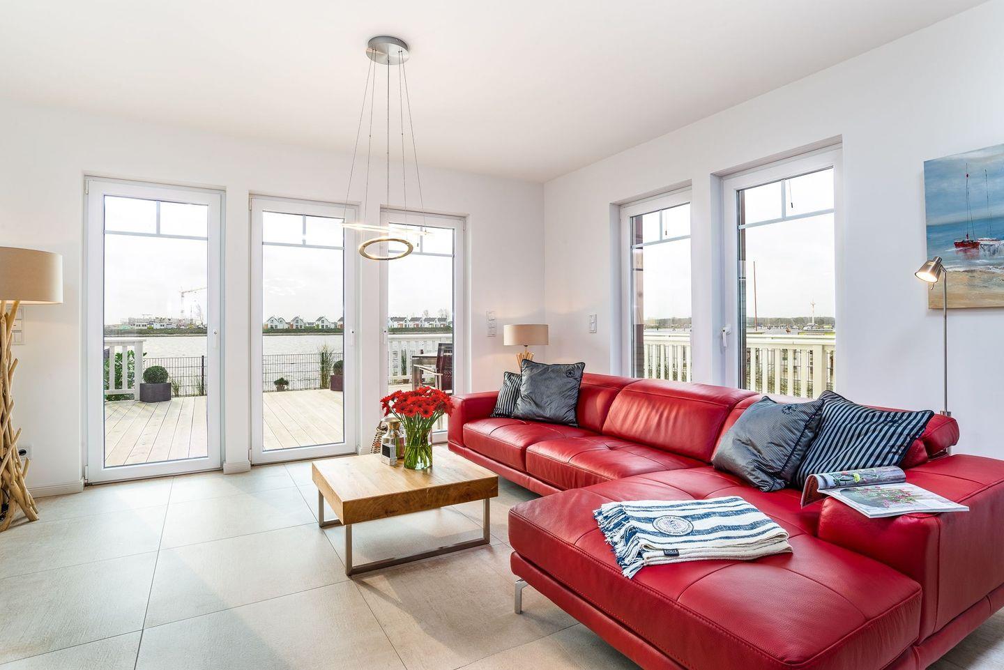 Ankunft auf dem großzügigen Parkplatz mit angrenzender E-Ladesäule, Eintritt in ein lichtdurchflutetes Erdgeschoss mit Wasserblick: Ostseeurlaub genießen und entspannen!