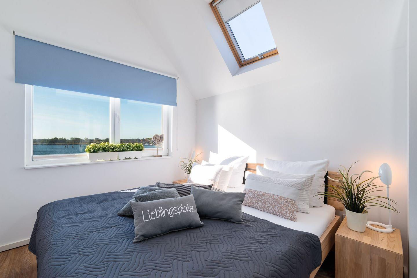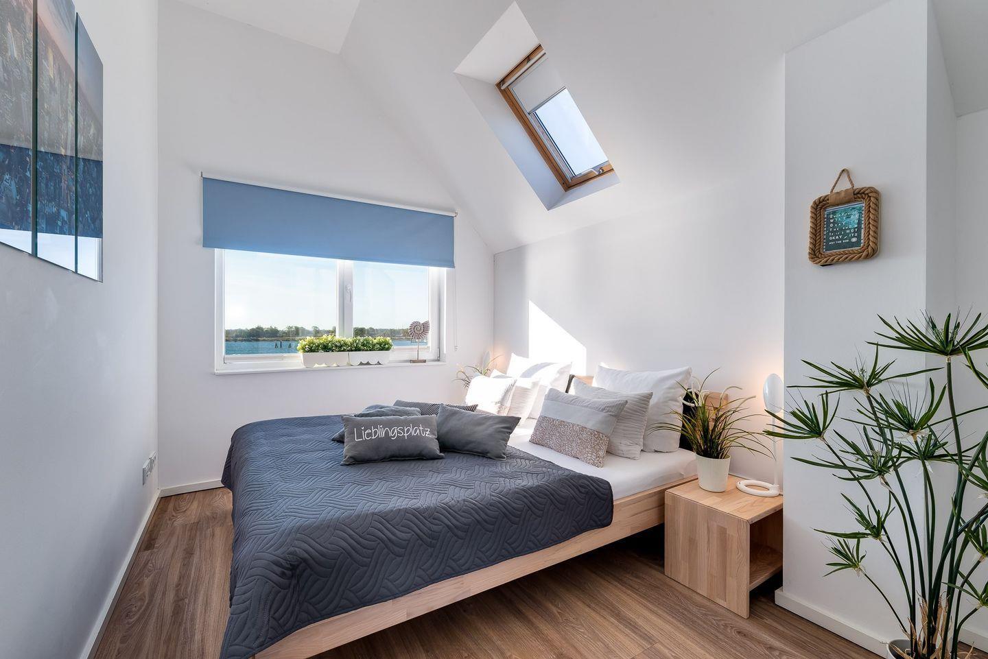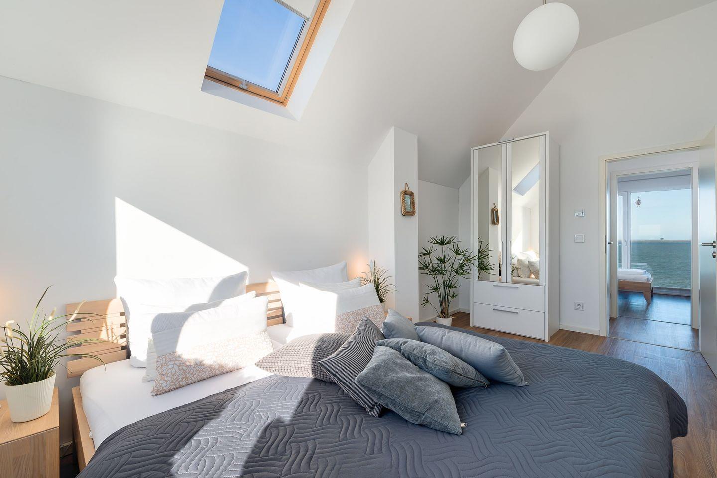 Im Dachgeschoss befinden sich zwei Schlafzimmer und ein Badezimmer mit Sauna und Whirlpool. Das große Badezimmer lädt auch bei schlechtem Wetter zum Entspannen und Relaxen ein. Ein Whirlpool und eine Sauna mit Blick auf den Hafen lassen Sie die Zeit vergessen. Aus beiden Schlafzimmern ist der Wasserblick garantiert. Alle Betten sind mit hochwertigen Matratzen ausgestattet, so dass man gern auch einmal länger liegen bleibt und den Ausblick bei einer Tasse Kaffee genießt.