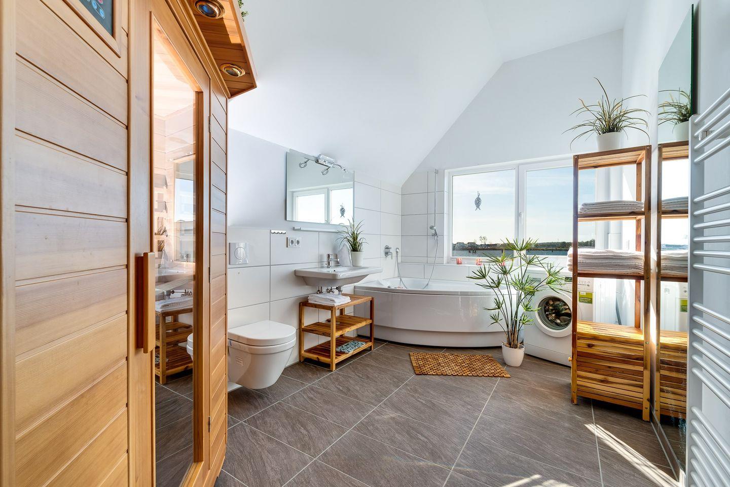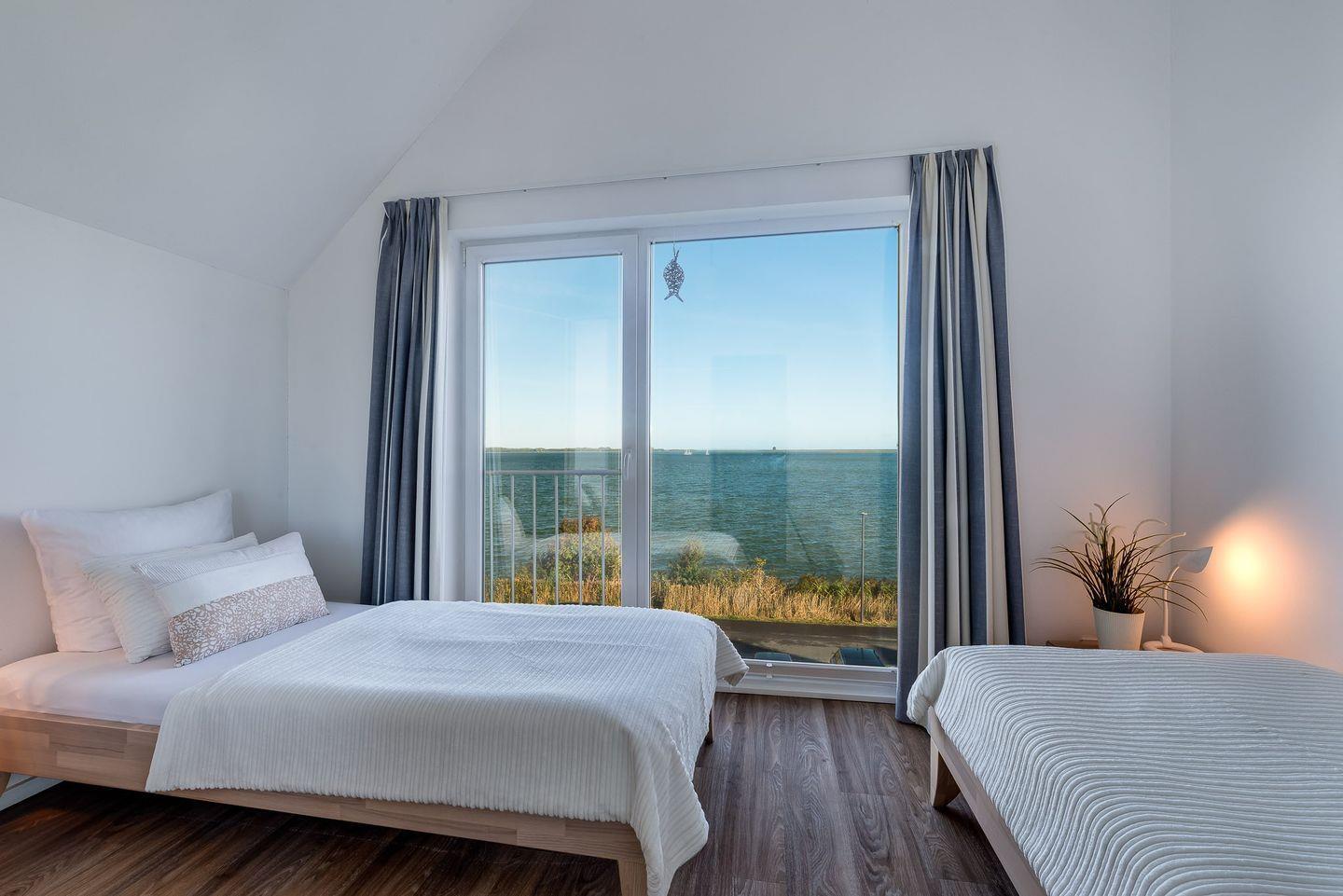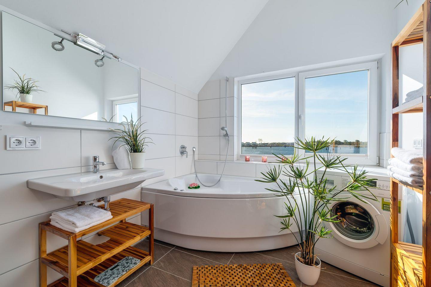 Im Dachgeschoss befinden sich zwei Schlafzimmer und ein Badezimmer mit Sauna und Whirlpool. Das große Badezimmer lädt auch bei schlechtem Wetter zum Entspannen und Relaxen ein. Ein Whirlpool und eine Sauna mit Blick auf den Hafen lassen Sie die Zeit vergessen. Aus beiden Schlafzimmern ist der Wasserblick garantiert. Alle Betten sind mit hochwertigen Matratzen ausgestattet, so dass man gern auch einmal länger liegen bleibt und den Ausblick bei einer Tasse Kaffee genießt.