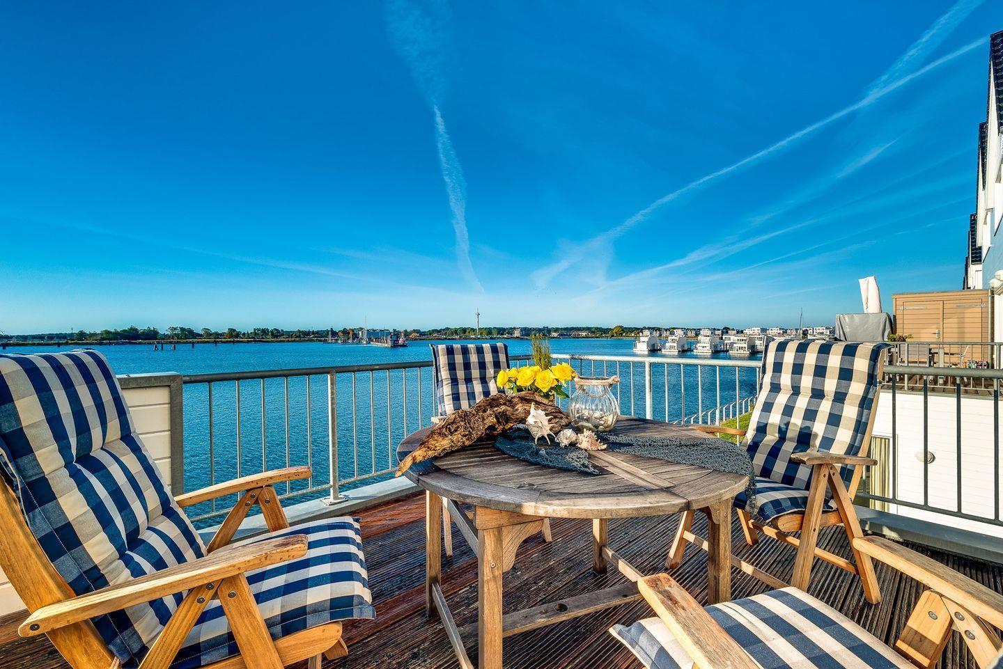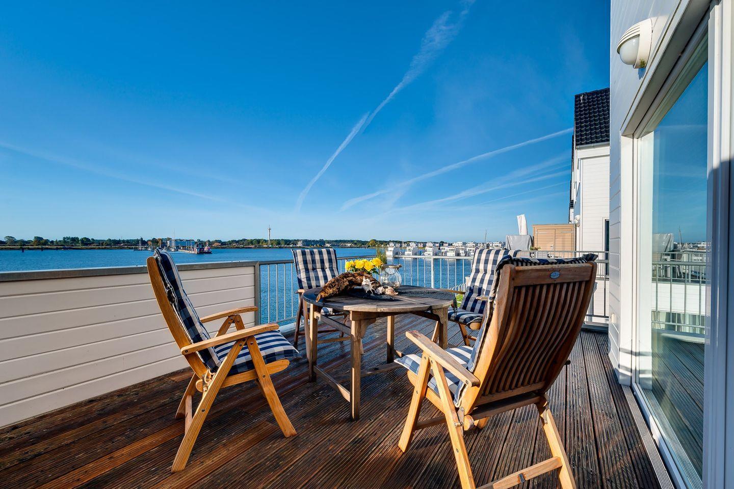 Vom Wohnbereich aus gelangt man auf die 25 qm große Sonnenterrasse mit Südausrichtung. Die Terrasse ist mit hochwertigen Teakholzmöbeln für 6 Personen, Sonnenschirm und Elektro-Grill ausgestattet. Der Blick über den Hafen und auf die Ostsee lädt zum Entspannen und Genießen ein.