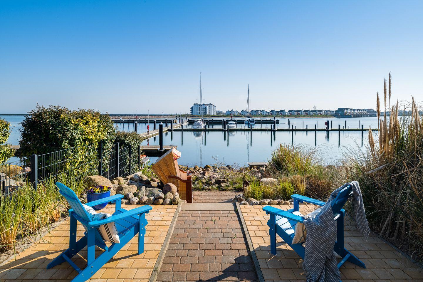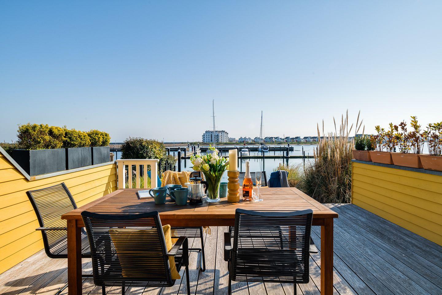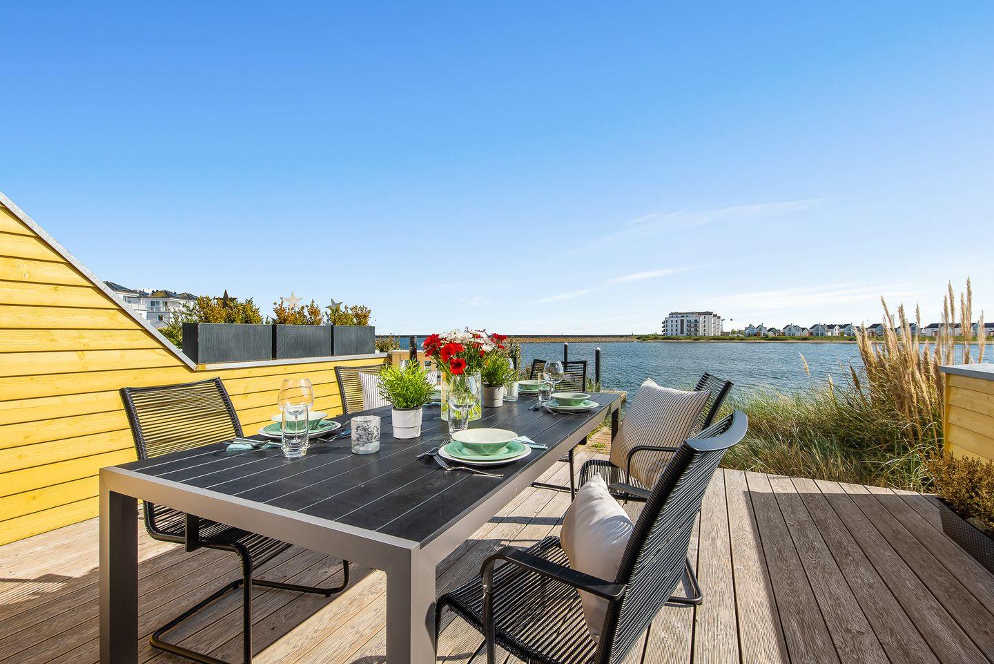 Die große Terrasse mit Zugang vom Wohnzimmer liegt direkt am Wasser. Sie ist nach Süden ausgerichtet und mit Gartenmöbeln ausgestattet. Ein Grill ermöglicht die Zubereitung von Speisen im Freien. Ein Strandkorb steht für windige Tage bereit. Von hier aus können Sie das Geschehen im Hafen und das Ein- und Auslaufen der Segelschiffe beobachten.