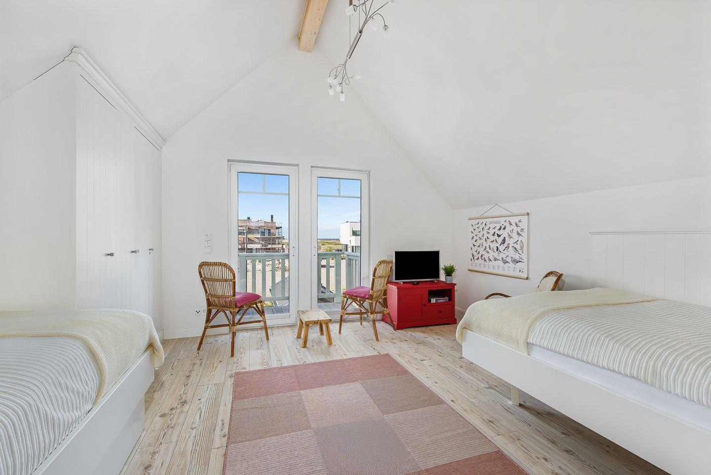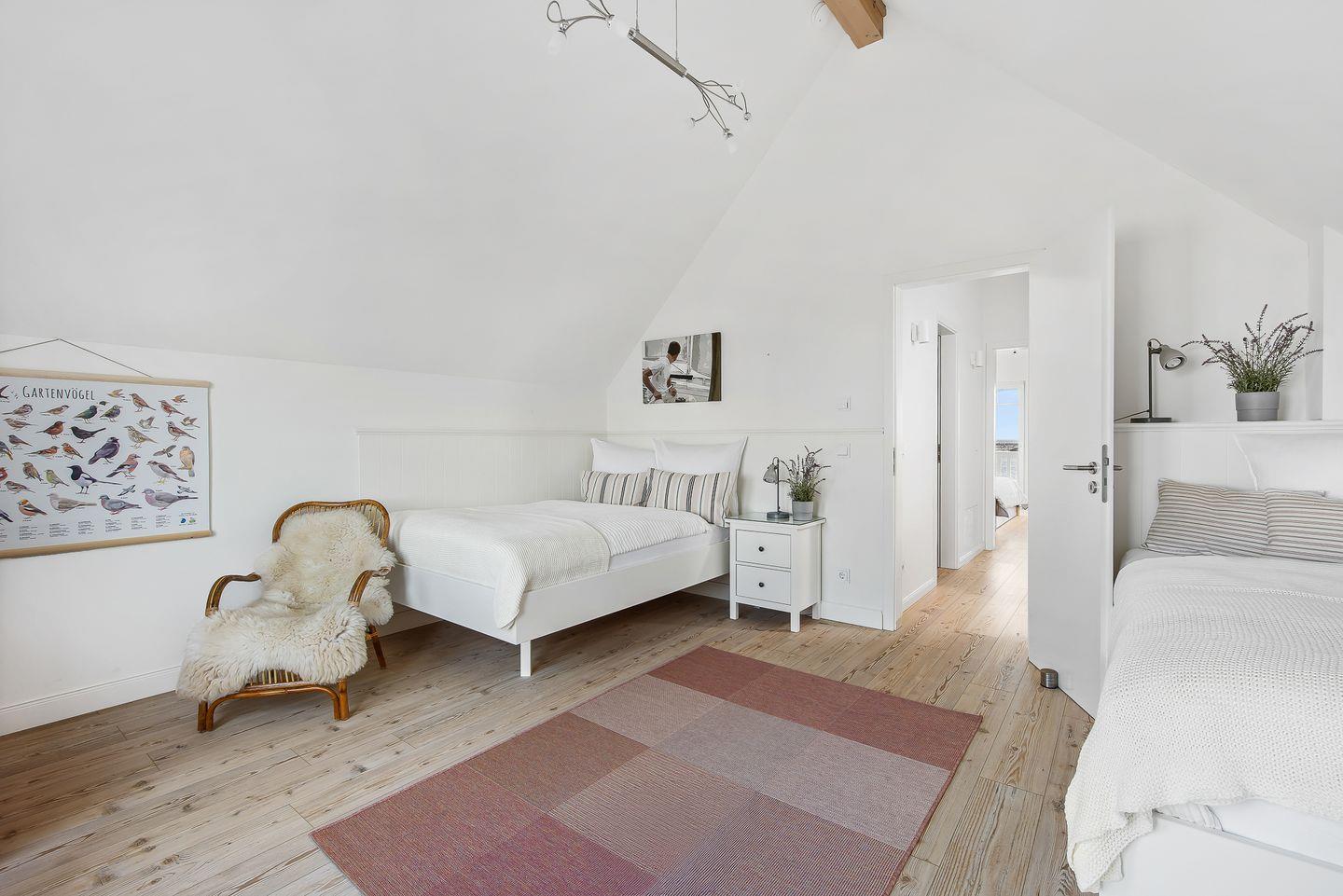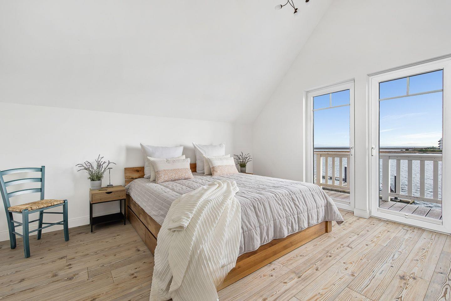 Im Obergeschoss des Ferienhaus „Emily“ befinden sich die beiden Schlafräume. Ein Schlafzimmer verfügt über ein Doppelbett (1,80 x 2,00 m), einen Kleiderschrank und einen Flachbildfernseher. Von diesem Zimmer aus haben Sie Zugang zum Balkon und einen Ausblick über die Hafeneinfahrt des Ostseeresorts.Ein weiteres Schlafzimmer auf der gegenüberliegenden Seite des Obergeschosses bietet ein Doppelbett (1,40 x 2,00 m), ein Einzelbett (1,00 x 2,00 m) und ein Ausziehbett (0,90 x 1,90 m). Dieses Zimmer ist ebenfalls mit einem Kleiderschrank und einer Fußbodenheizung ausgestattet.