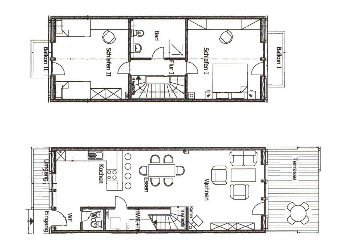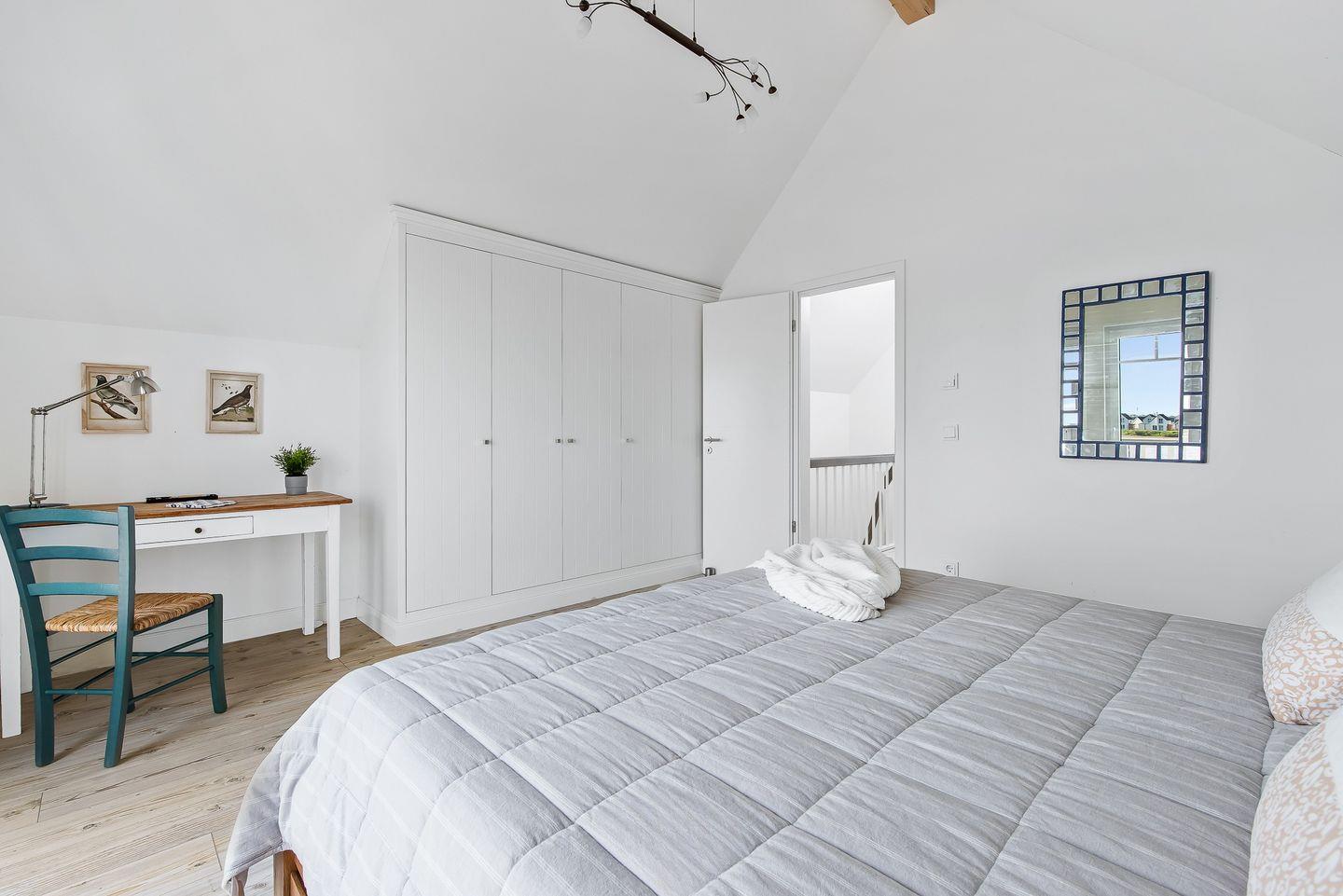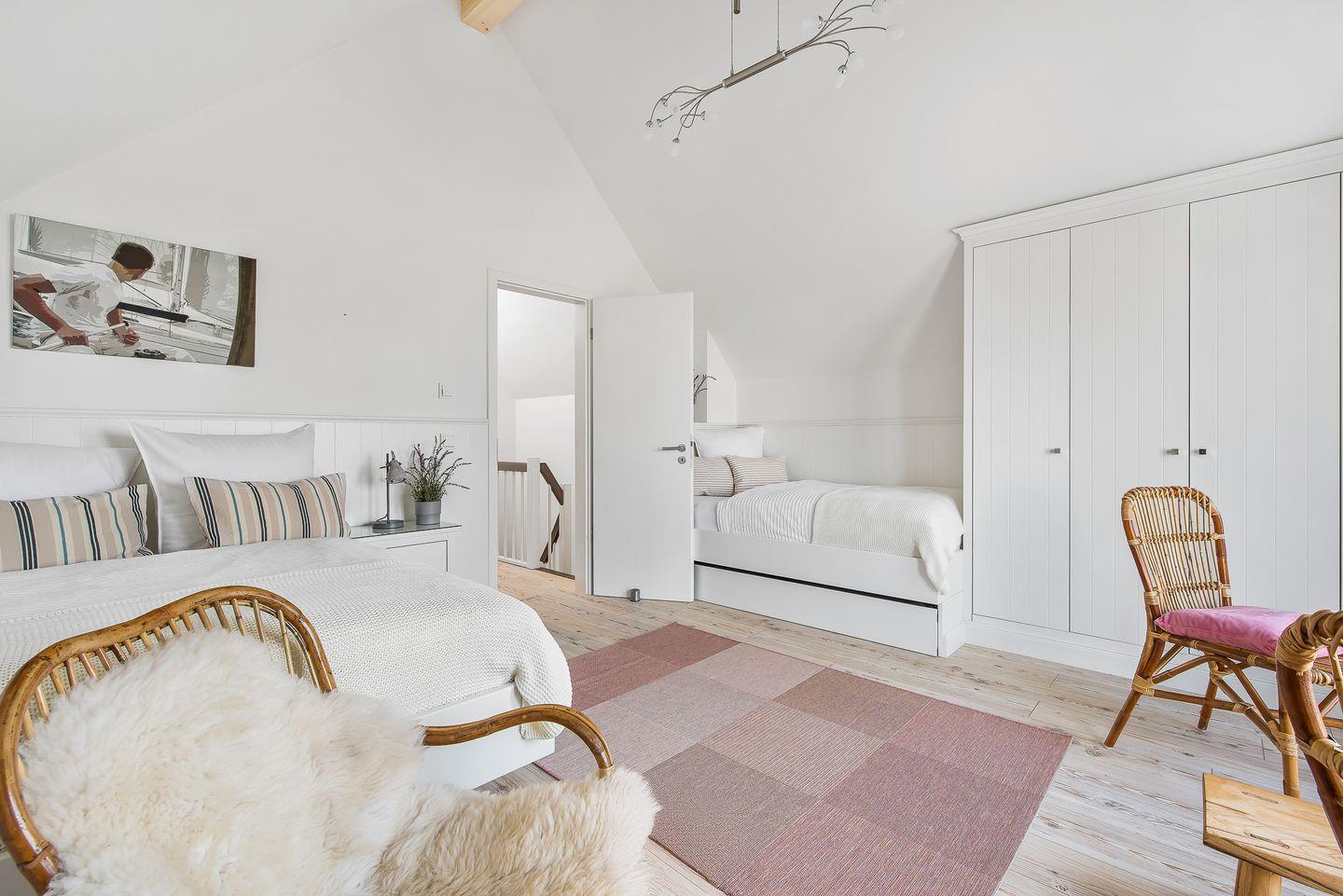 Im Obergeschoss des Ferienhaus „Emily“ befinden sich die beiden Schlafräume. Ein Schlafzimmer verfügt über ein Doppelbett (1,80 x 2,00 m), einen Kleiderschrank und einen Flachbildfernseher. Von diesem Zimmer aus haben Sie Zugang zum Balkon und einen Ausblick über die Hafeneinfahrt des Ostseeresorts.Ein weiteres Schlafzimmer auf der gegenüberliegenden Seite des Obergeschosses bietet ein Doppelbett (1,40 x 2,00 m), ein Einzelbett (1,00 x 2,00 m) und ein Ausziehbett (0,90 x 1,90 m). Dieses Zimmer ist ebenfalls mit einem Kleiderschrank und einer Fußbodenheizung ausgestattet.