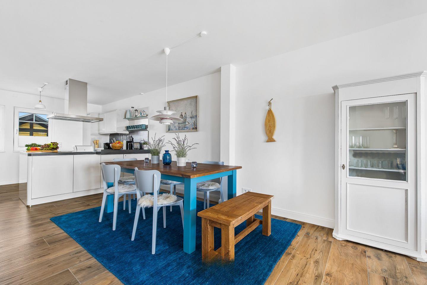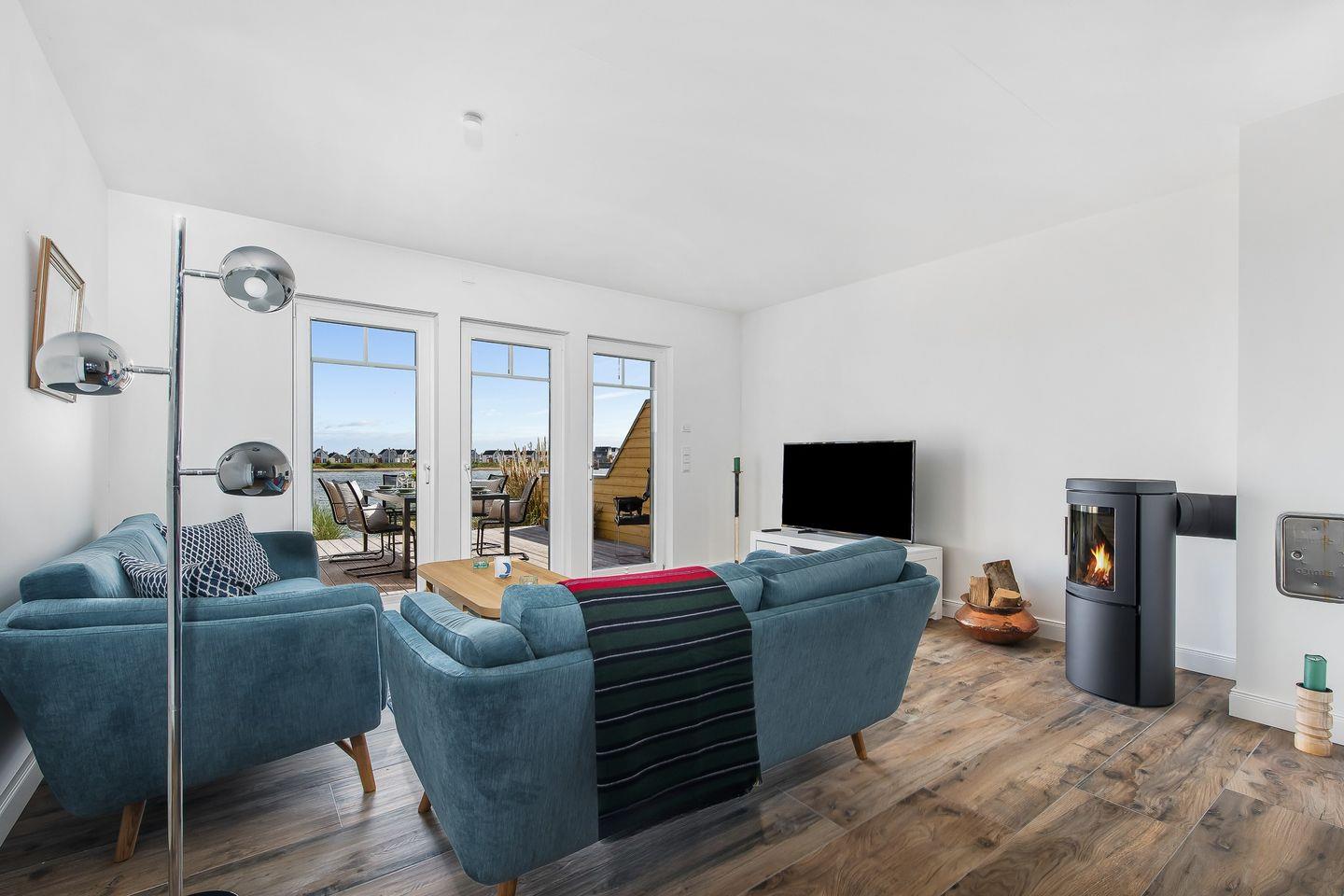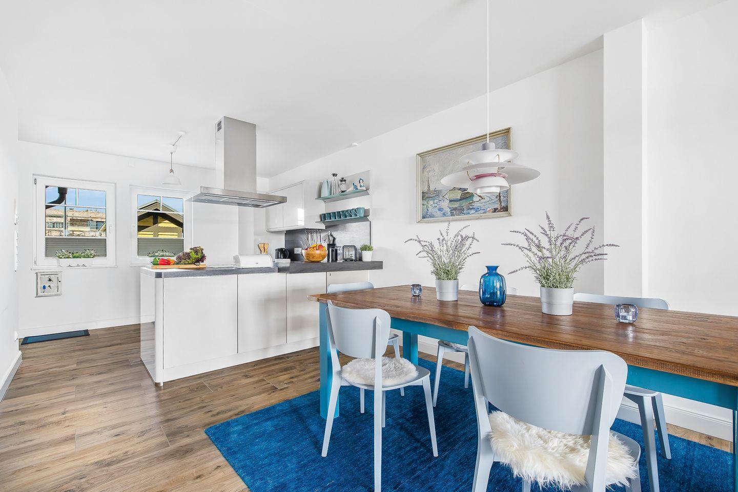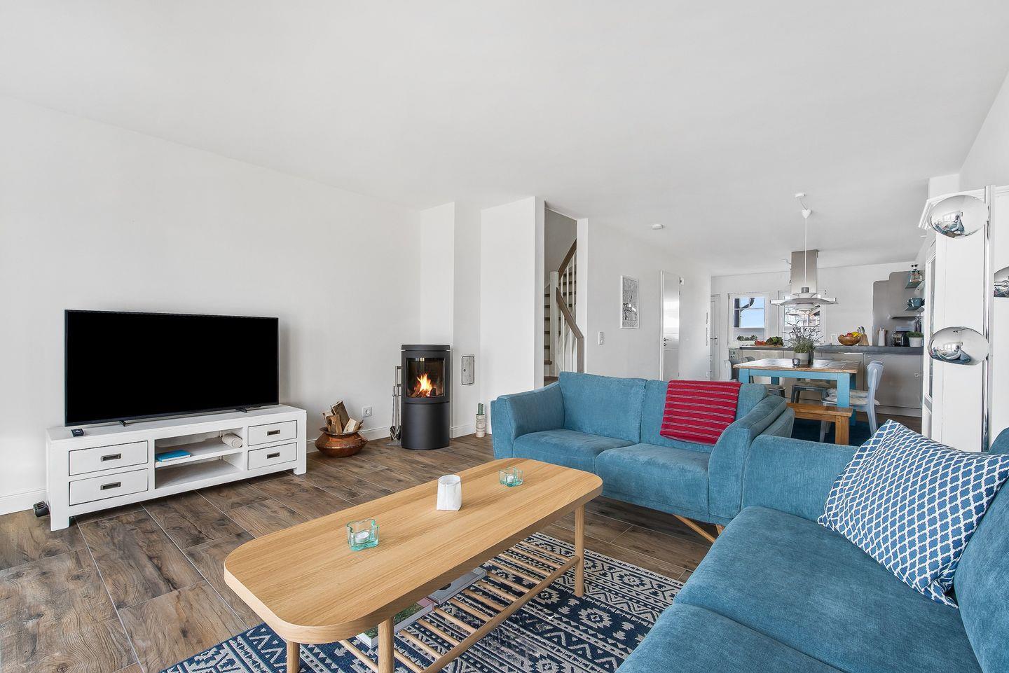 Im Erdgeschoss des Ferienhaus „Emily“ befindet sich eine moderne Küche, die zum Zubereiten von Speisen einlädt. Währenddessen können Sie den Blick auf die vorbeifahrenden Segelschiffe genießen. Der angrenzende, offen gestaltete Wohn- und Essbereich ist mit einem Kaminofen ausgestattet. Eine großzügige Wohnlandschaft dient der Entspannung, während der Esstisch gemeinsame Mahlzeiten mit der Familie ermöglicht.