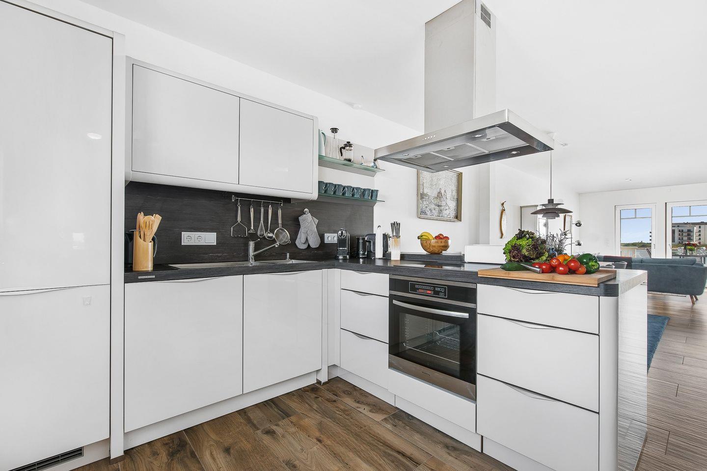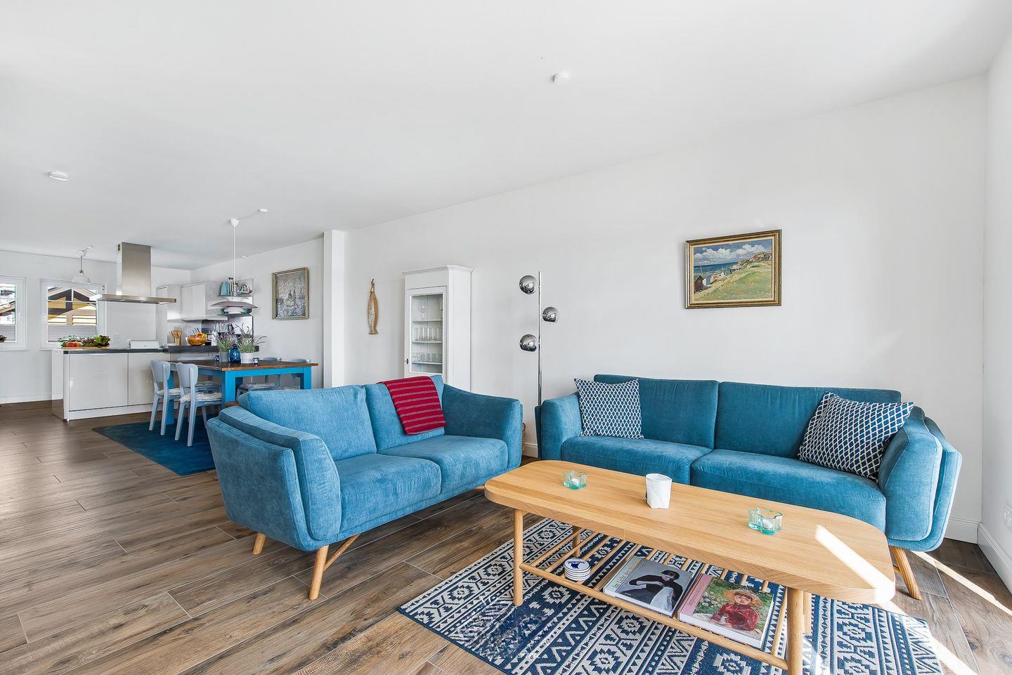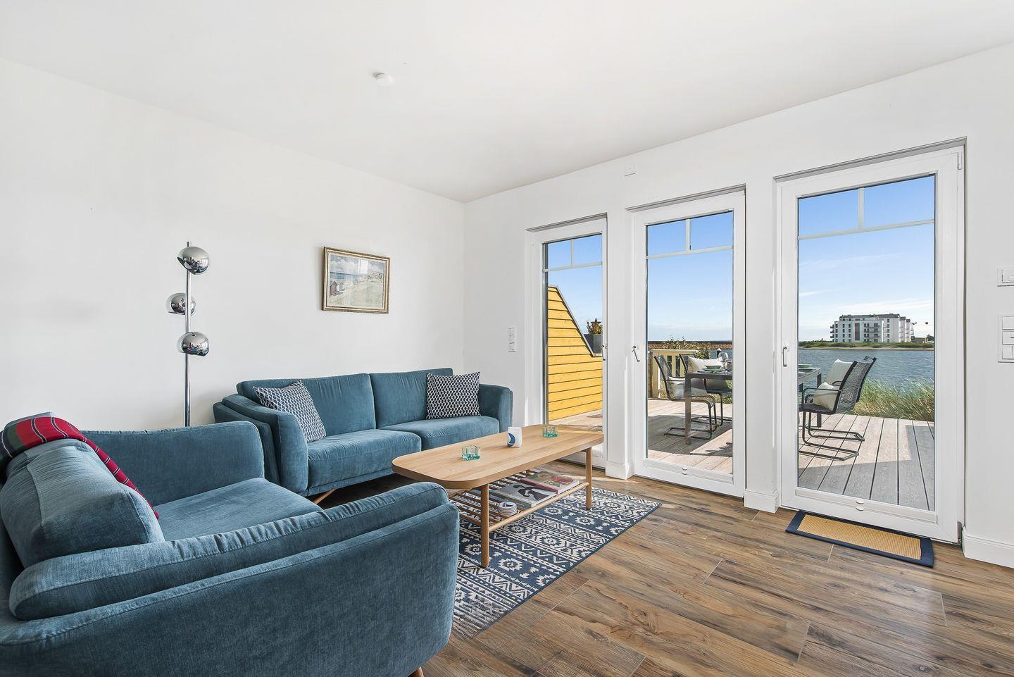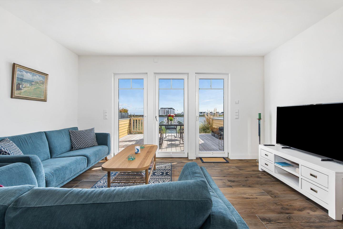 Im Erdgeschoss des Ferienhaus „Emily“ befindet sich eine moderne Küche, die zum Zubereiten von Speisen einlädt. Währenddessen können Sie den Blick auf die vorbeifahrenden Segelschiffe genießen. Der angrenzende, offen gestaltete Wohn- und Essbereich ist mit einem Kaminofen ausgestattet. Eine großzügige Wohnlandschaft dient der Entspannung, während der Esstisch gemeinsame Mahlzeiten mit der Familie ermöglicht.