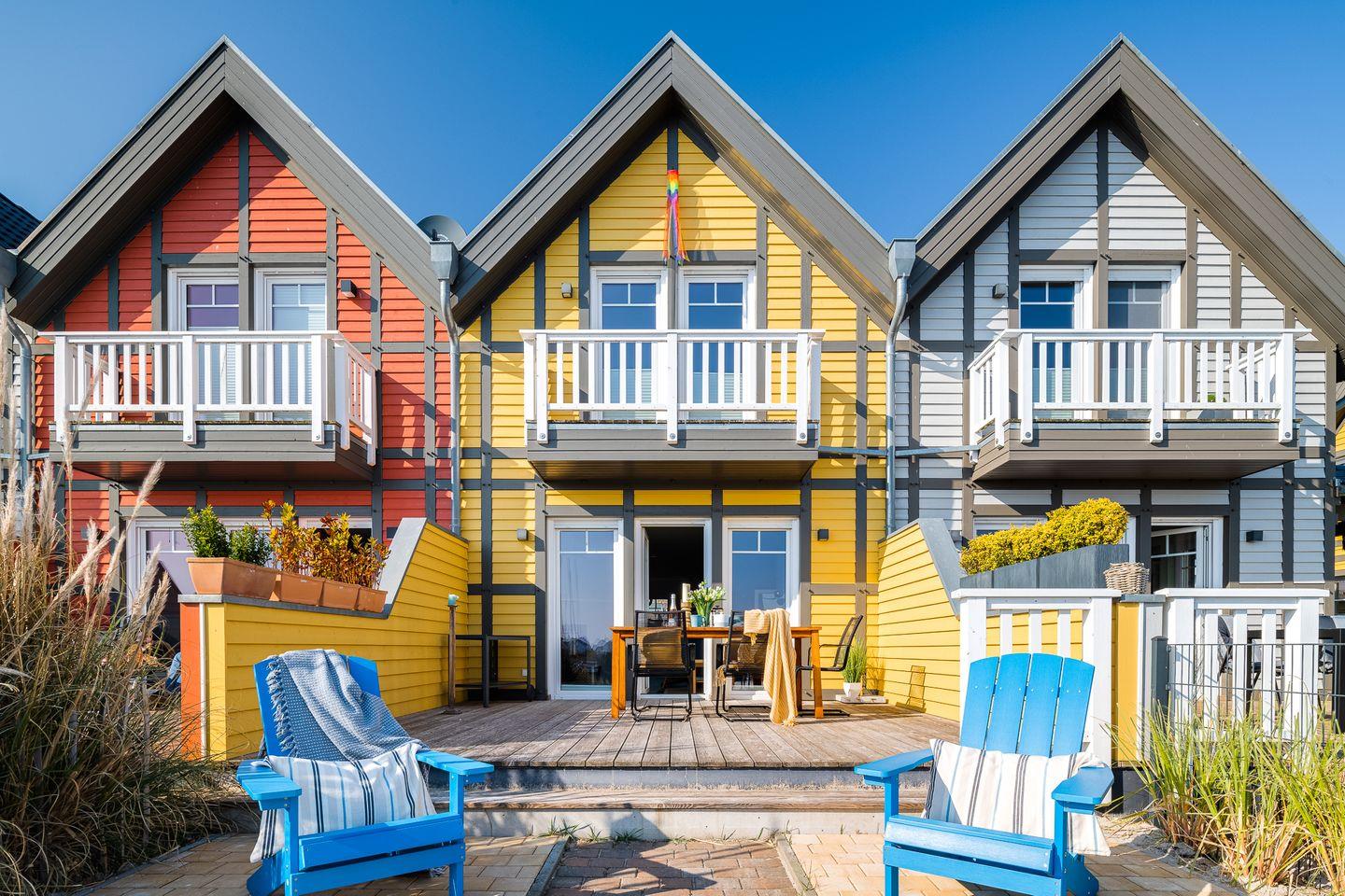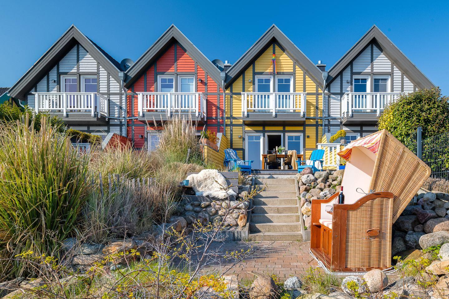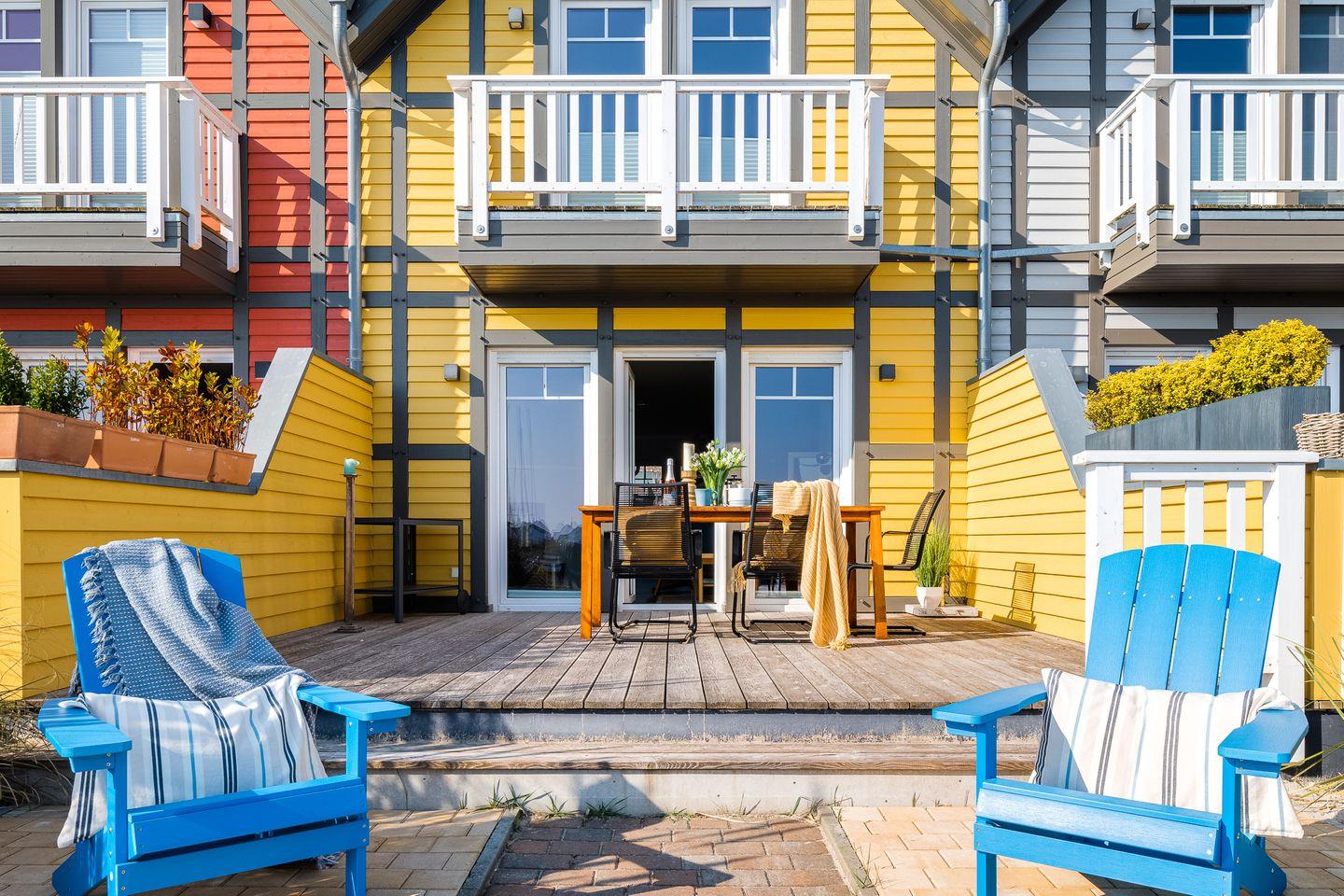 Das Ostsee-Ferienhaus „Emily“ mit der gelben Fassade befindet sich in direkter Lage am Yachthafen und bietet einen angenehmen Aufenthalt. Es ermöglicht einen erholsamen Urlaub.