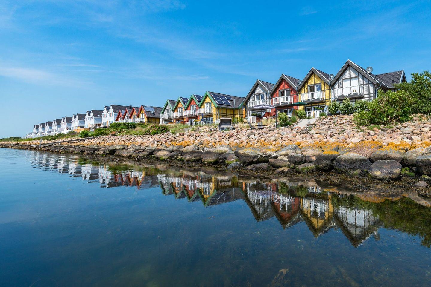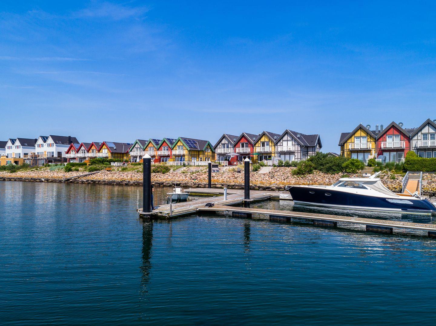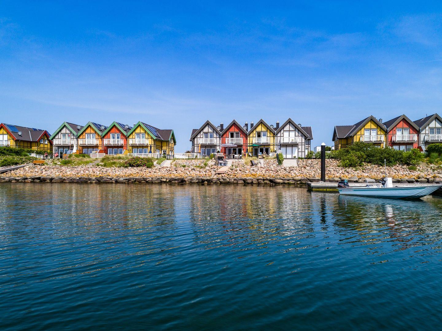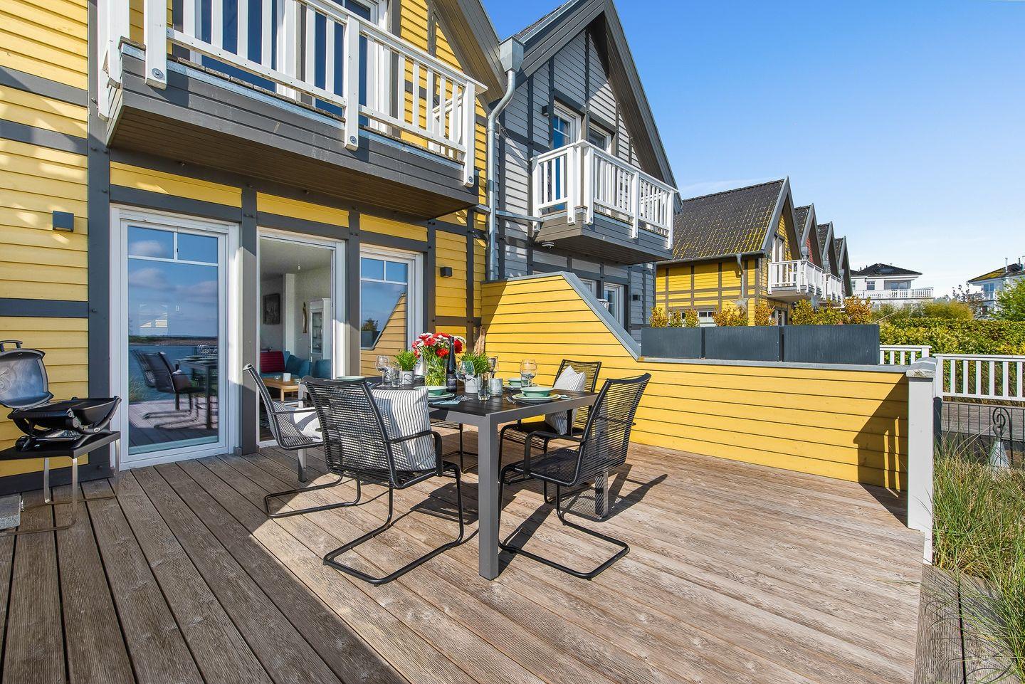 Das Ostsee-Ferienhaus „Emily“ mit der gelben Fassade befindet sich in direkter Lage am Yachthafen und bietet einen angenehmen Aufenthalt. Es ermöglicht einen erholsamen Urlaub.