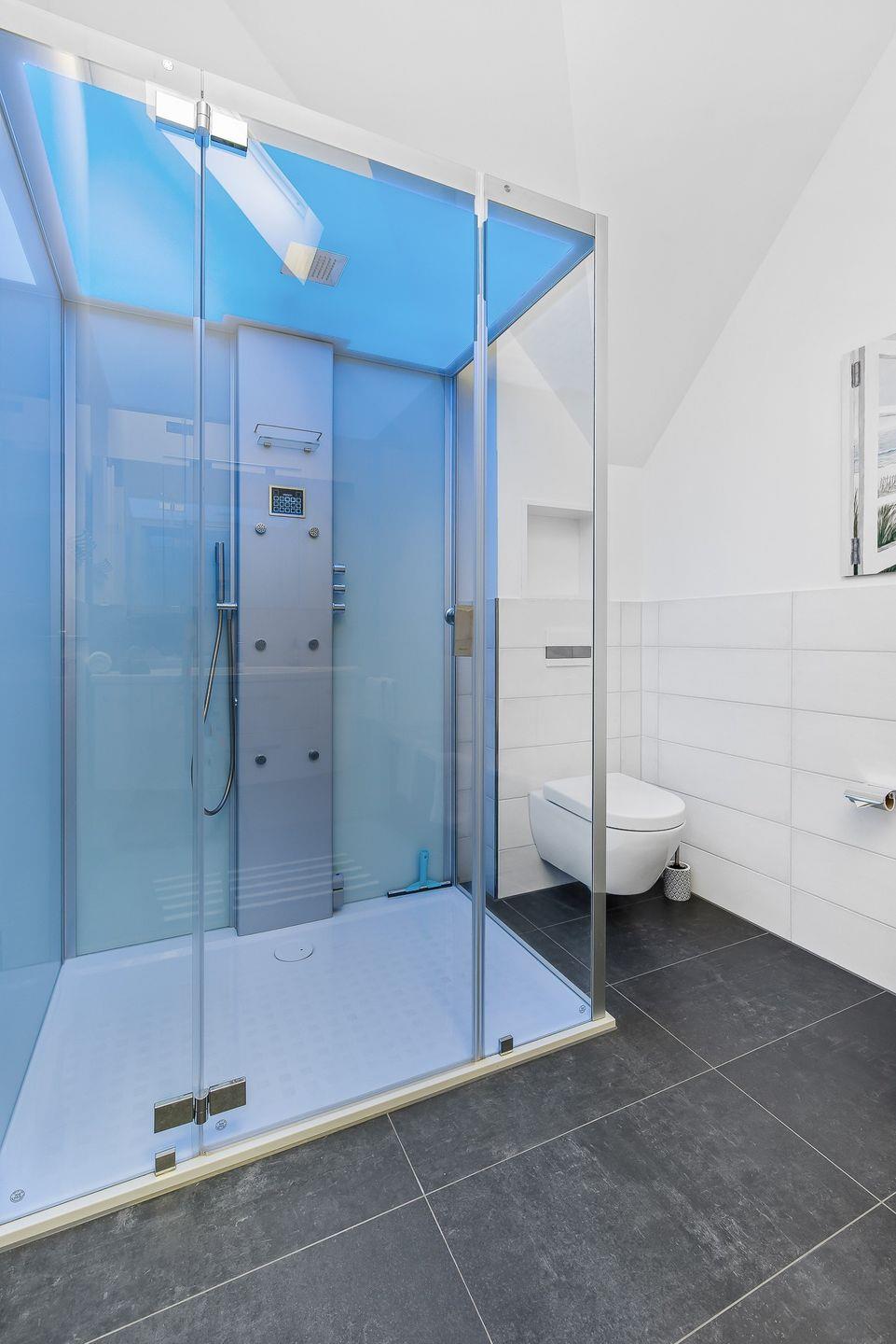 Das große Badezimmer verfügt über eine Dampfsauna von Hoesch mit verschiedenen Wellness-Funktionen. Zusätzlich stehen eine Badewanne und ein Gäste-WC im Erdgeschoss zur Verfügung.