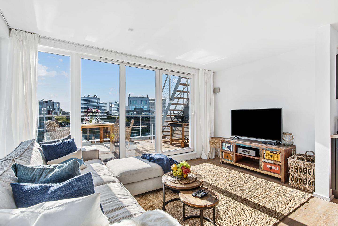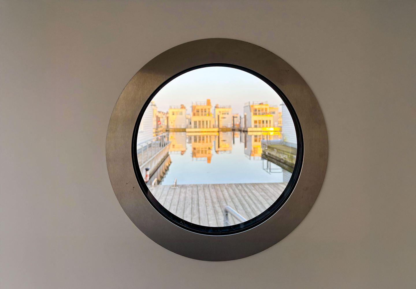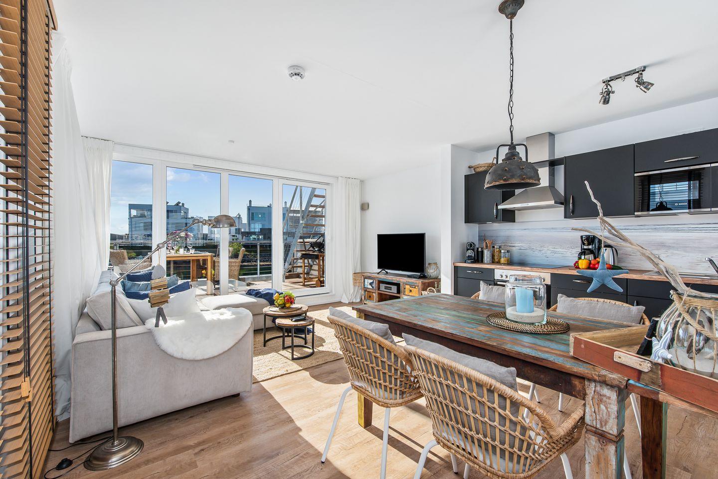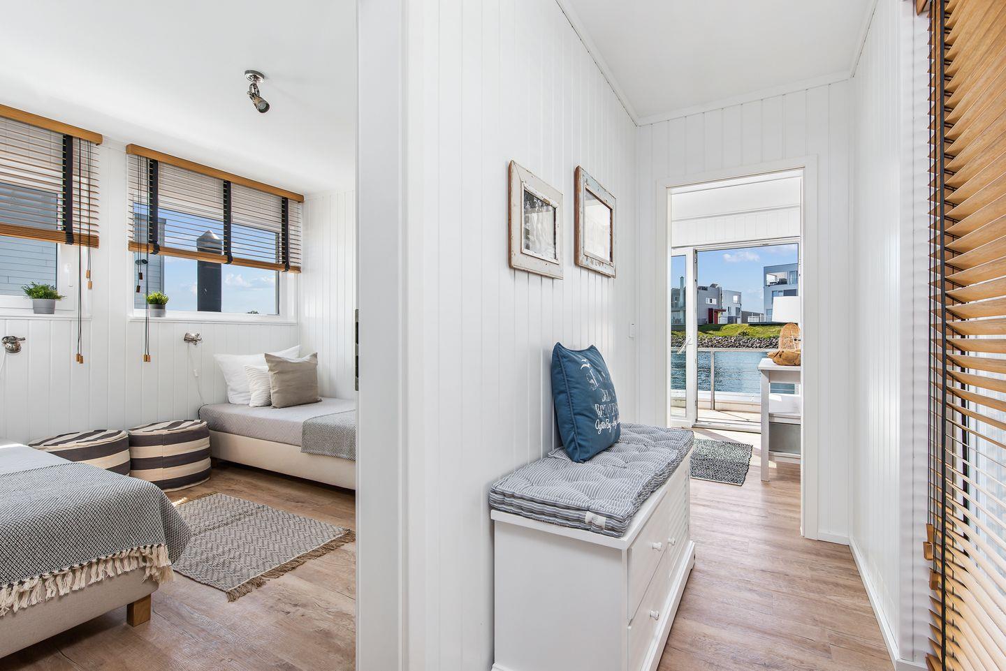 Das schwimmende Ferienhaus "Treibholz" verfügt über 2 Etagen, wobei sich der große Wohn-/Essbereich mit integrierter Küche im Obergeschoss befindet. Die großen Panoramafenster ermöglichen einen wunderbaren Blick auf das Hafenkino und über eine große Schiebetür gelangt man auf die große Terrasse. Das Obergeschoss mit seinem gemütlichen Schlafsofa, dem Esstisch und der gut ausgestatteten Küche lädt zu gemütliche Stunden mit Freunden und der Familie ein.