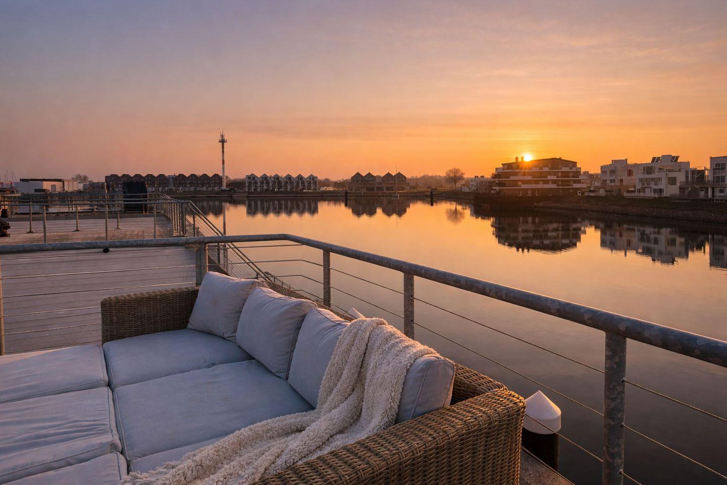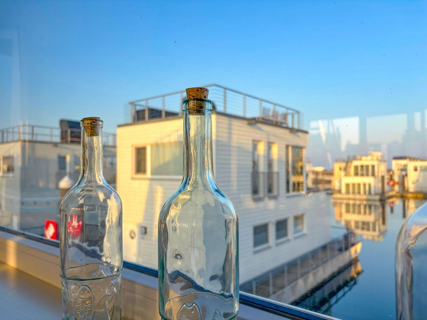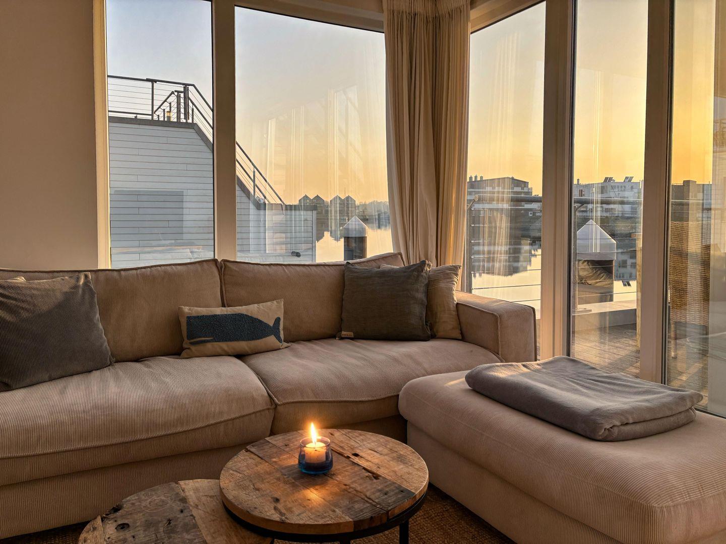 Das schwimmende Ferienhaus "Treibholz" verfügt über 2 Etagen, wobei sich der große Wohn-/Essbereich mit integrierter Küche im Obergeschoss befindet. Die großen Panoramafenster ermöglichen einen wunderbaren Blick auf das Hafenkino und über eine große Schiebetür gelangt man auf die große Terrasse. Das Obergeschoss mit seinem gemütlichen Schlafsofa, dem Esstisch und der gut ausgestatteten Küche lädt zu gemütliche Stunden mit Freunden und der Familie ein.